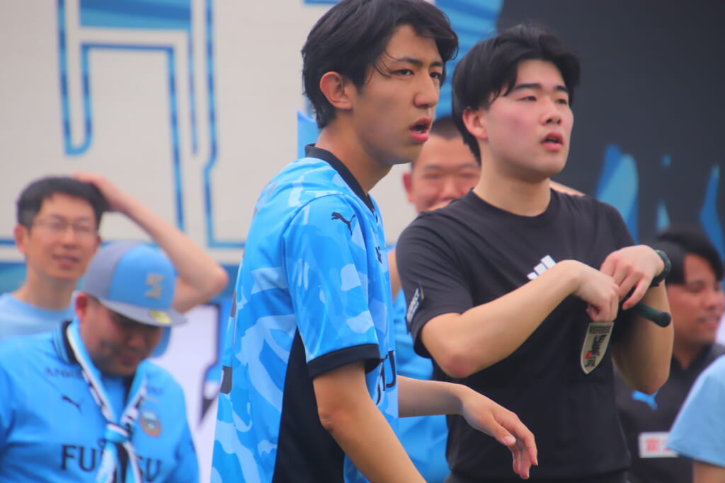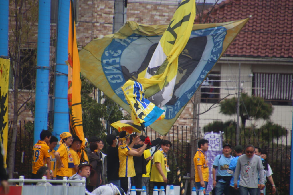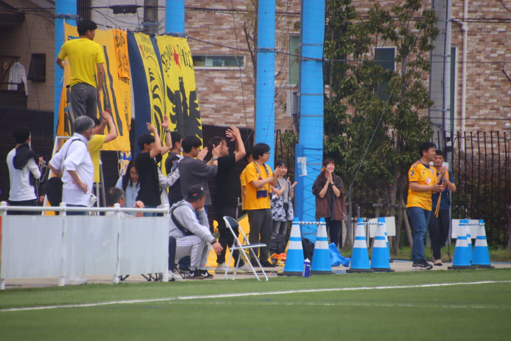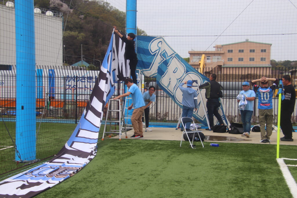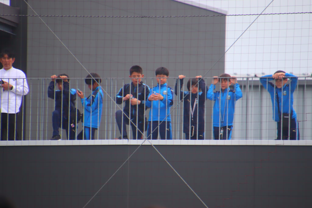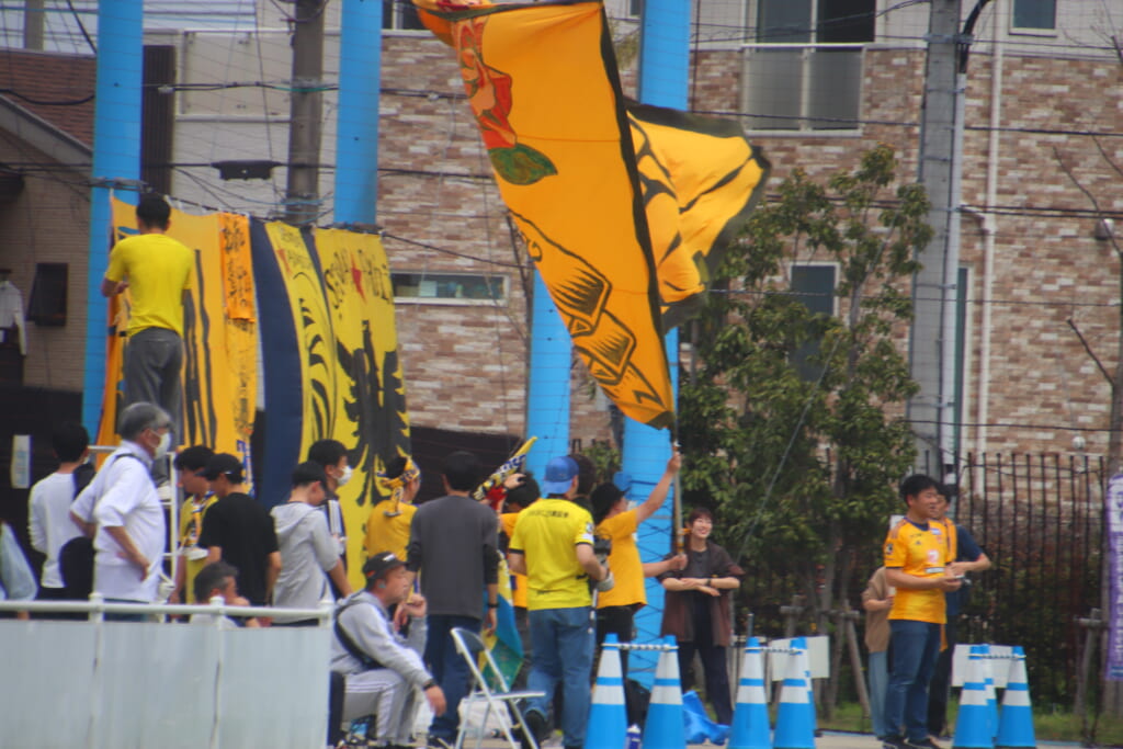 うっすらと雲が広がっているものの、気温が上がり少し汗ばむような気候のAnker フロンタウン生田。両チームの選手の家族らに加え、フロンターレもベガルタも多くのサポーターが集結。フロンターレのサポーターが多くの青い幕を出せば、ベガルタのサポーターも金色の幕を出し、手拍子で選手たちを励ます。