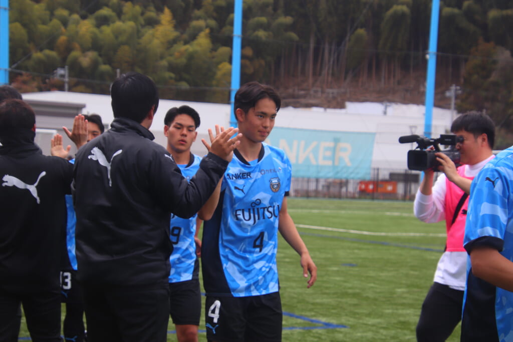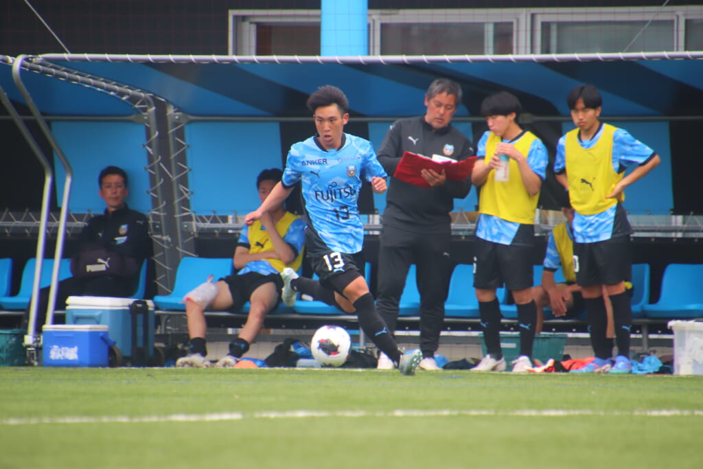 31分、フロンターレは小川翔太に代わり2年生の6小田脩人が右SB、今廣に代わり2年生の20加藤昊がボランチ。三上に代わり2年生の22十河晟央が入り前線。廣瀬は左MFに。
