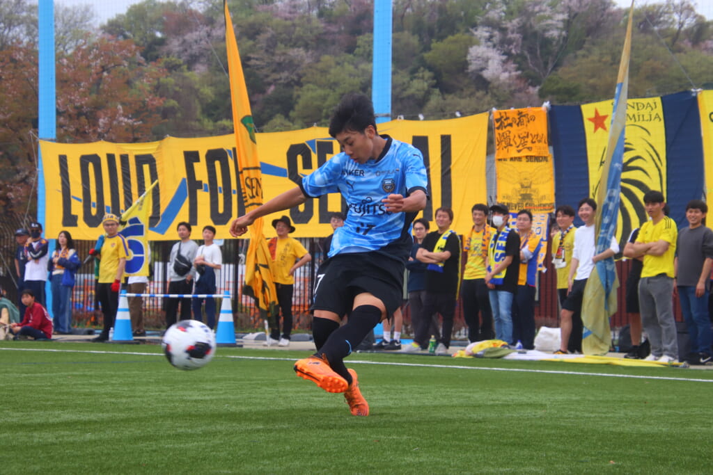 12分には、右サイドでボールをつないでいき、抜け出した小川翔太の折り返しに、川村がエリア右でシュート。しかし、ベガルタのカバーもあり、枠をとらえることはできず。