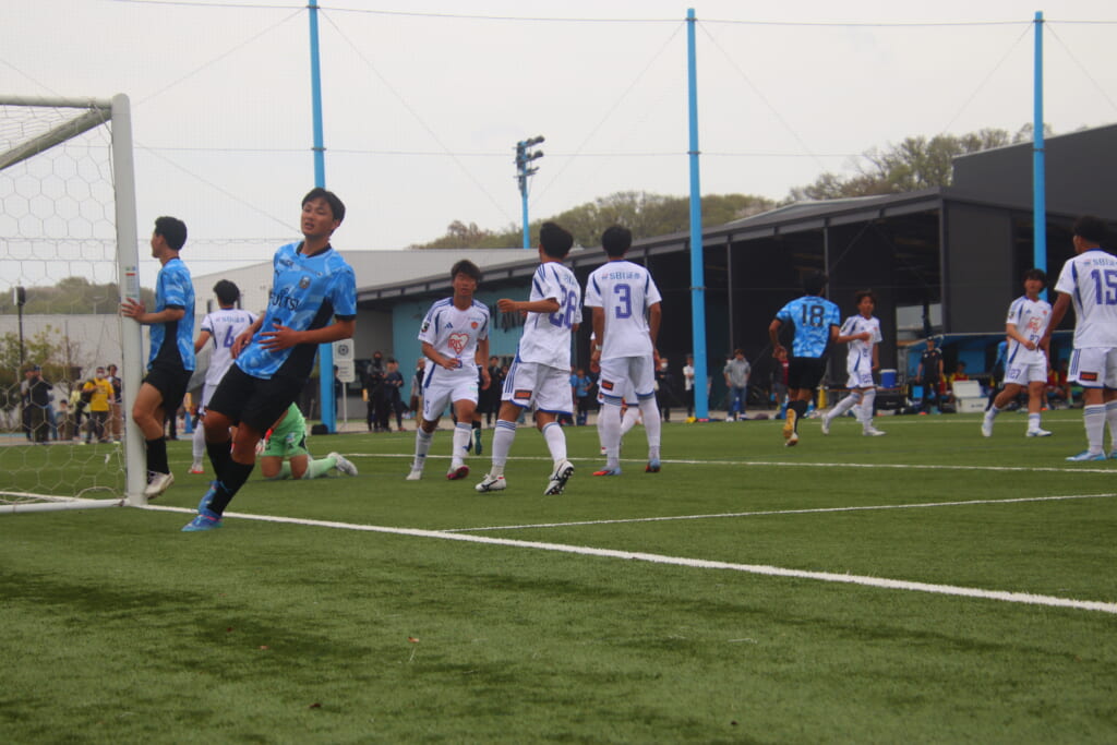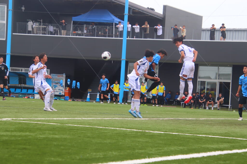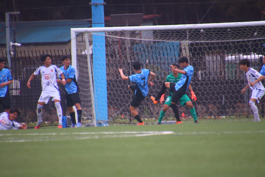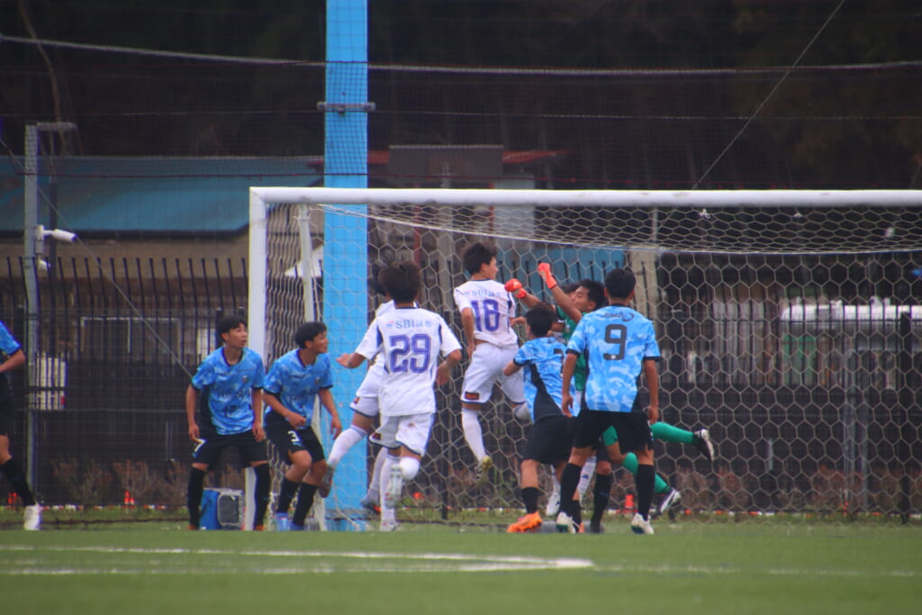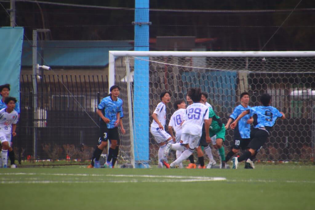 キッカーは三上。右足で入れると、正面に飛び込んだ川村がヘディングシュート。これは左に。