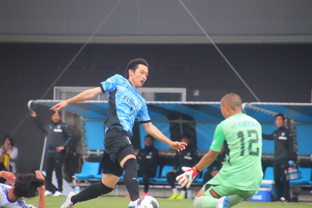 33分には、フロンターレ、藤田のパスに抜け出した長崎がエリア外左へ。長崎が折り返すと、エリア外正面、こぼれ球を拾った小田がミドルシュート。