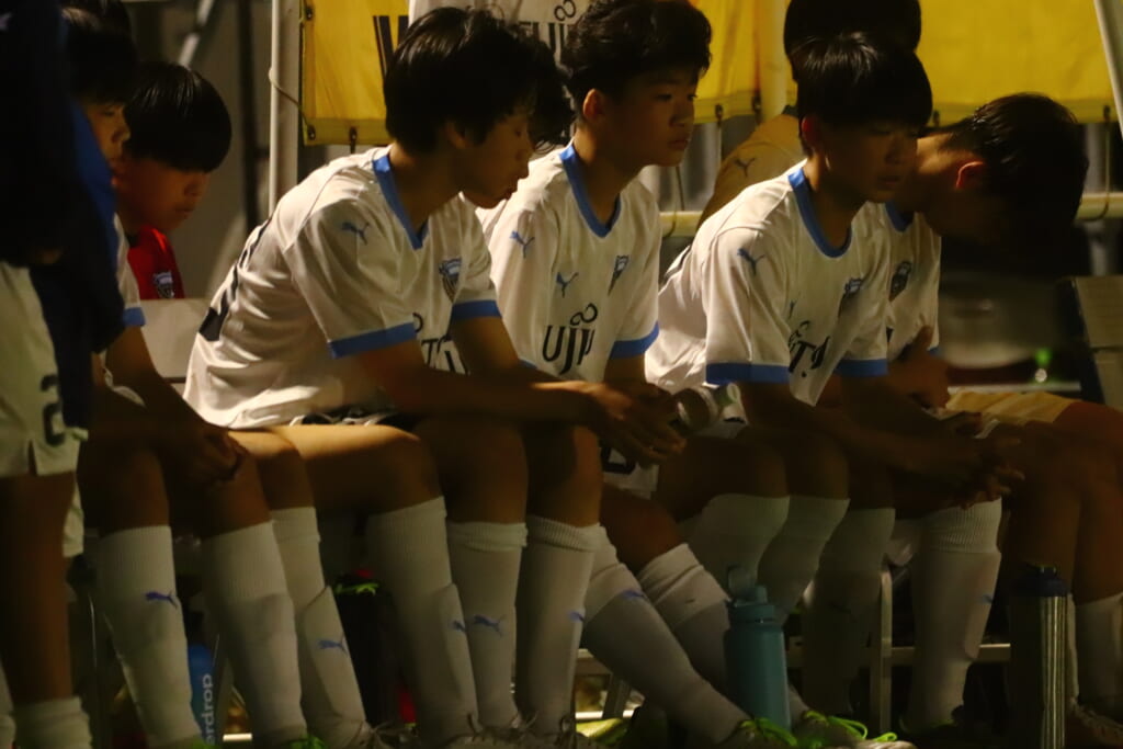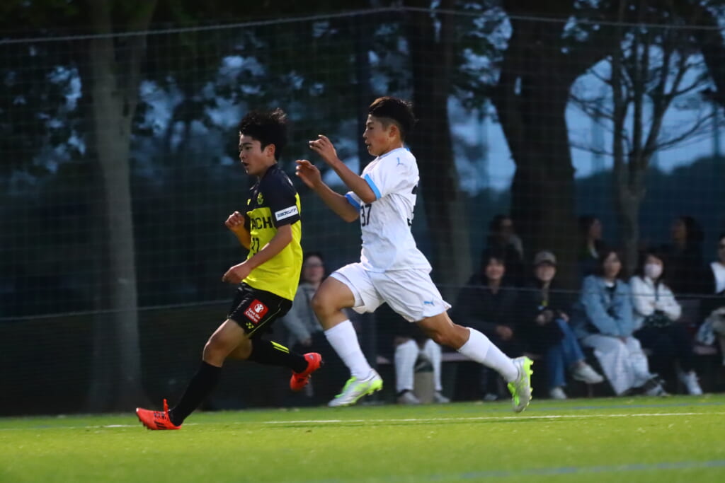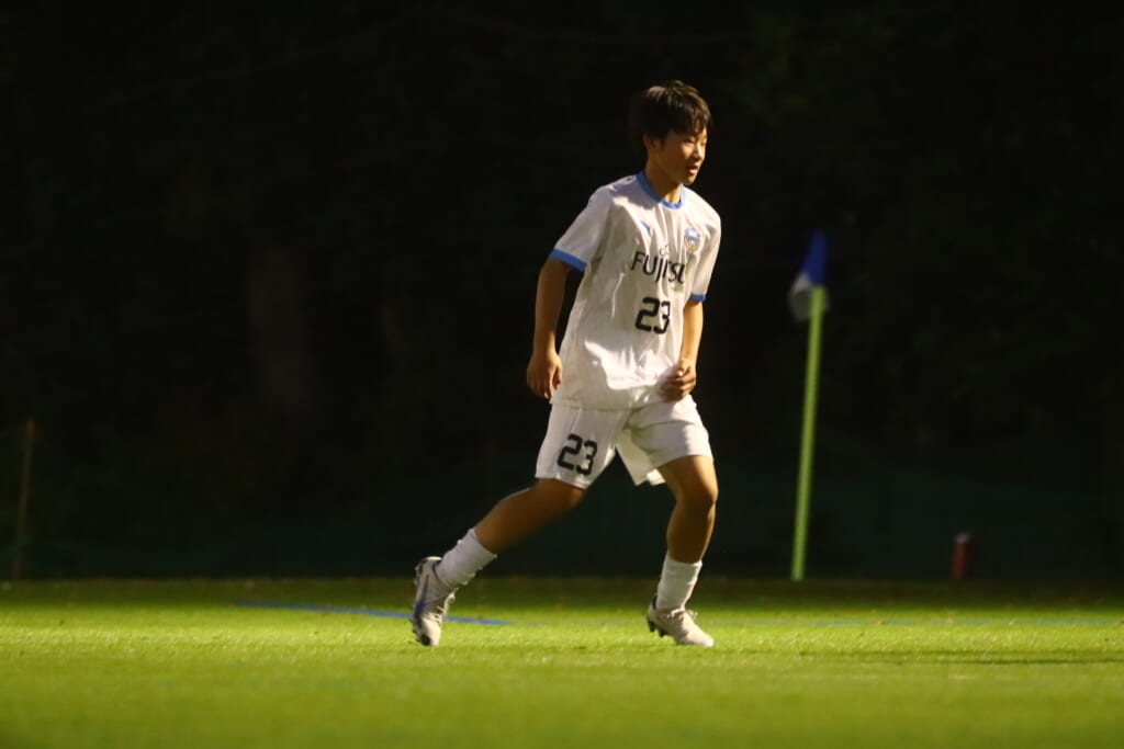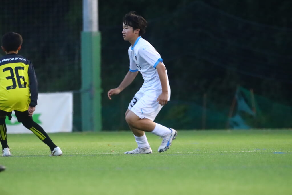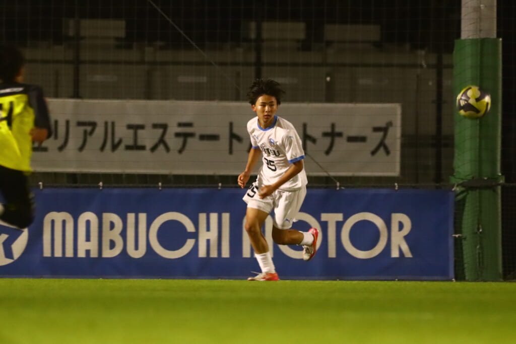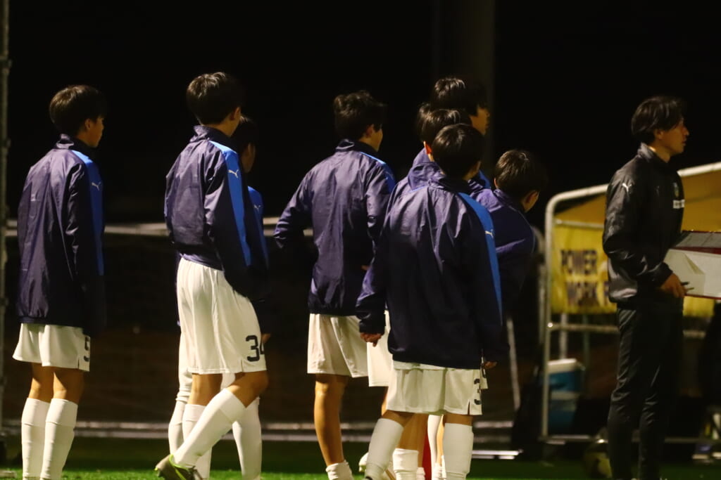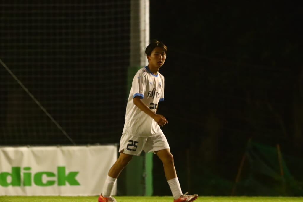 先発は、GK21佐藤惇太、最終ラインは右から38上原快斗、25奥村翔依、35劉明浩、37糸賀亜輝、ボランチは24秋元佑生、27井出翼、右MF36赤井涼南朗、左MFキャプテンの30田中陽生、前線には34浅沼夏都、39水上零仁。