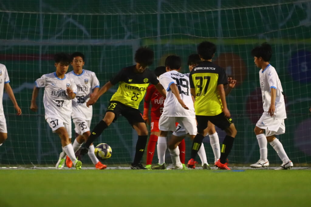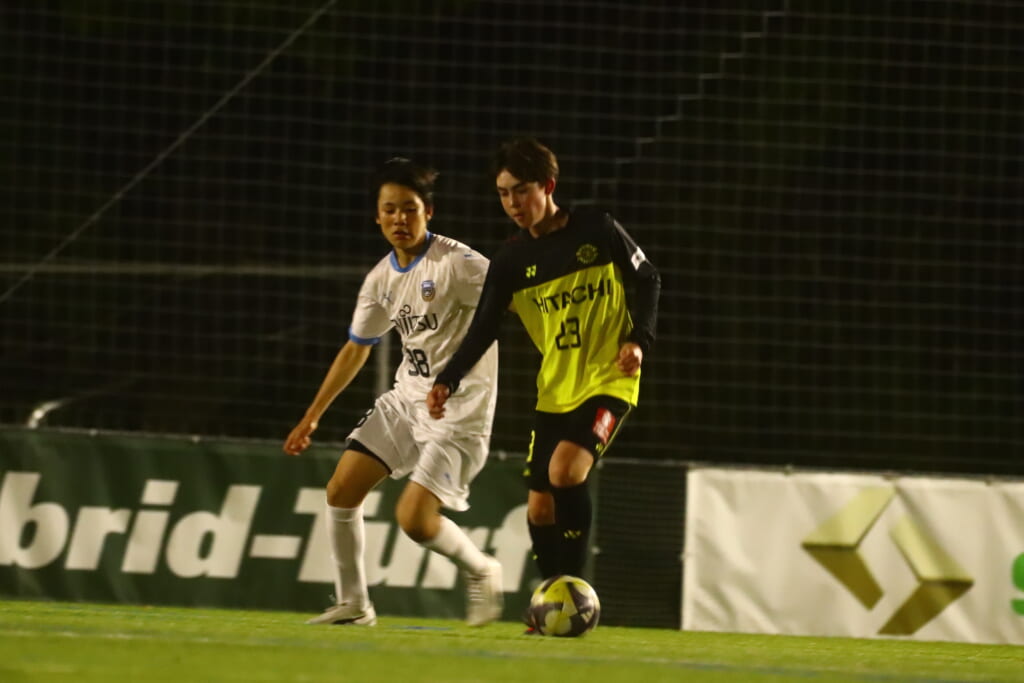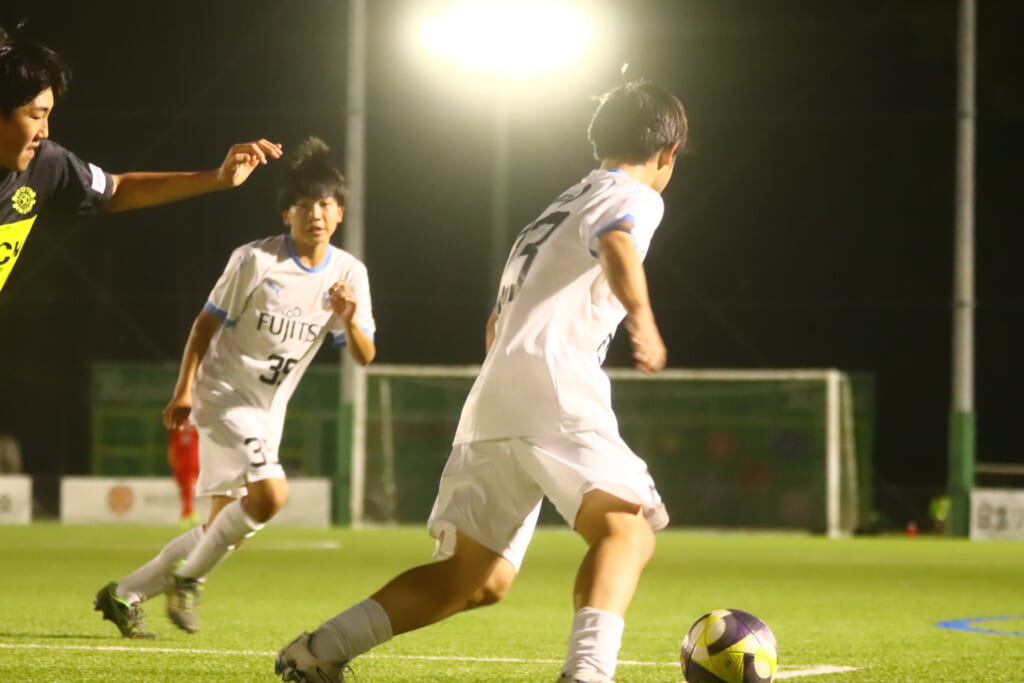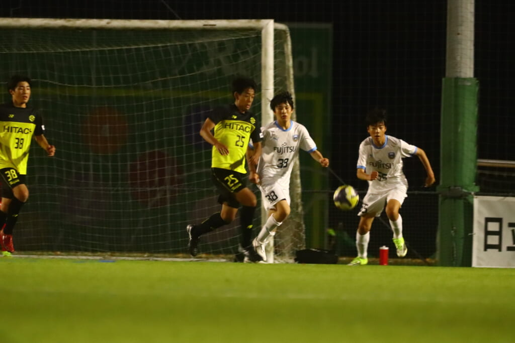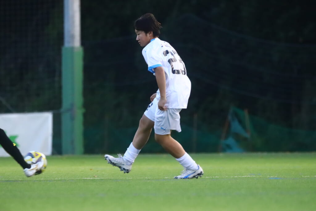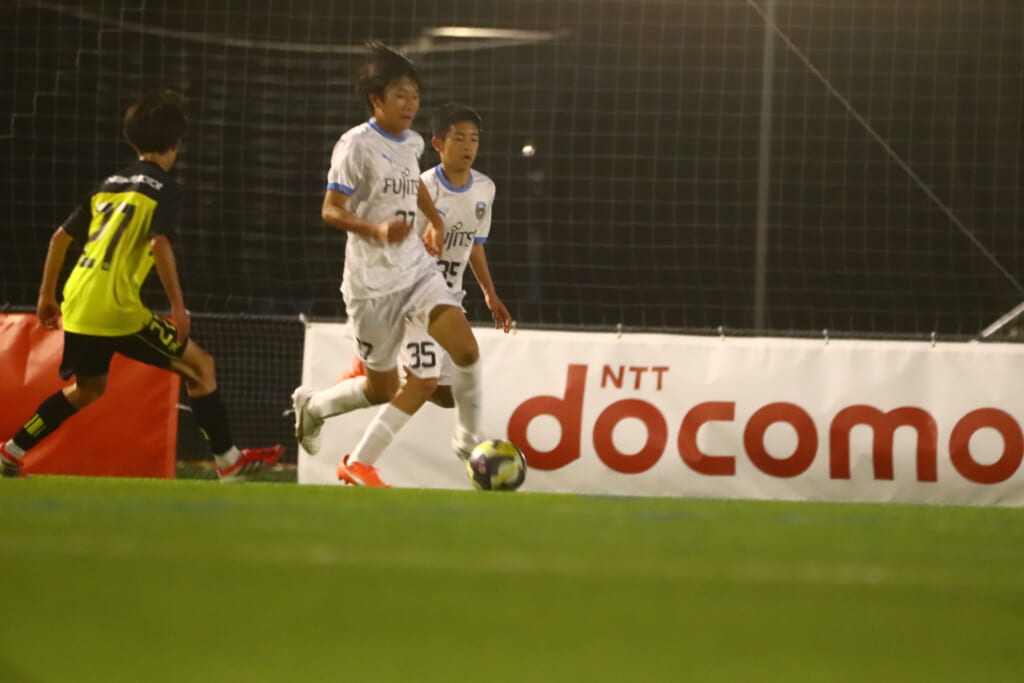 20分には、いったんはフロンターレ生田がボールをものにしたところ、中央でレイソル、秋元がカット。左サイドへ展開すると抜け出した糸賀がクロス。