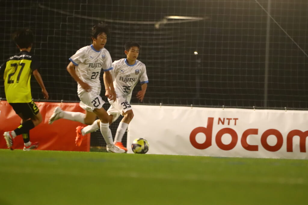 猪又から受けた中森が左サイド、高い位置へ持ち込んでいくフロンターレ生田。