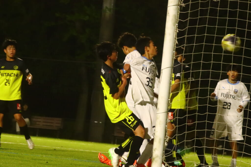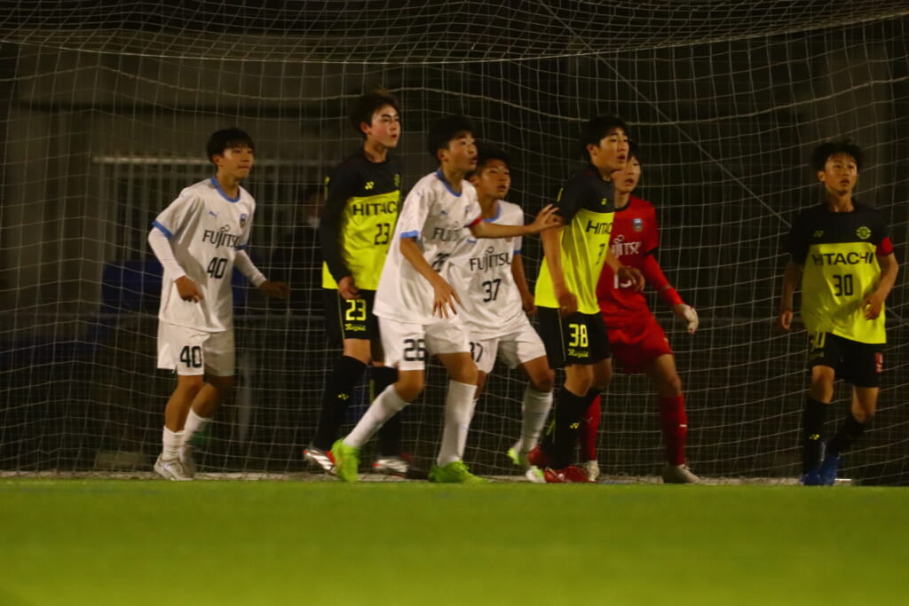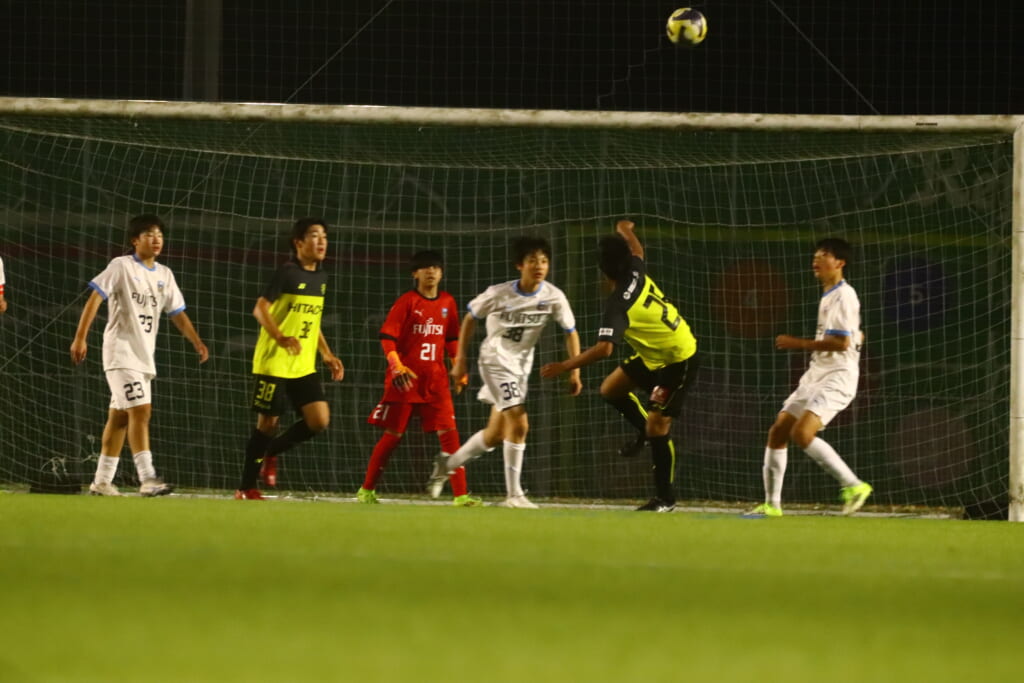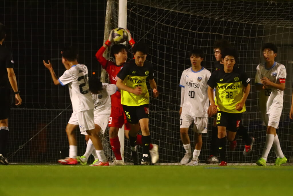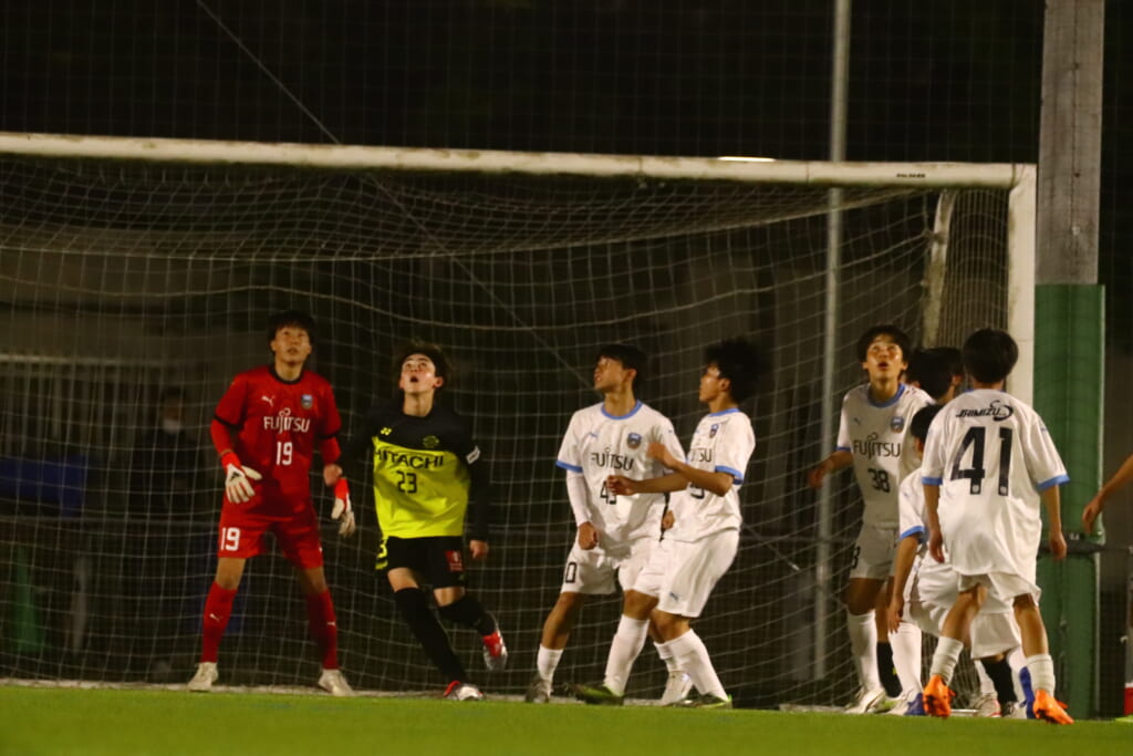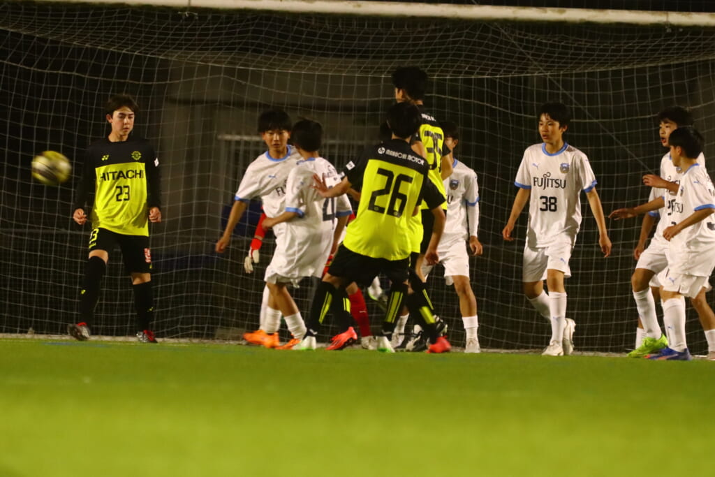 レイソルの左コーナーキックとなり、レイソルはショートコーナーを選択。セカンドボールも拾い、フロンターレ生田のエリア近くでプレーする時間をつくりますが、フロンターレ生田は粘り強くそれをしのいでいきます。