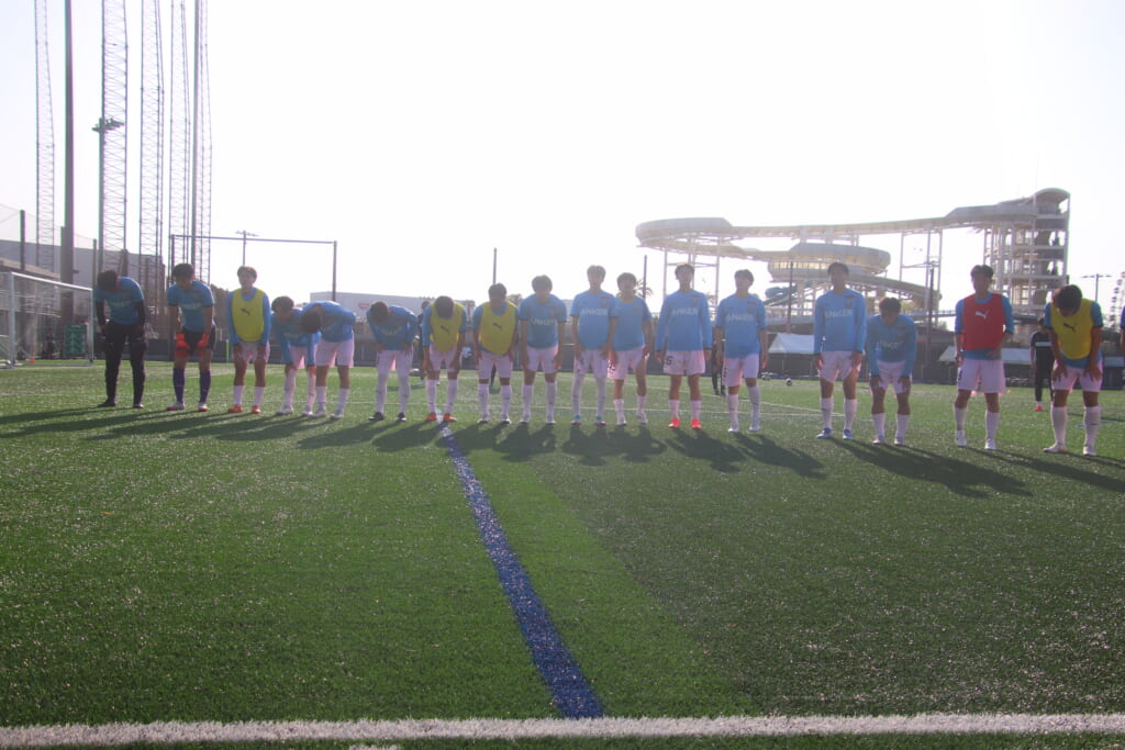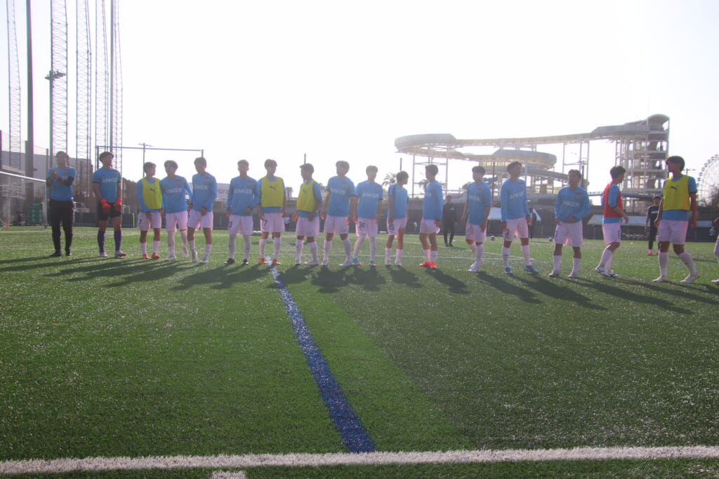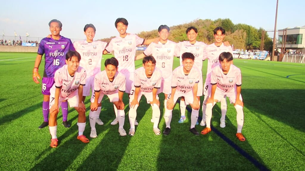 ベガルタ戦と同じ11人が並び、3年生は岡本、小川翔太、藤田、山川、小川尋斗、木下、三上の7人。笹倉、今廣、木村、川村の4人が2年生という構成。