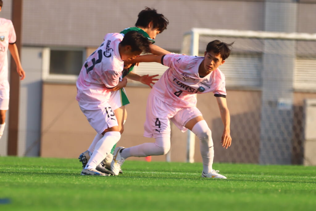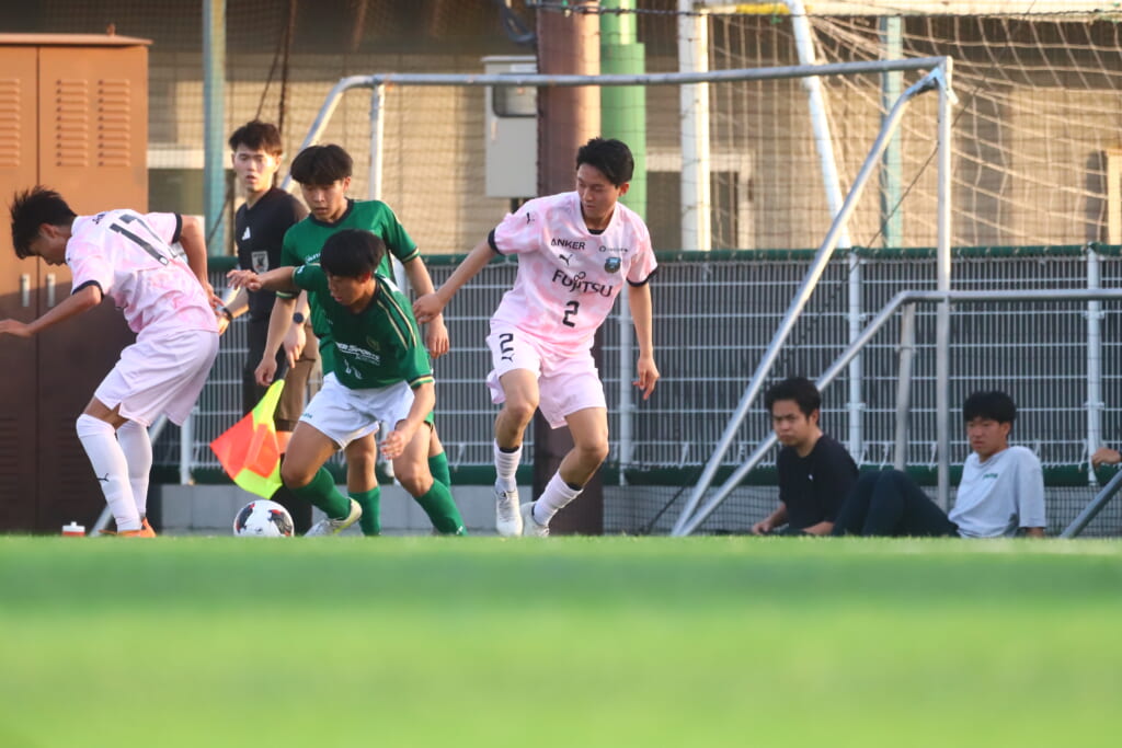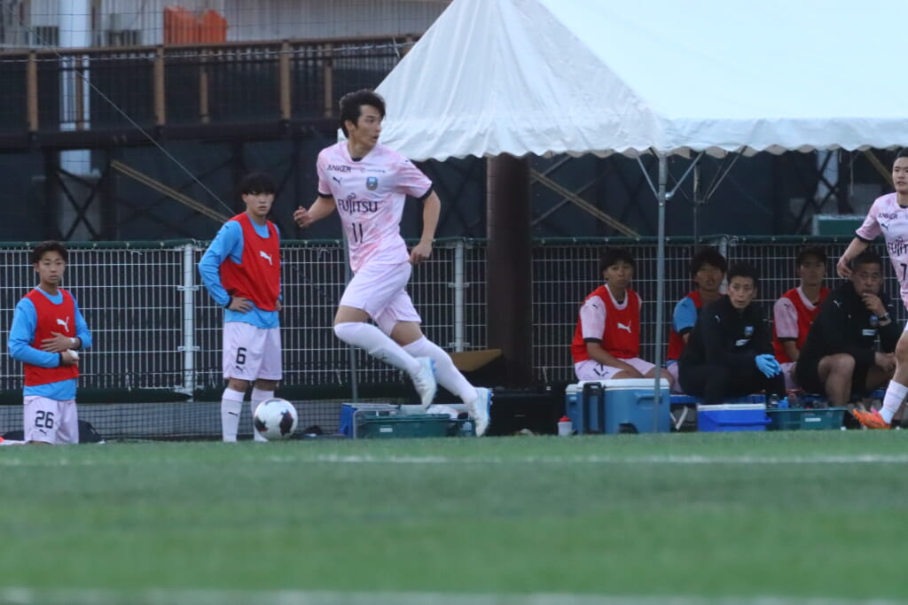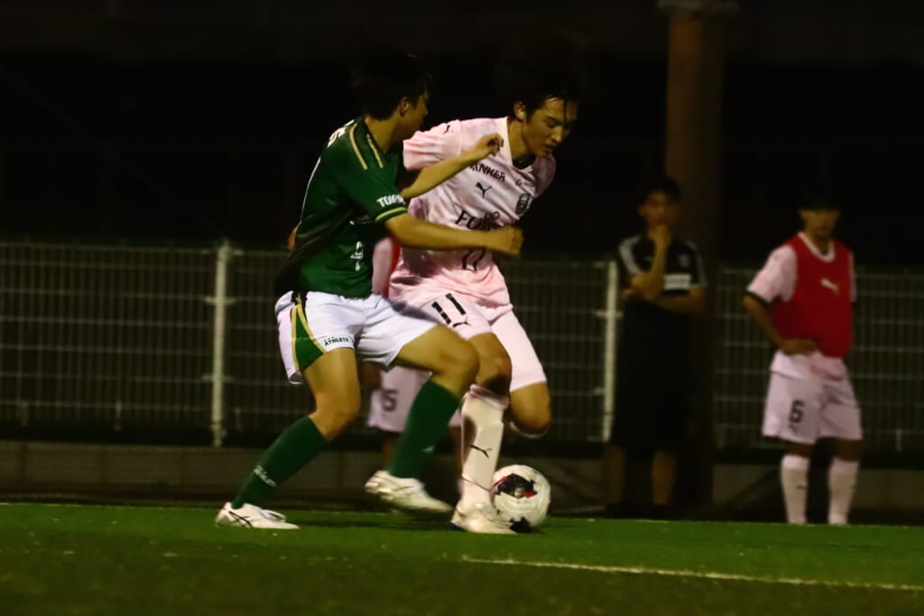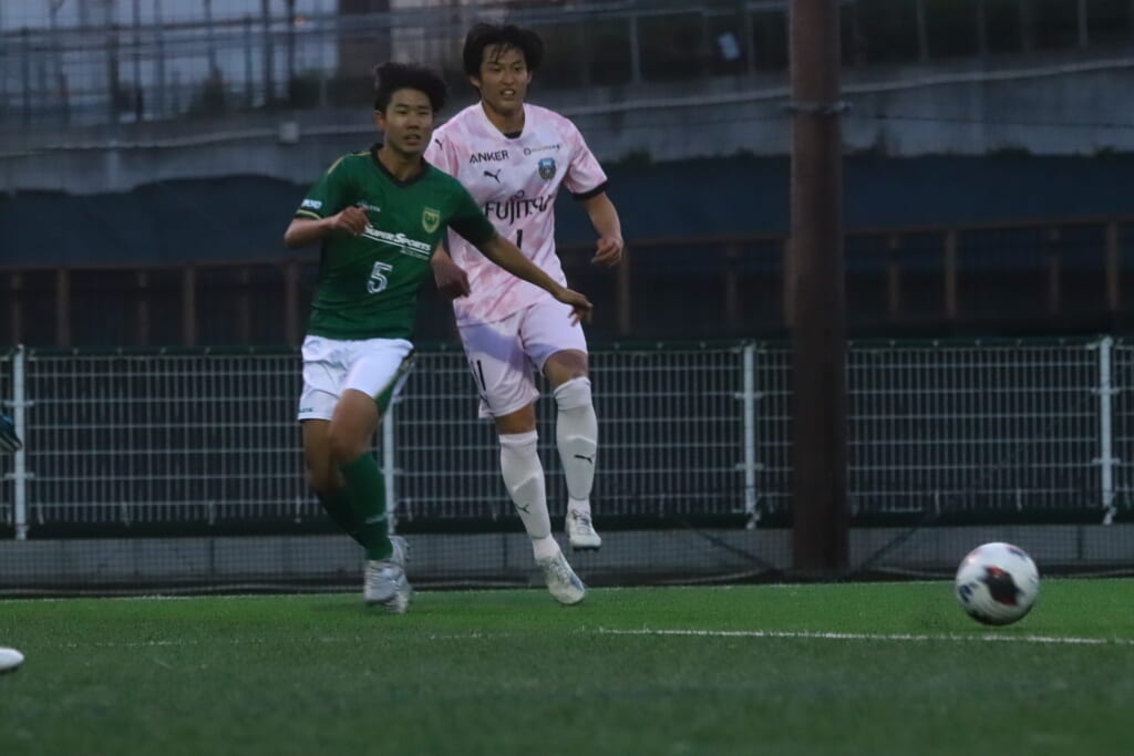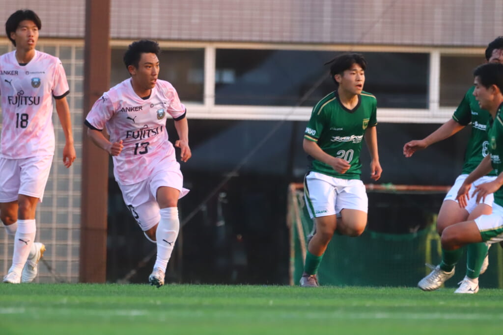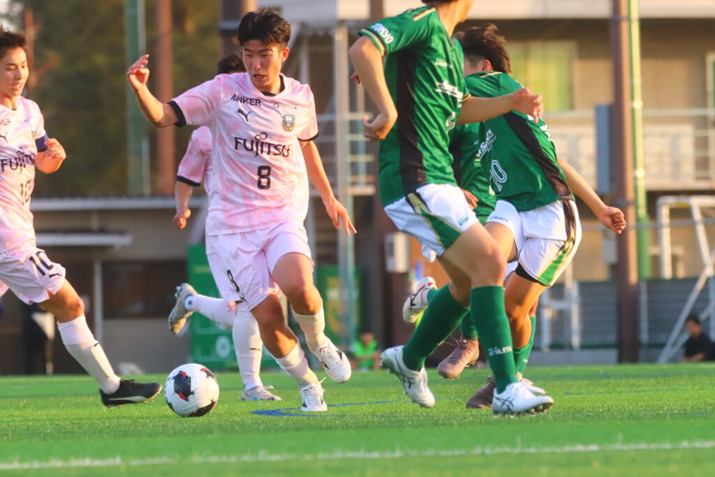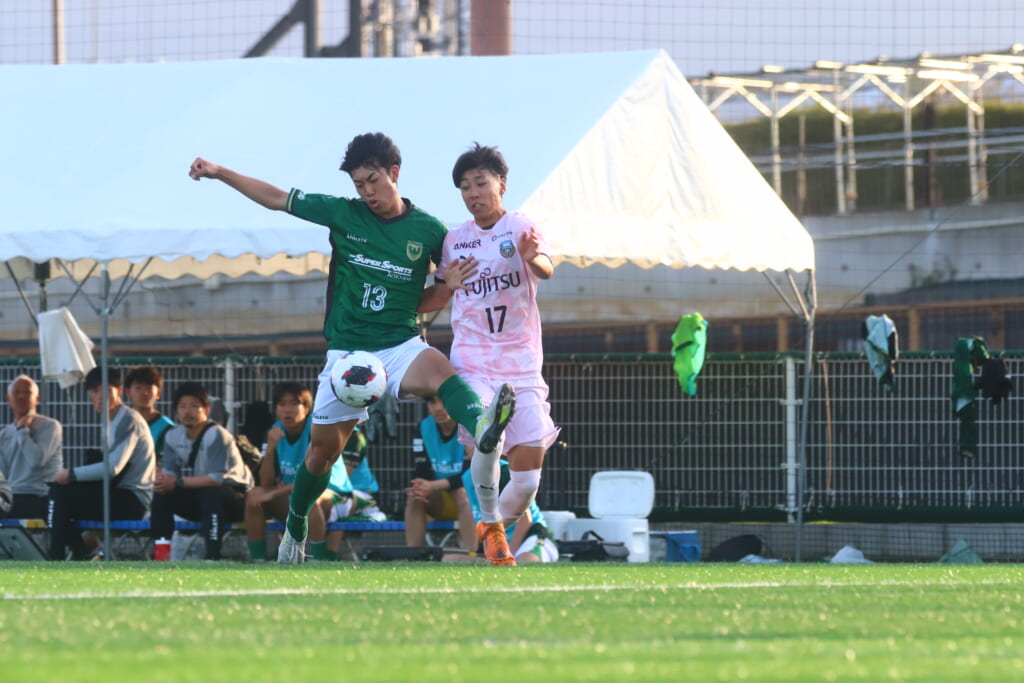 左サイドへ展開し、木下晴天や広瀬、原田がかかわって高い位置でつながり、フロンターレの陣内でプレーする時間をつくっていきますが、フロンターレもコンパクトに粘り強く対応。セカンドボールを拾った小川尋斗が左サイド、高い位置へ。攻撃へ持ち込もうとしていきます。