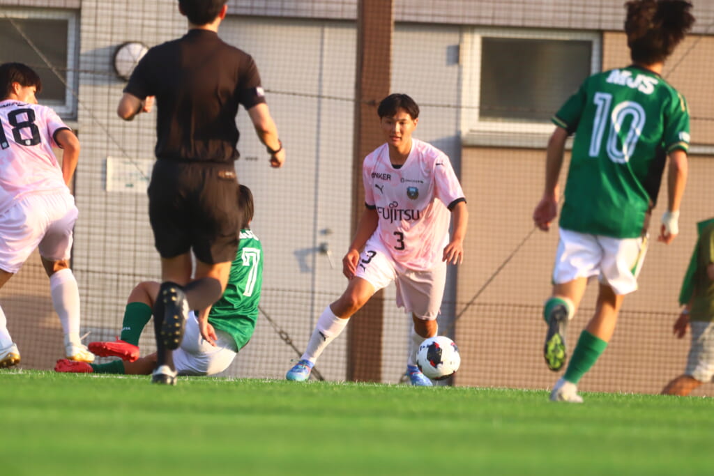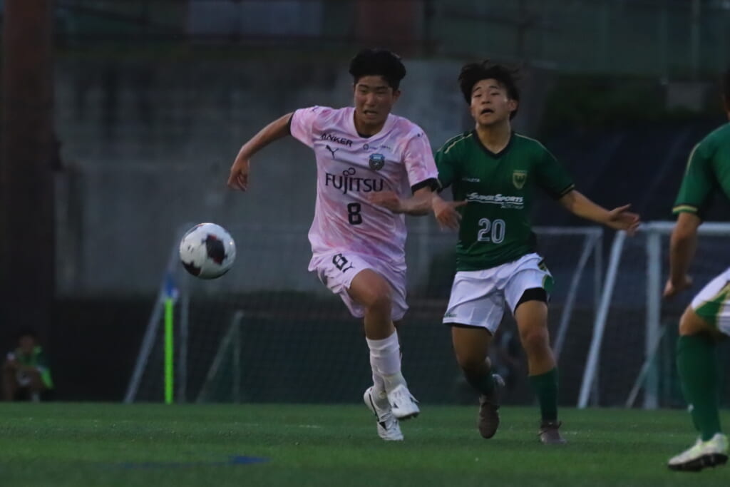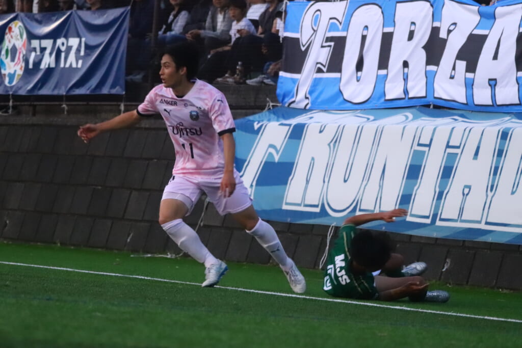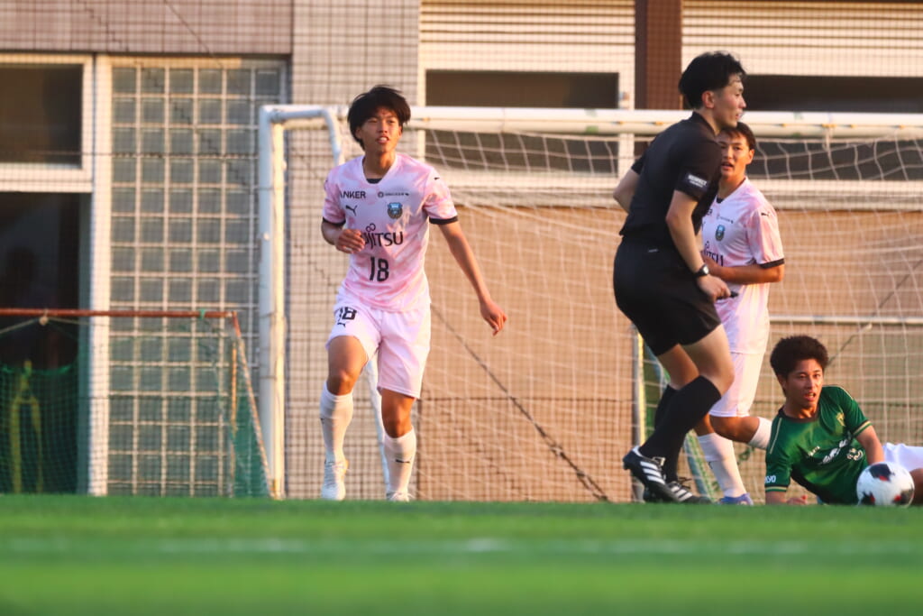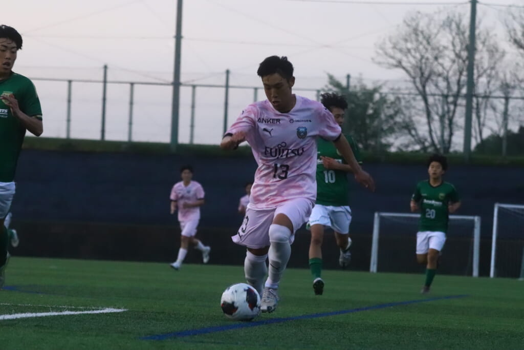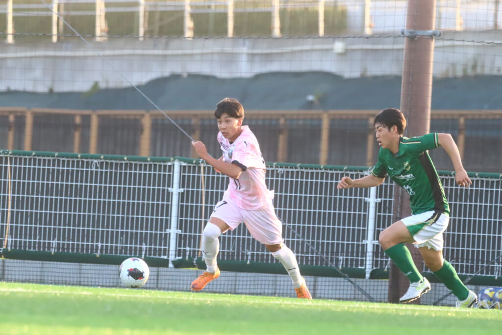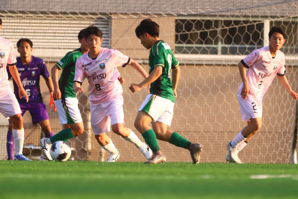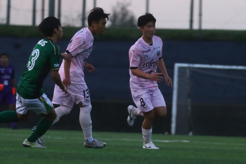 左サイドへ展開し、木下晴天や広瀬、原田がかかわって高い位置でつながり、フロンターレの陣内でプレーする時間をつくっていきますが、フロンターレもコンパクトに粘り強く対応。セカンドボールを拾った小川尋斗が左サイド、高い位置へ。攻撃へ持ち込もうとしていきます。