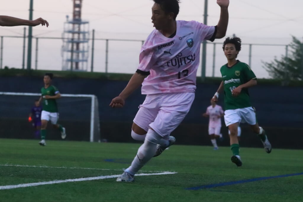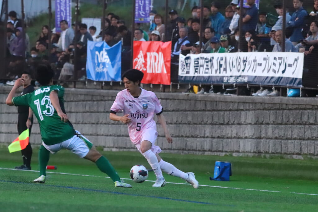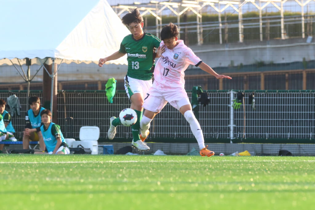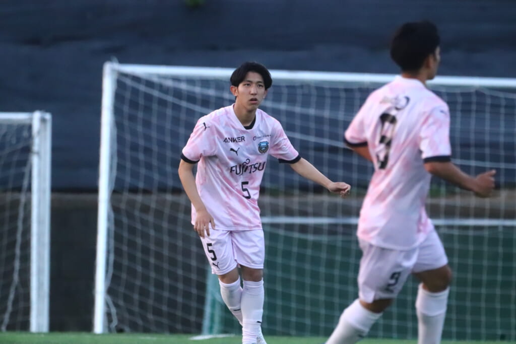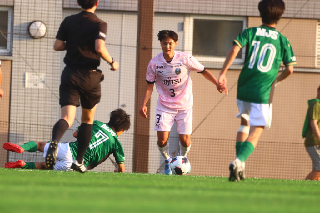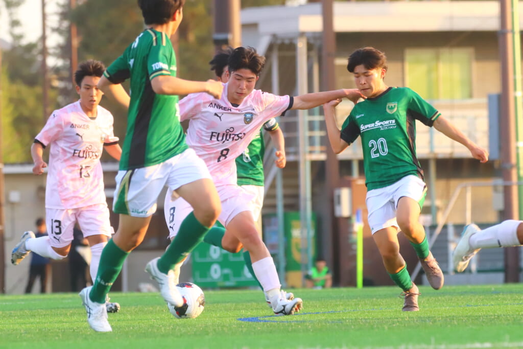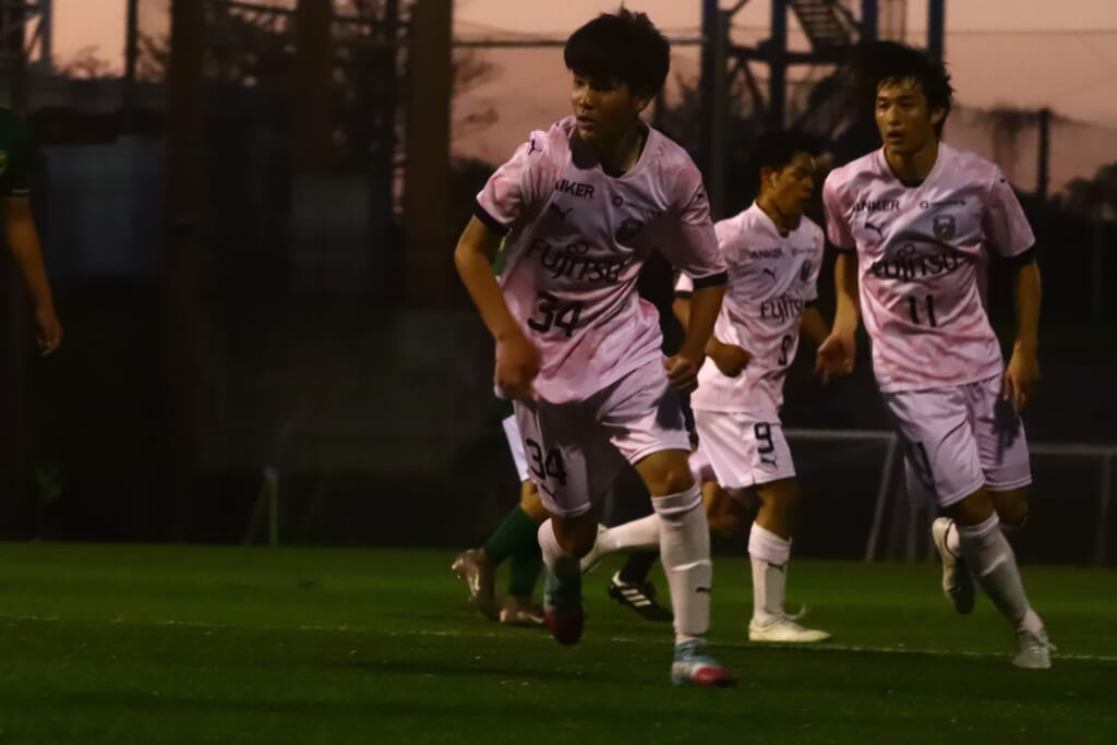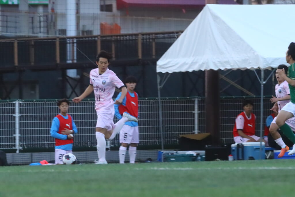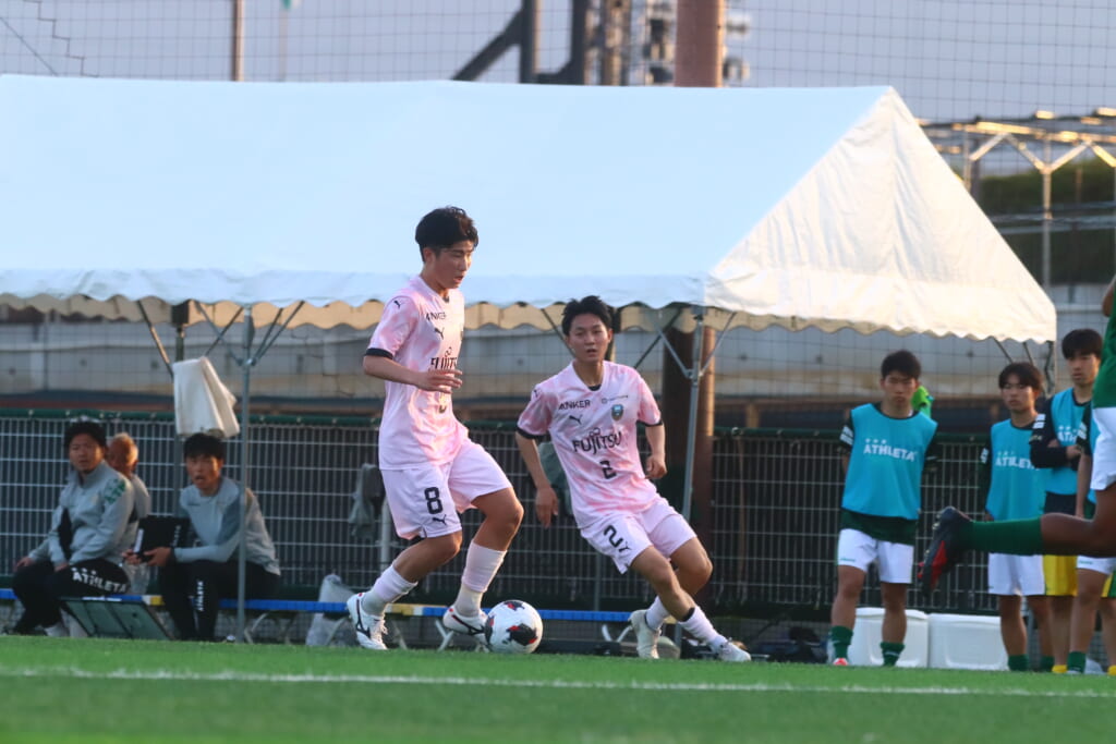 左サイドへ展開し、木下晴天や広瀬、原田がかかわって高い位置でつながり、フロンターレの陣内でプレーする時間をつくっていきますが、フロンターレもコンパクトに粘り強く対応。セカンドボールを拾った小川尋斗が左サイド、高い位置へ。攻撃へ持ち込もうとしていきます。