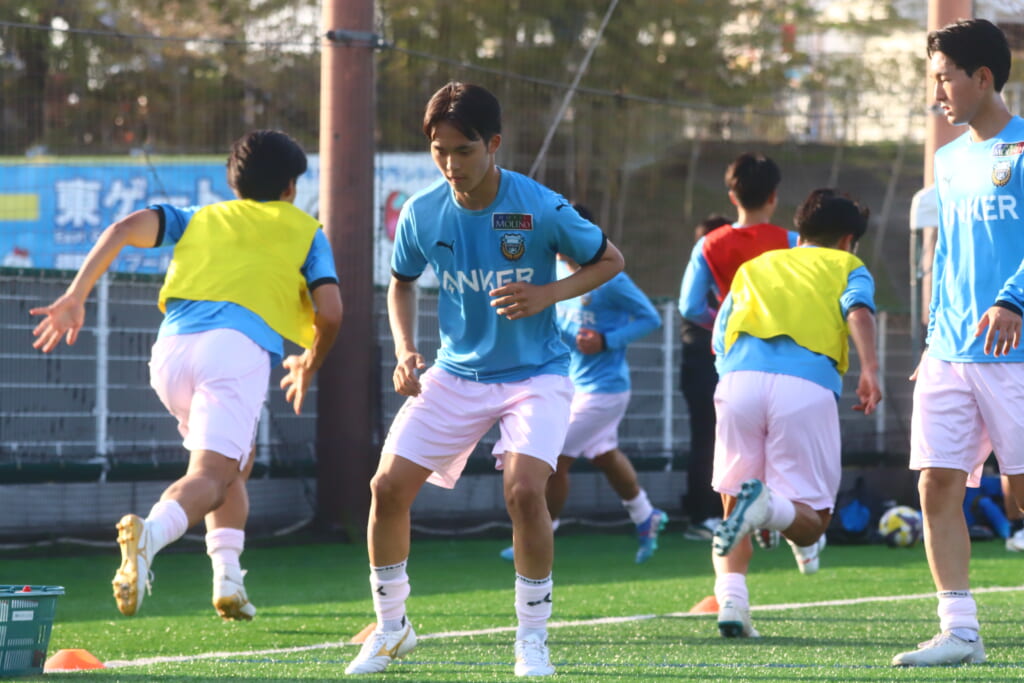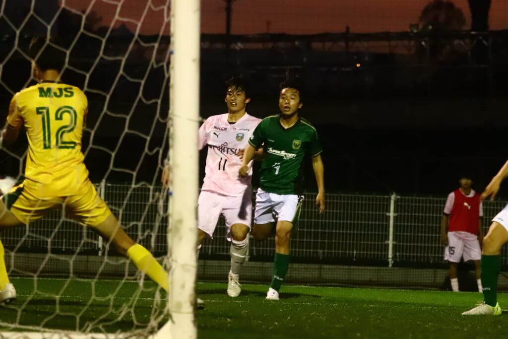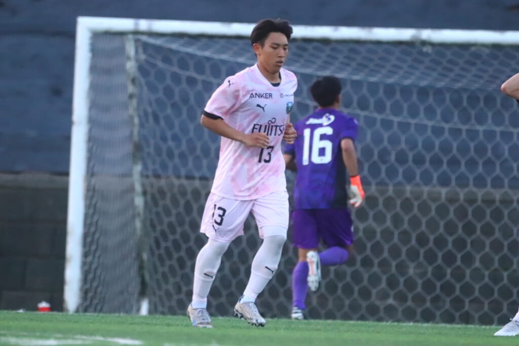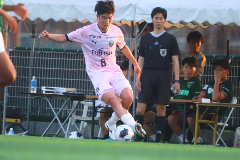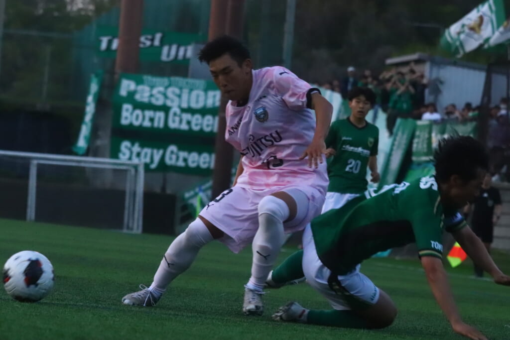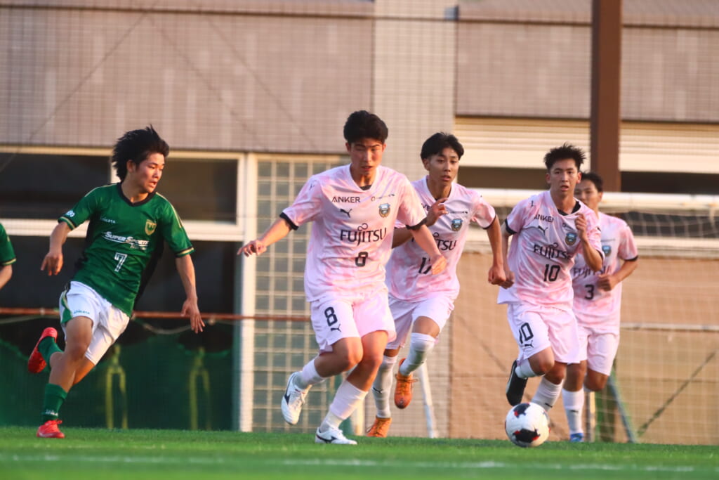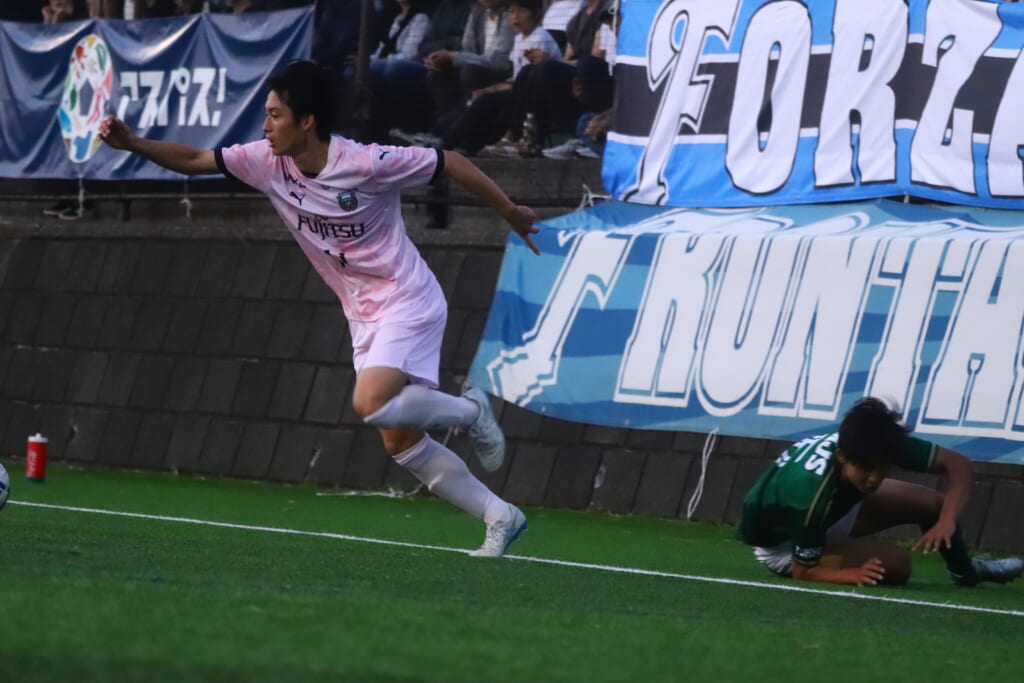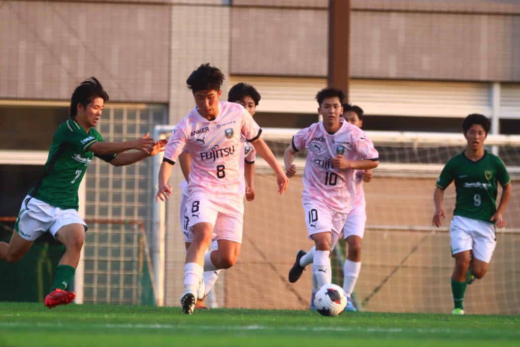 左サイドへ展開し、木下晴天や広瀬、原田がかかわって高い位置でつながり、フロンターレの陣内でプレーする時間をつくっていきますが、フロンターレもコンパクトに粘り強く対応。セカンドボールを拾った小川尋斗が左サイド、高い位置へ。攻撃へ持ち込もうとしていきます。
