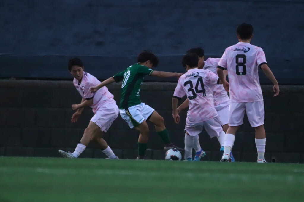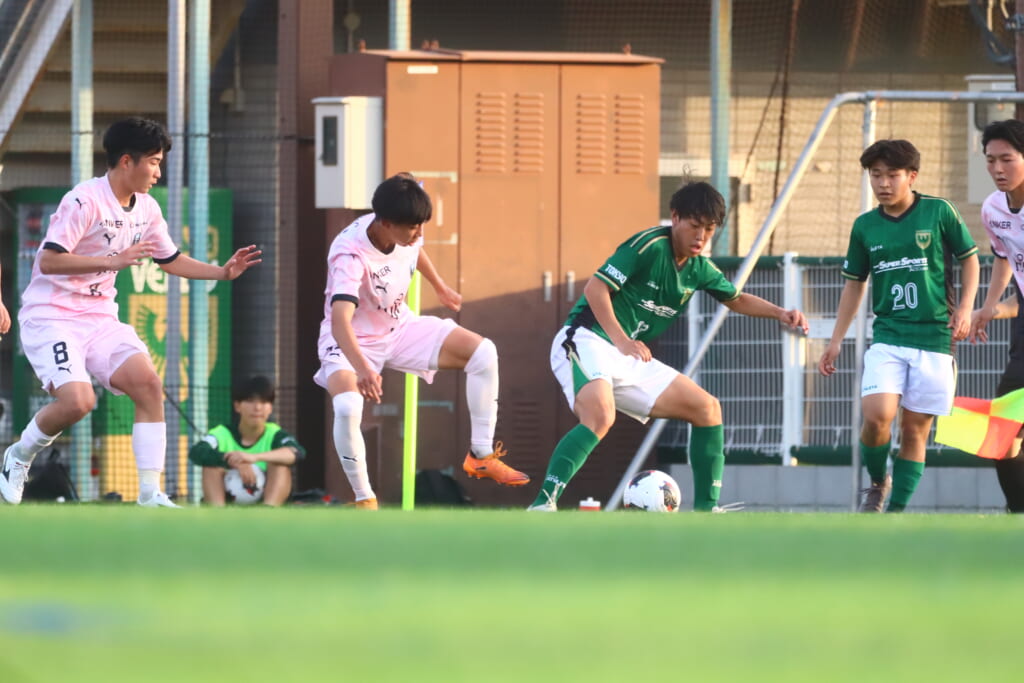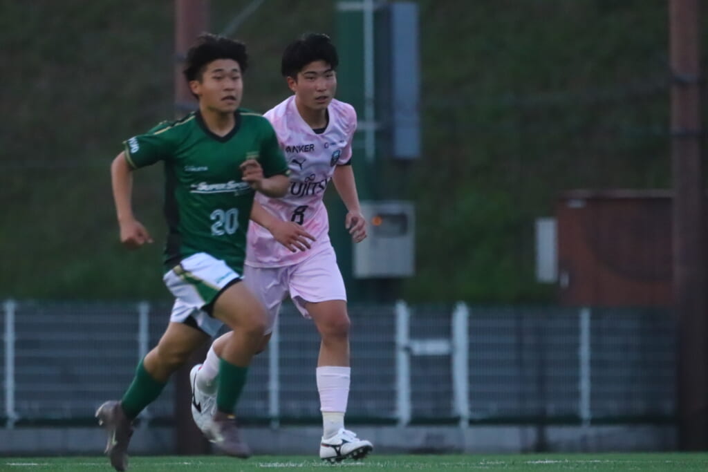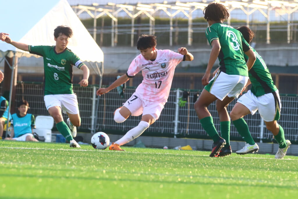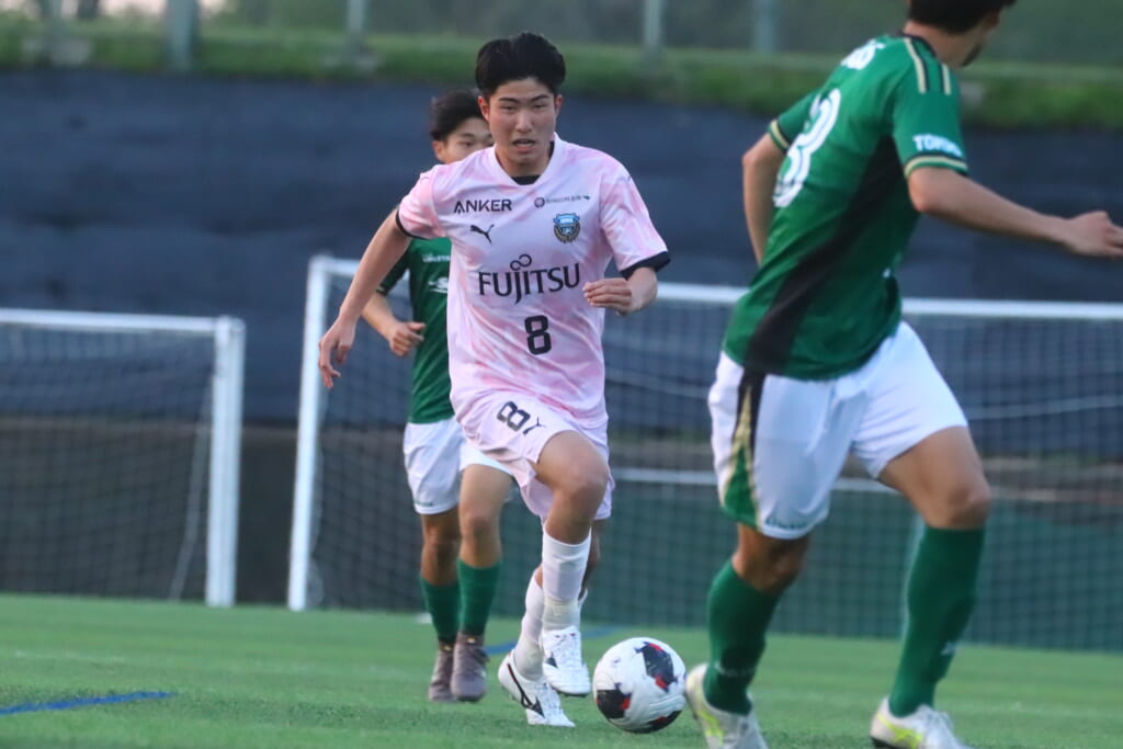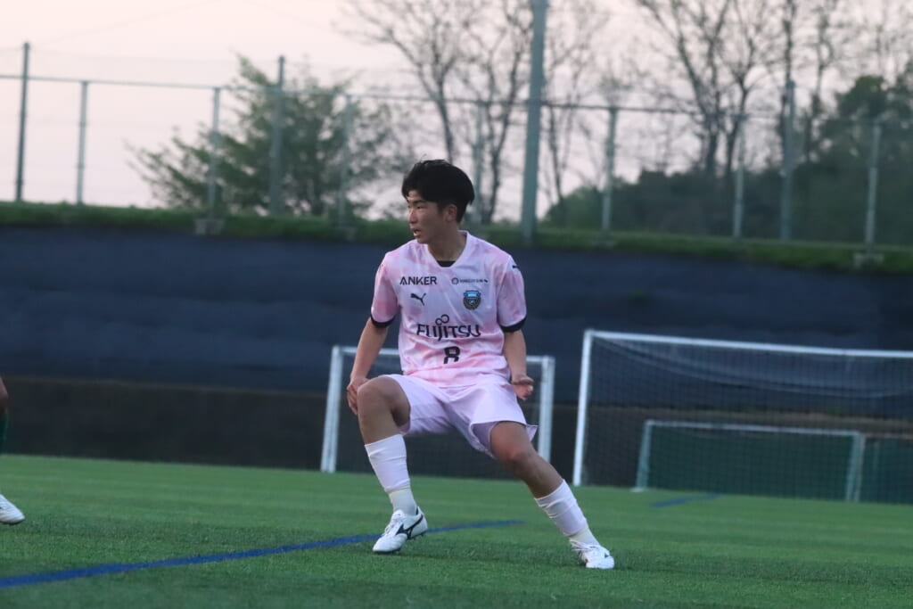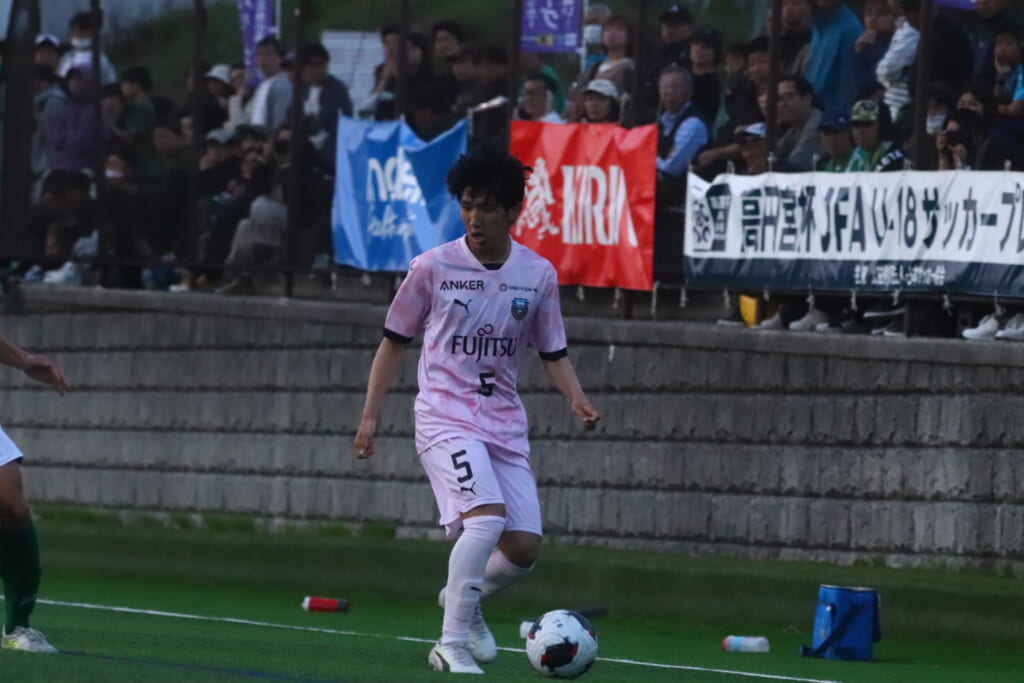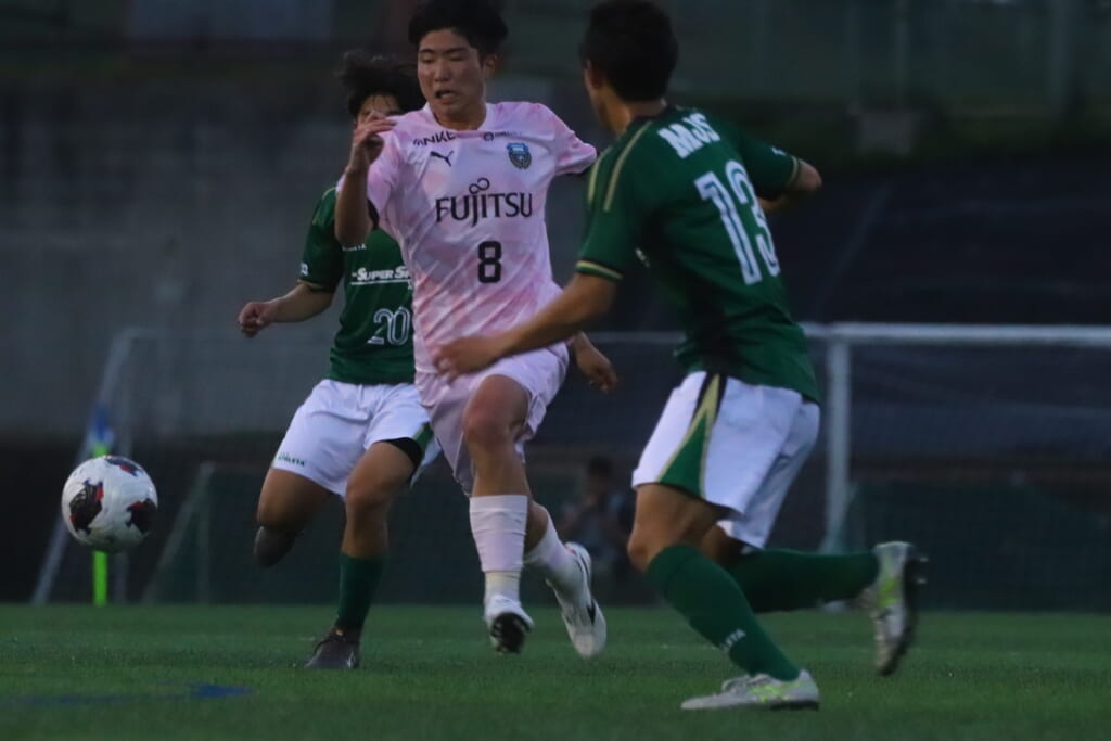 左サイドへ展開し、木下晴天や広瀬、原田がかかわって高い位置でつながり、フロンターレの陣内でプレーする時間をつくっていきますが、フロンターレもコンパクトに粘り強く対応。セカンドボールを拾った小川尋斗が左サイド、高い位置へ。攻撃へ持ち込もうとしていきます。