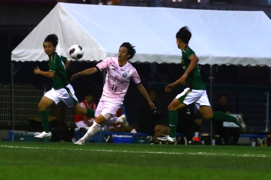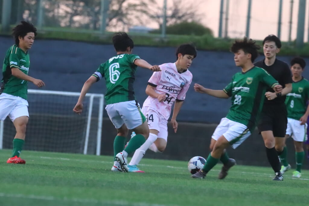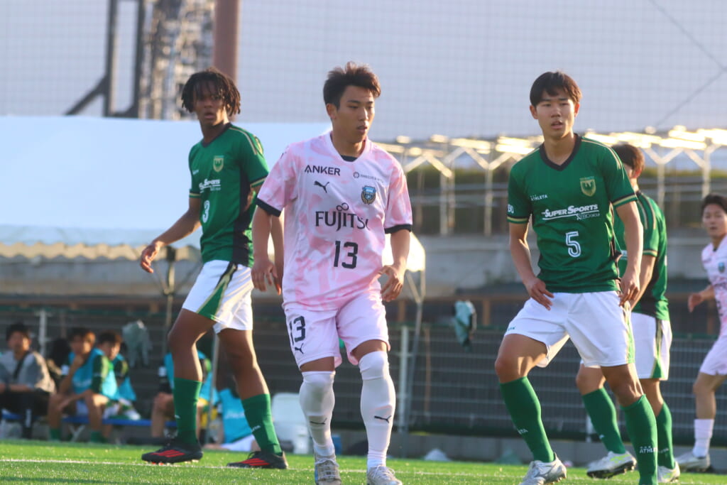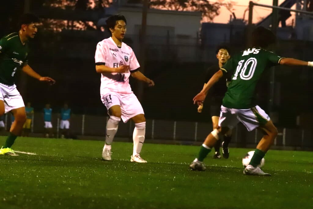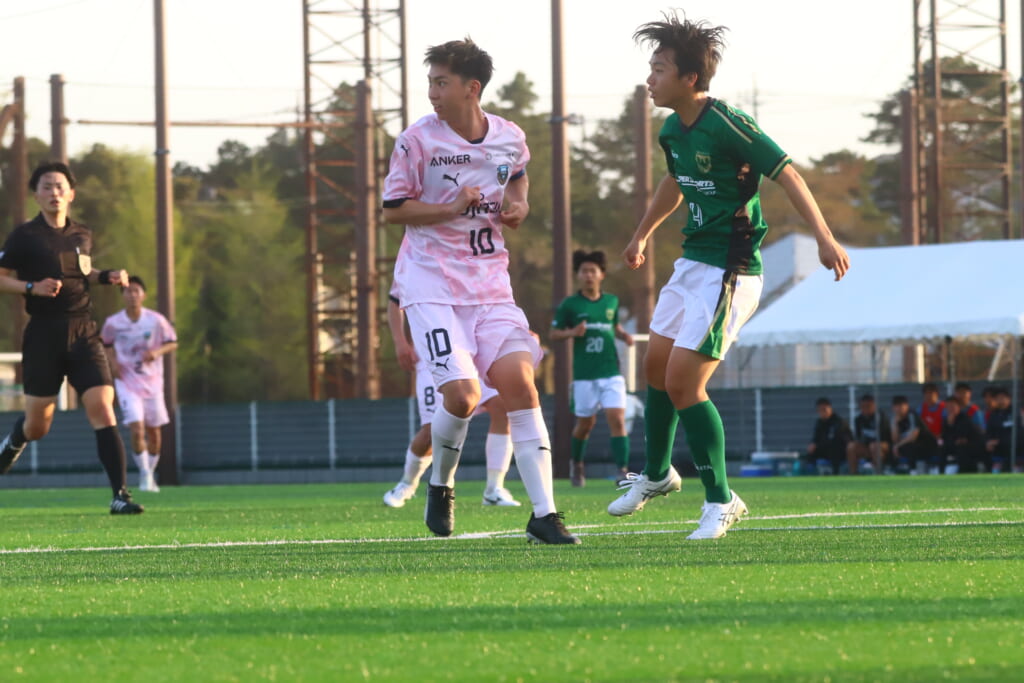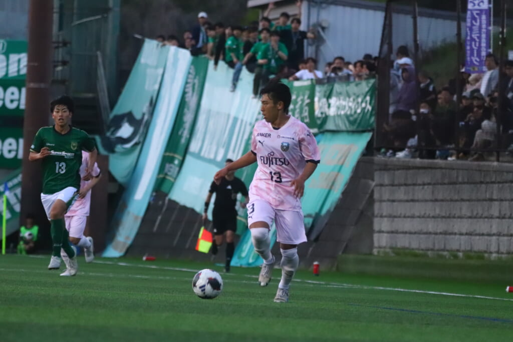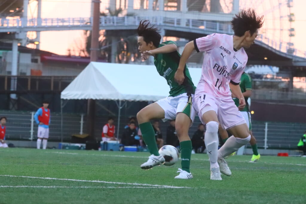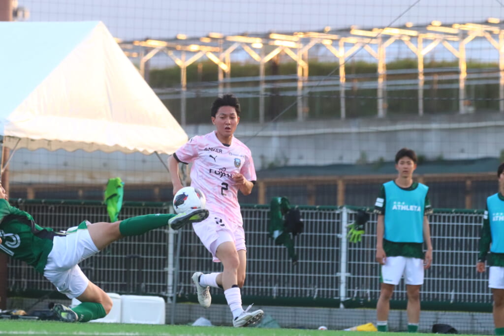左サイドへ展開し、木下晴天や広瀬、原田がかかわって高い位置でつながり、フロンターレの陣内でプレーする時間をつくっていきますが、フロンターレもコンパクトに粘り強く対応。セカンドボールを拾った小川尋斗が左サイド、高い位置へ。攻撃へ持ち込もうとしていきます。