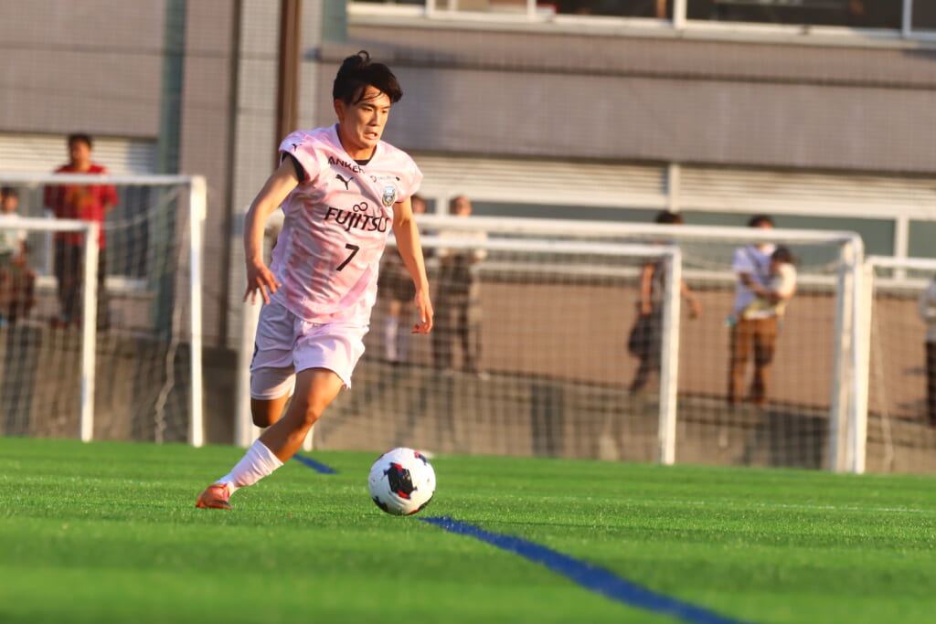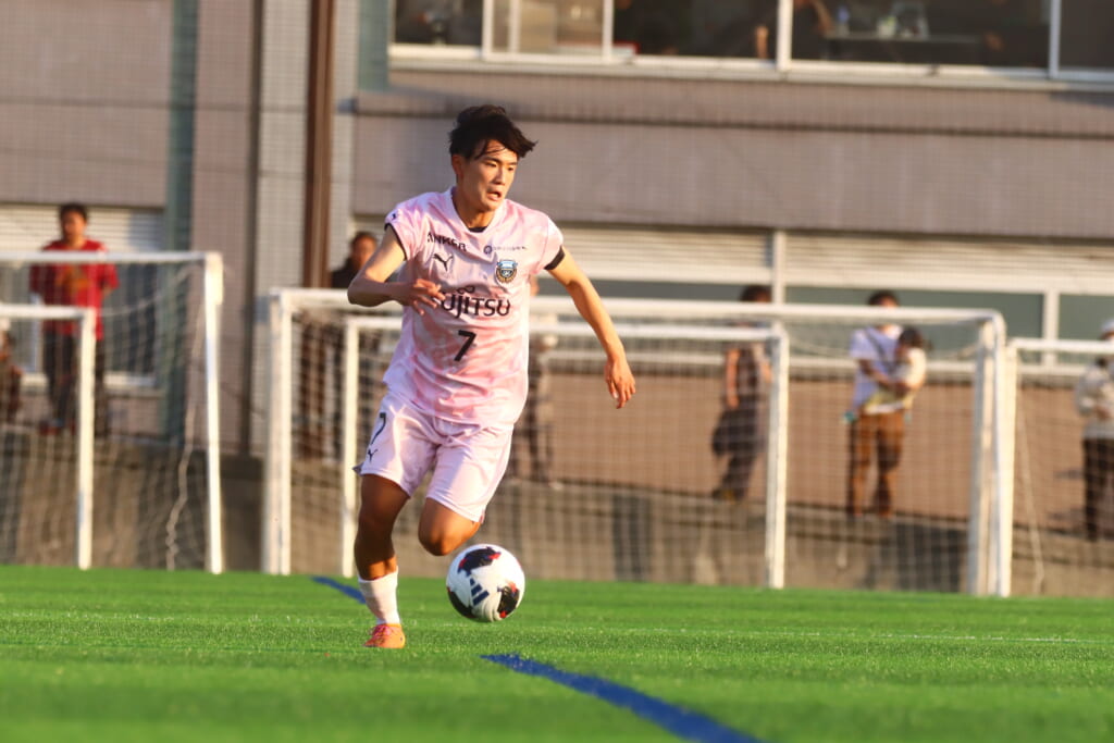小川翔太が小川尋斗との連係から右サイド、高い位置をうかがい、相手陣内でプレーする時間をつくっていくフロンターレ。