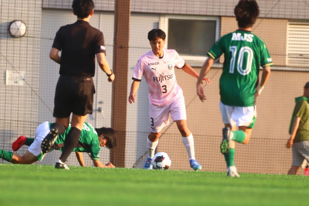 28分には、さらにフロンターレ、三上が中央でカット。そのパスに小川尋斗が正面右へ。しかし、ヴェルディも若月が自陣の低い位置まで戻りカット。