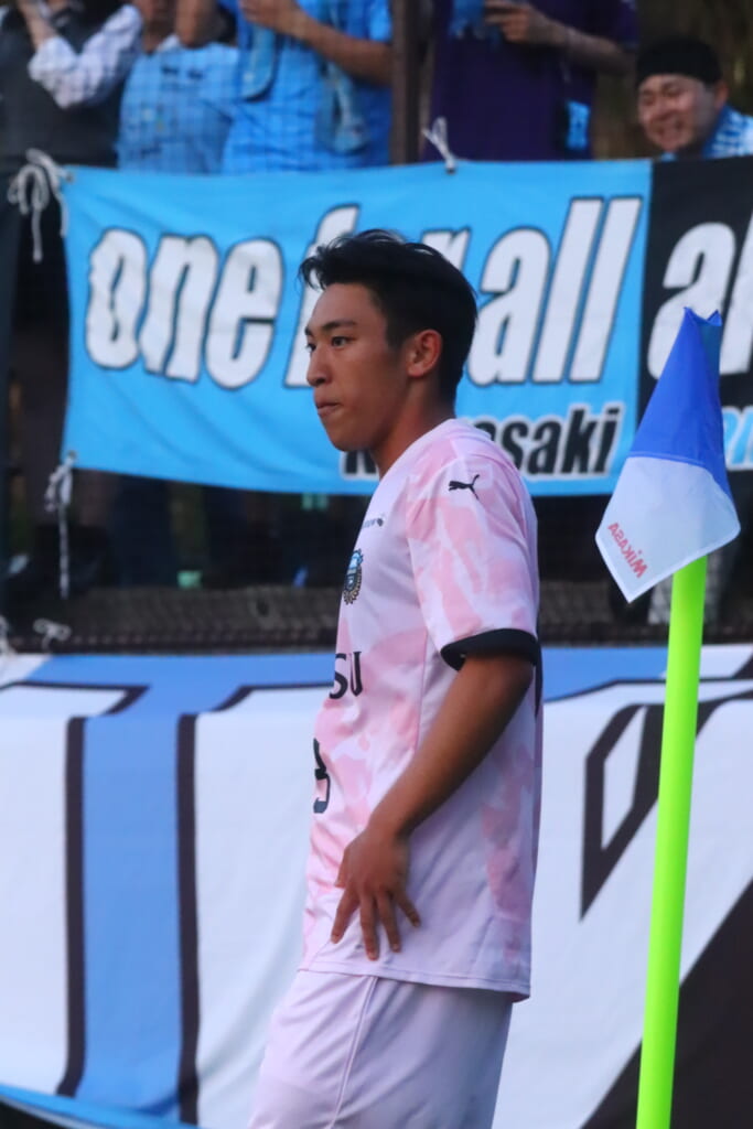 5分には、中央、中野が少し左に持ち出し、左サイド、高い位置を突くパス。抜け出した長崎が粘り、左コーナーキックに。しかし、エリア内でフロンターレはファール。