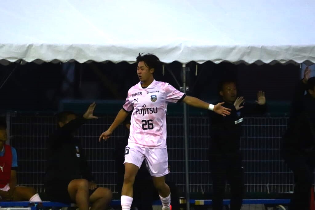 すると15分には、フロンターレ。左サイド、三上からエリア外正面左で受けた川村は正面へ粘り強く持ち込んでいきシュート。これが決まり、1-1。フロンターレの2026年のプレミアリーグ初ゴールは川村。素晴らしい個の力を見せ、フロンターレが追いつきます。