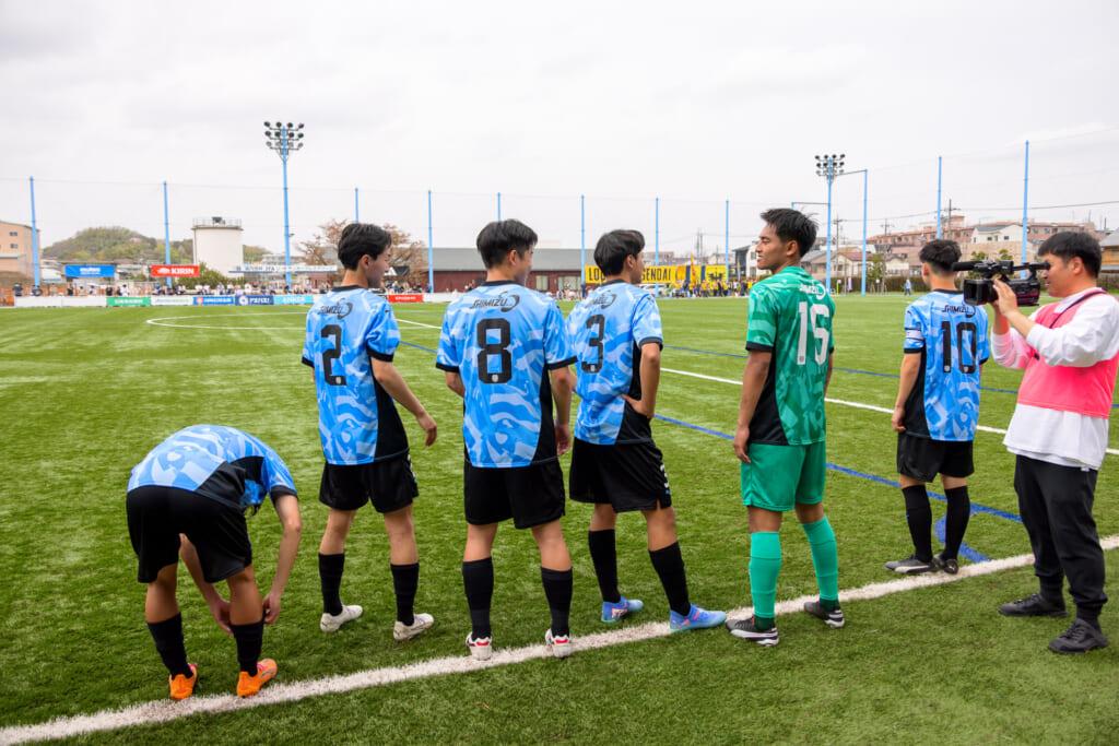 試合開始前の集合写真。掛け声は長崎亘佑選手。