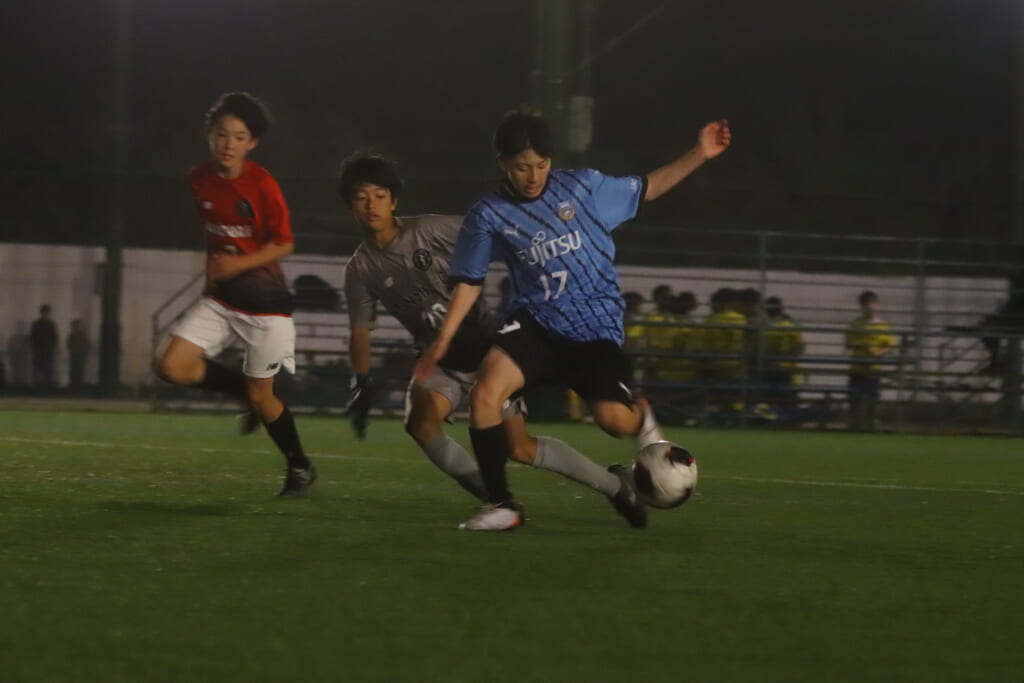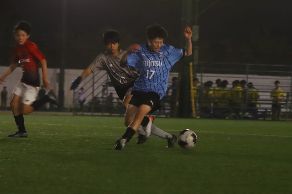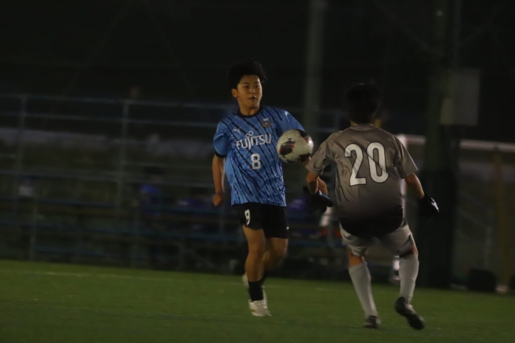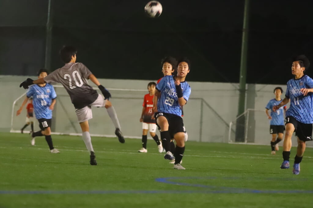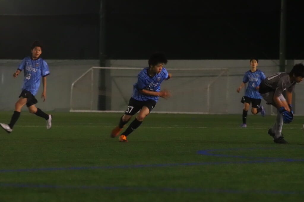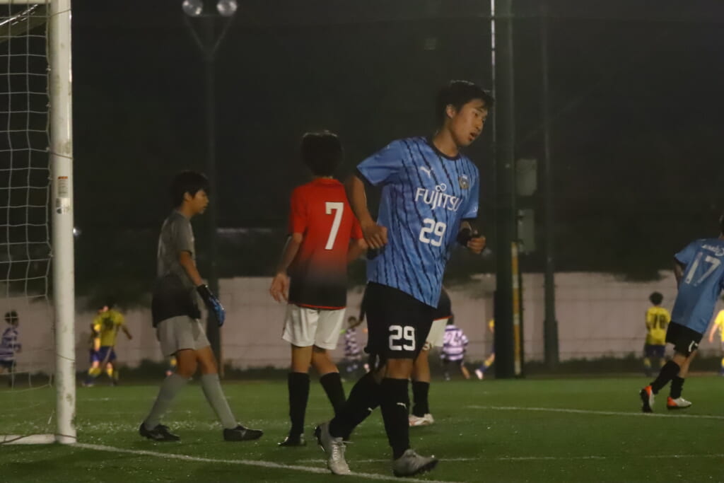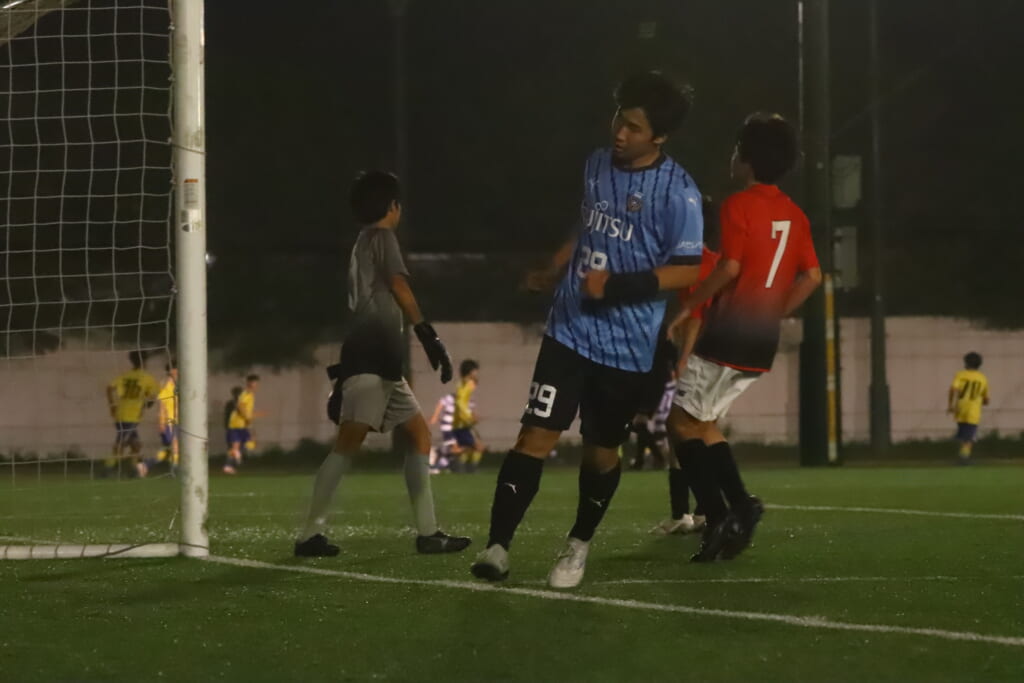 西川が折り返すと正面でシュートを打ったのは荻原。これが決まり、4-0。フロンターレ等々力がさらに追加点を挙げます。