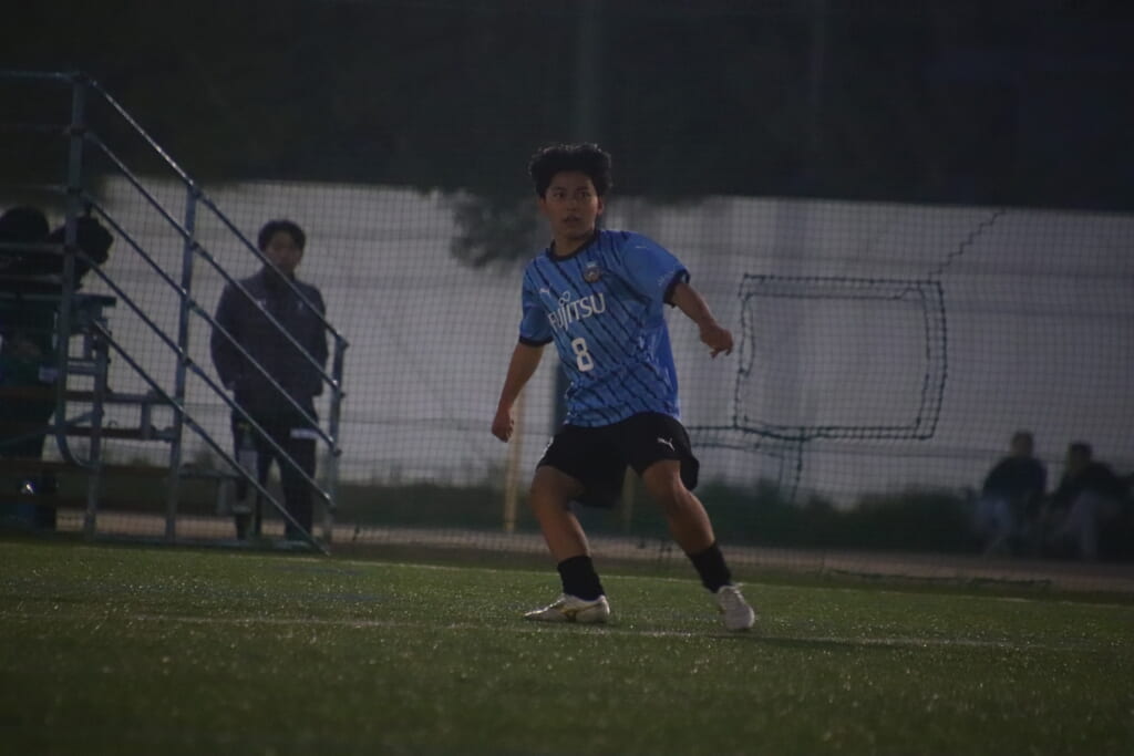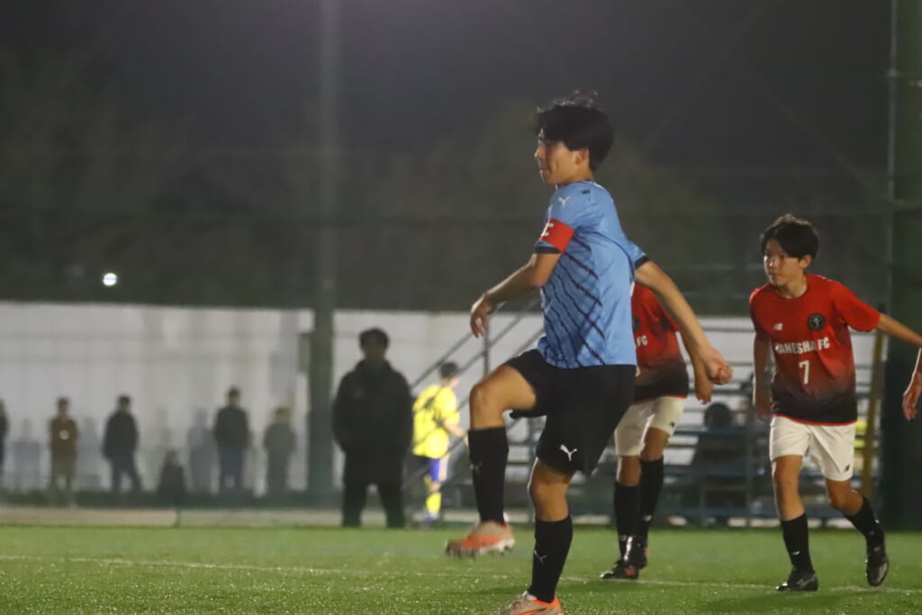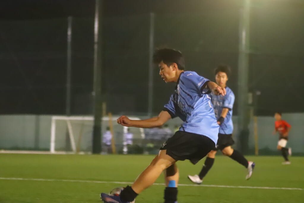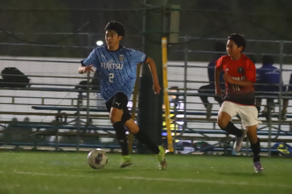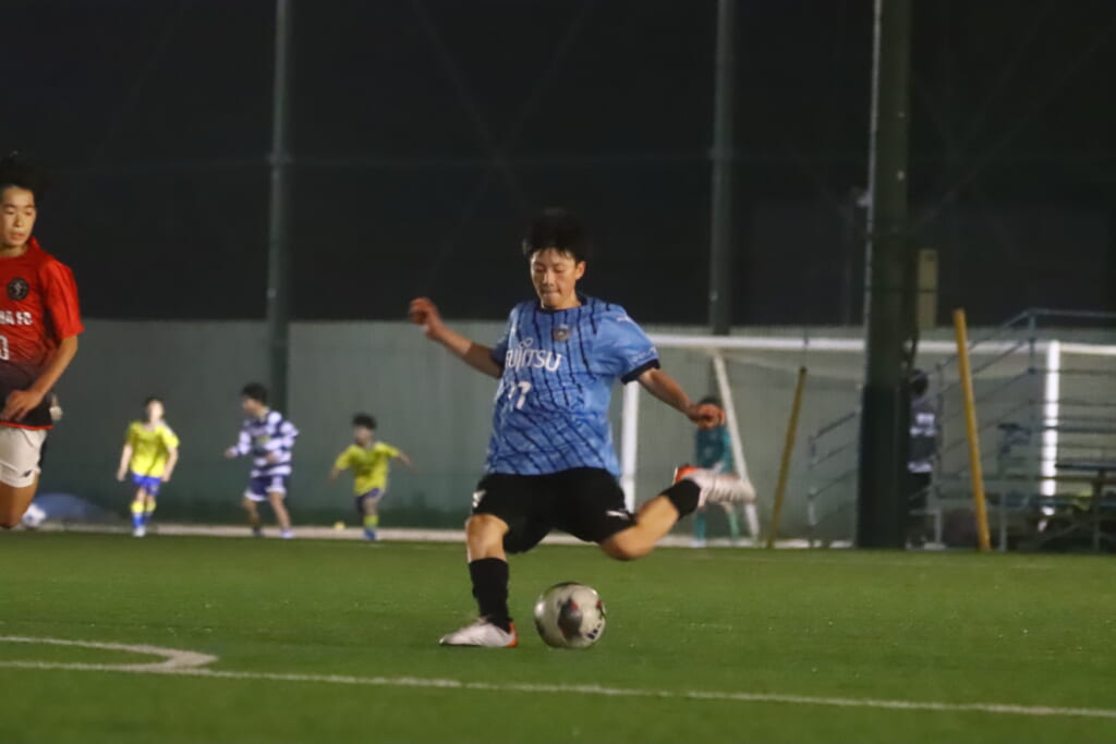 15分には、フロンターレ等々力、永田が中央に顔を出し、左サイドへ展開。受けた岩田陸叶が少し内へ持ち出し、そのパスに抜け出した梶がエリア外左へ。