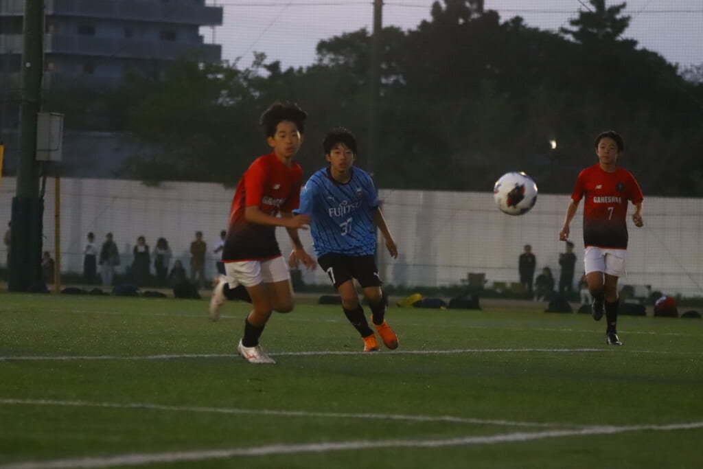 GANESHAも左サイドでボールをカットし前に持ち込む場面をつくりますが、フロンターレ等々力はすぐさま寄せて前には行かせず。