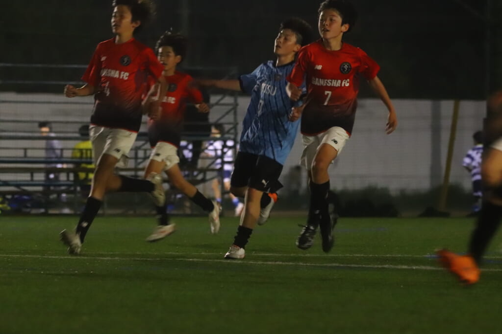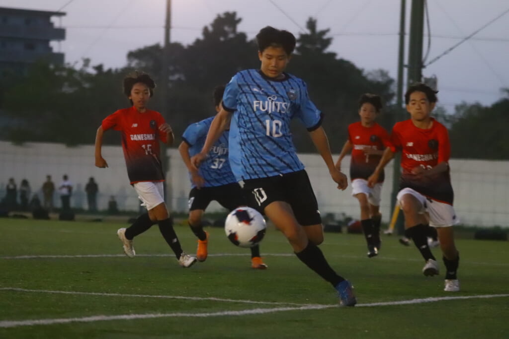 フロンターレ等々力は、さらに最終ラインに時松や我妻がかかわり組み立て。それに対し、GANESHAはラインを高めていきますが、3分には右サイド、久村から大寺とつながり、大寺は左サイド、背後を突くパス。抜け出した梶がエリア左へ。シュートを打つもGK吉元がセーブ。
