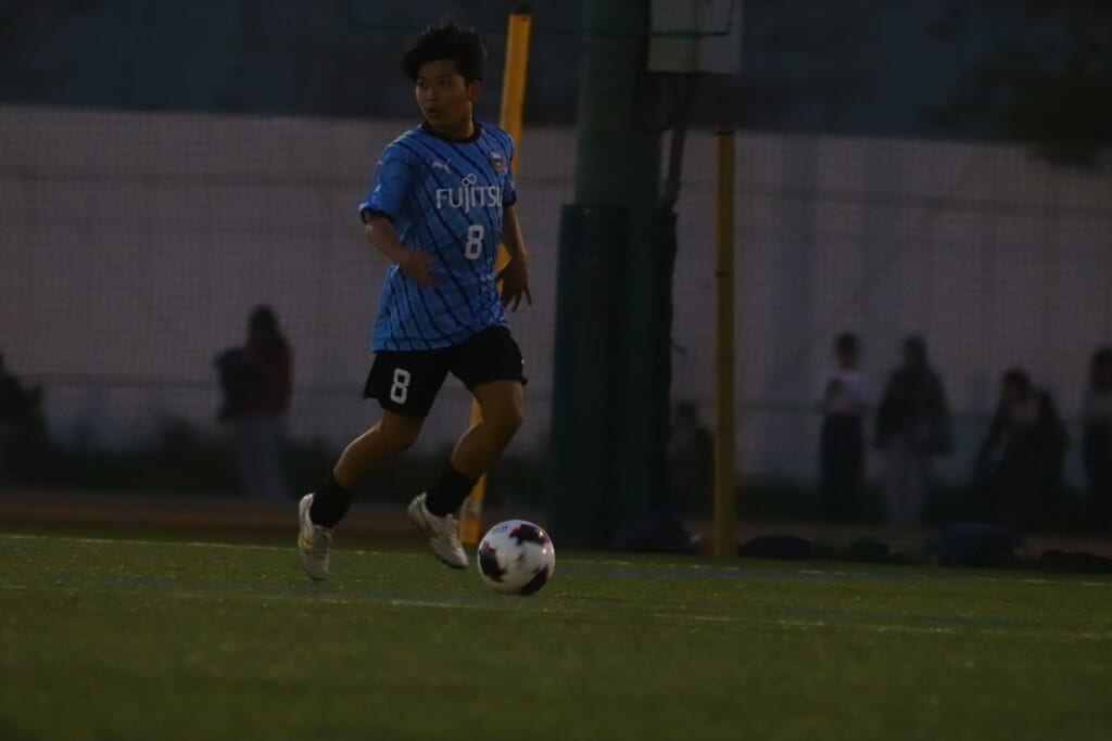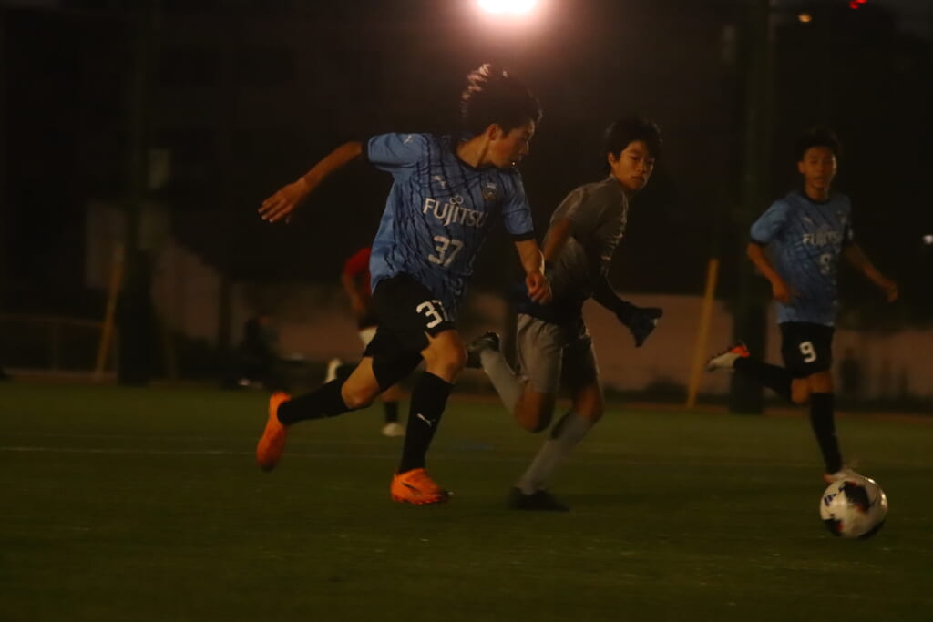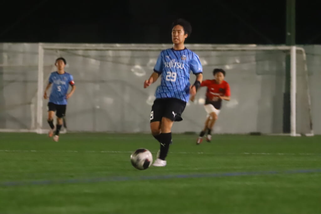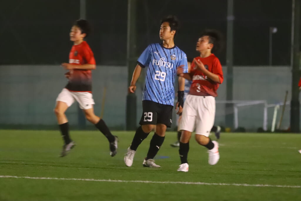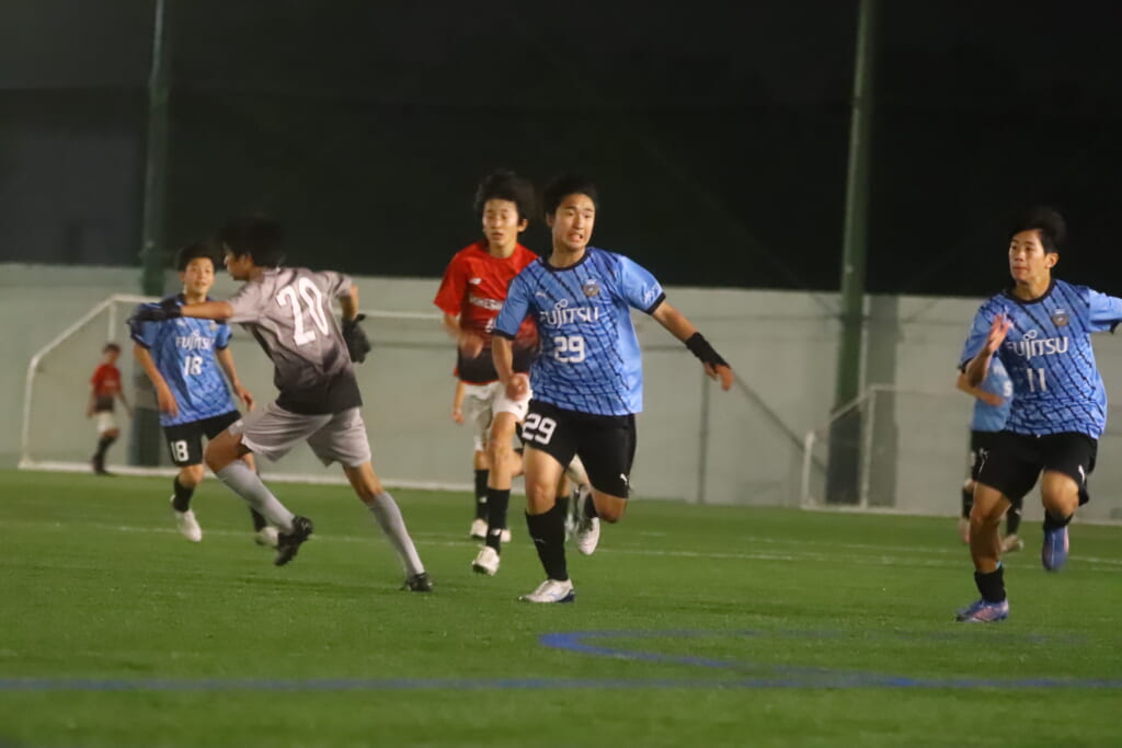 さらに細川、岩田陸叶、左サイドで梶もかかわりながら、つないでいくフロンターレ等々力。
