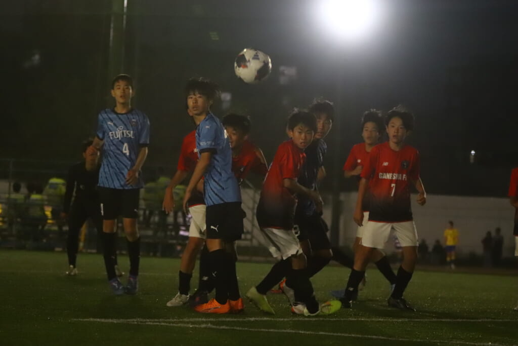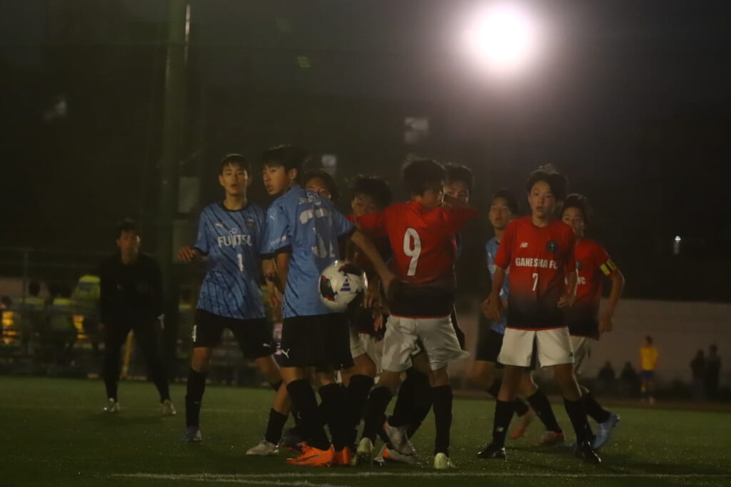 GANESHAも、フロンターレ等々力のオフサイドで得たフリーキックからエリア前にボールを入れていきますが、フロンターレ等々力はそれにしっかり対応。