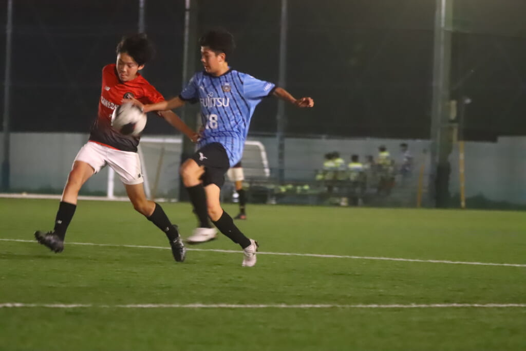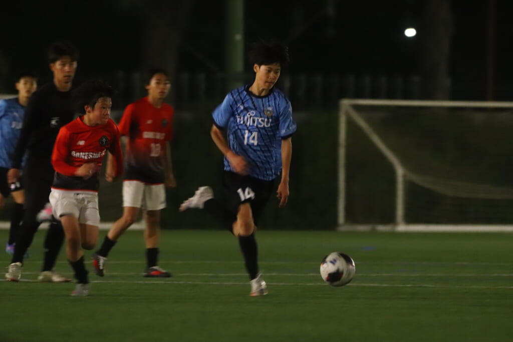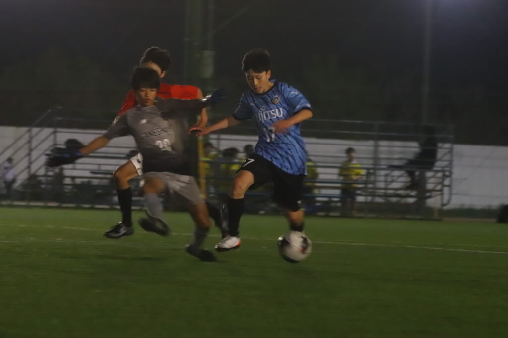 GKの酒寄から左サイド、梶へ。梶の斜めに速いパスに岩田陸叶が正面へ。ここはGANESHAが対応。こぼれ球を拾ったフロンターレ等々力は梶がミドルシュート。
