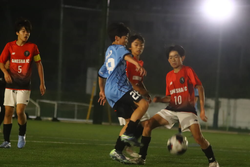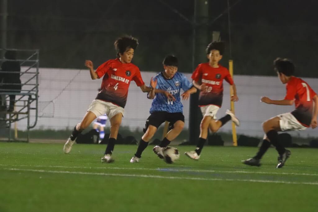 右サイドでスローインを得たフロンターレ等々力はその流れから岩田陸叶が正面右への仕掛け。GANESHAの守りも粘り強く対応し、シュートを打つことはできませんでしたが、ゴールへ迫る場面をつくっていきます。