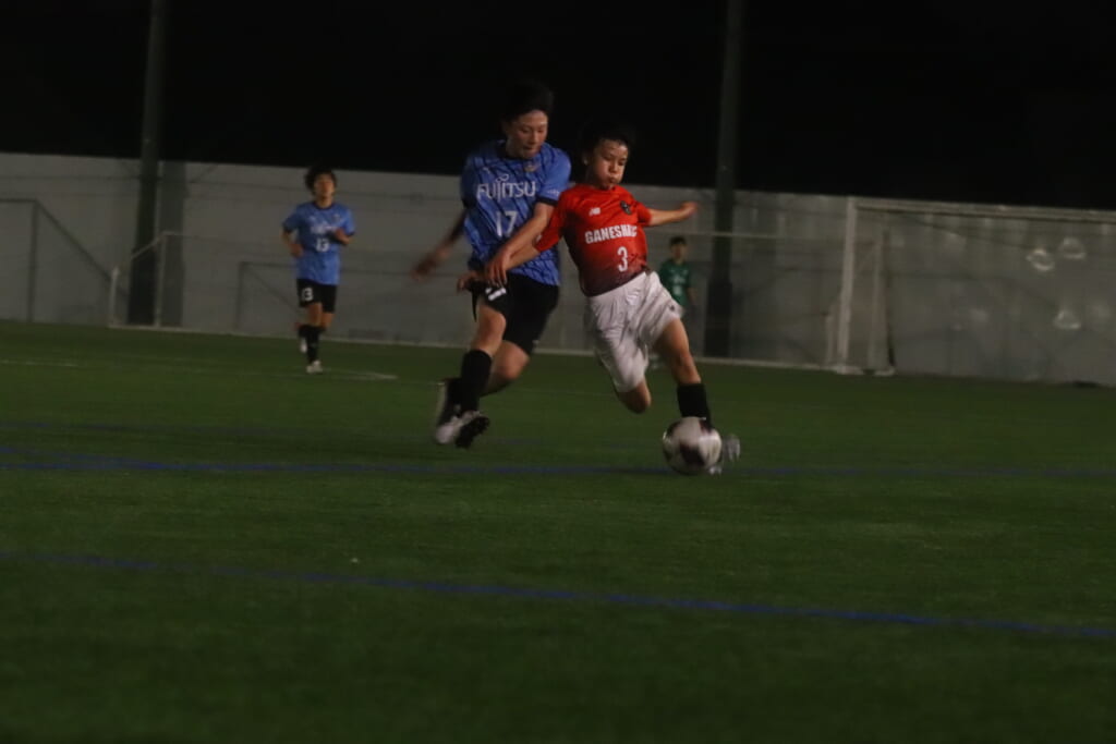 フロンターレ等々力の右コーナーキックをしのいだGANESHAは左サイド、高い位置へ持ち込んでいきますが、フロンターレ等々力の戻りも速く、カバーしていきます。