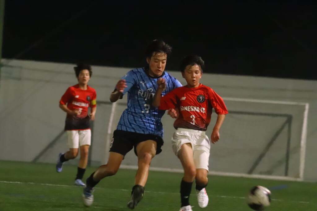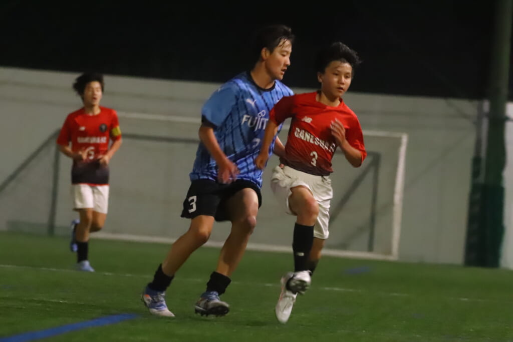 一方のGANESHAは右SBの小林竜之介が中央へ持ち込んでいきますが、フロンターレ等々力は岩田陸叶がプレスバック。