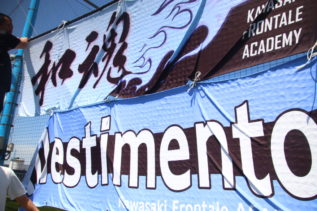 青空が広がり初夏のような陽気のAnker フロンタウン生田。両チームの選手の家族ら、さらにフロンターレのサポーターの姿も。フロンターレのサポーターが青黒の幕を出せば、三菱養和巣鴨もゴール裏に赤い幕を出す。それぞれのチームを愛する人々の思いもこもった雰囲気の中、キックオフの時を迎えました。