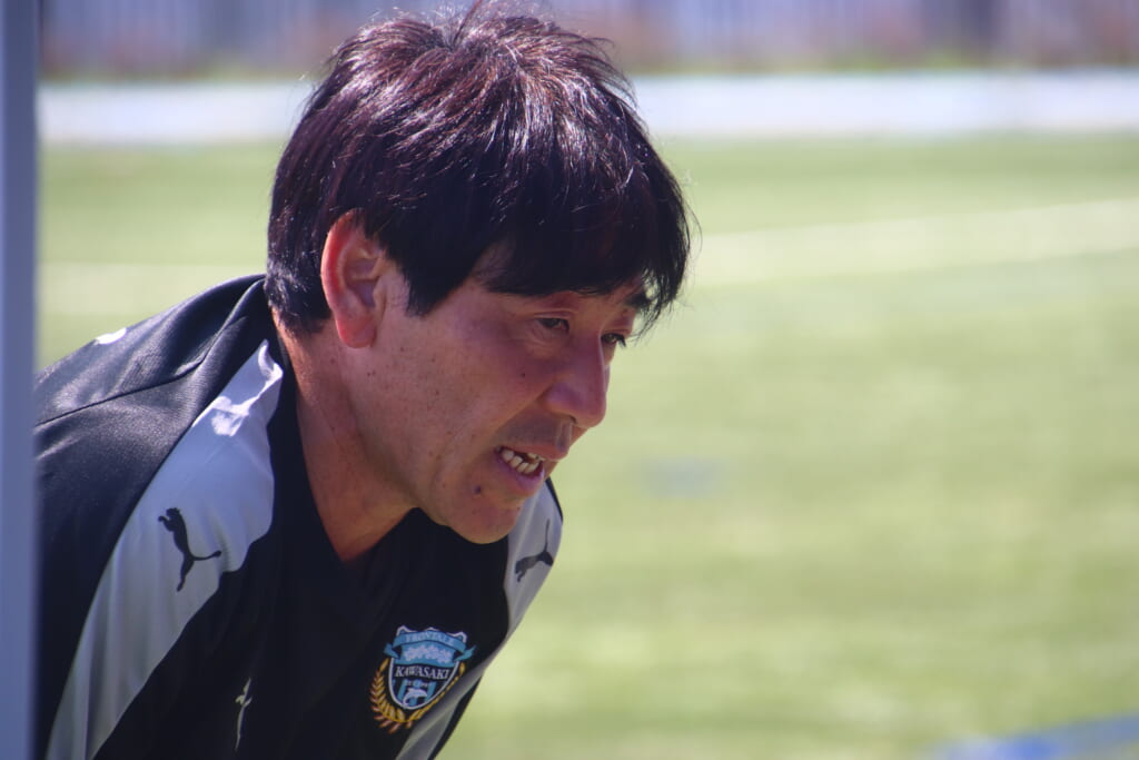 浮き球に対して笠倉が中央で競り、吉澤が下がり目に下りおさめ、徳政や望月、上野が後ろで動かし、さらに組み立てていくフロンターレ生田。