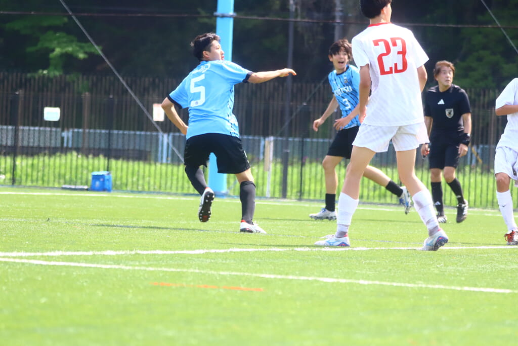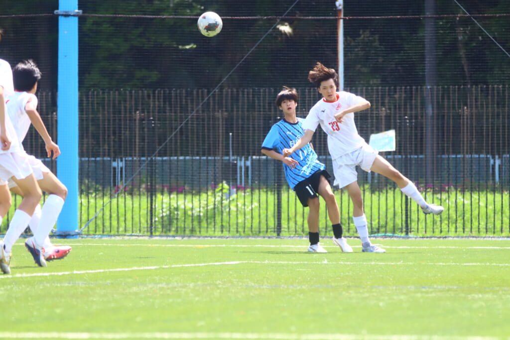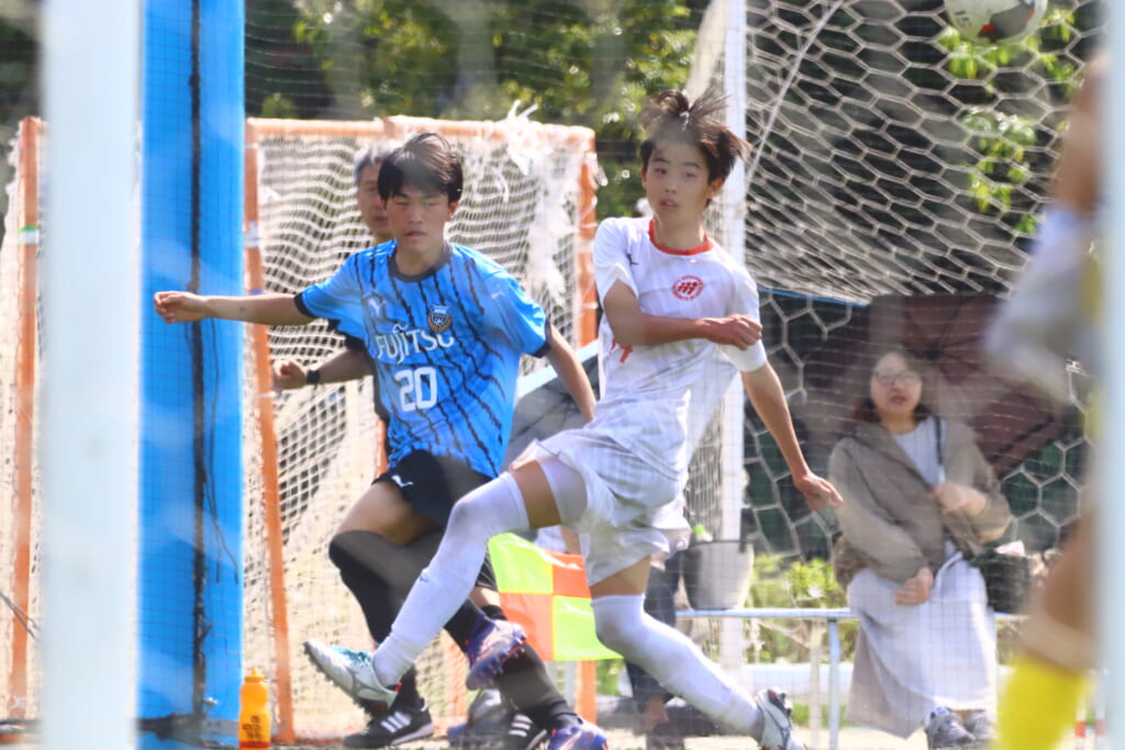 左コーナーキックを得た三菱養和巣鴨。田中が入れるとエリア右、流れたボールを拾った河原木がシュート。しかし、ライン上でフロンターレ生田はブロック。