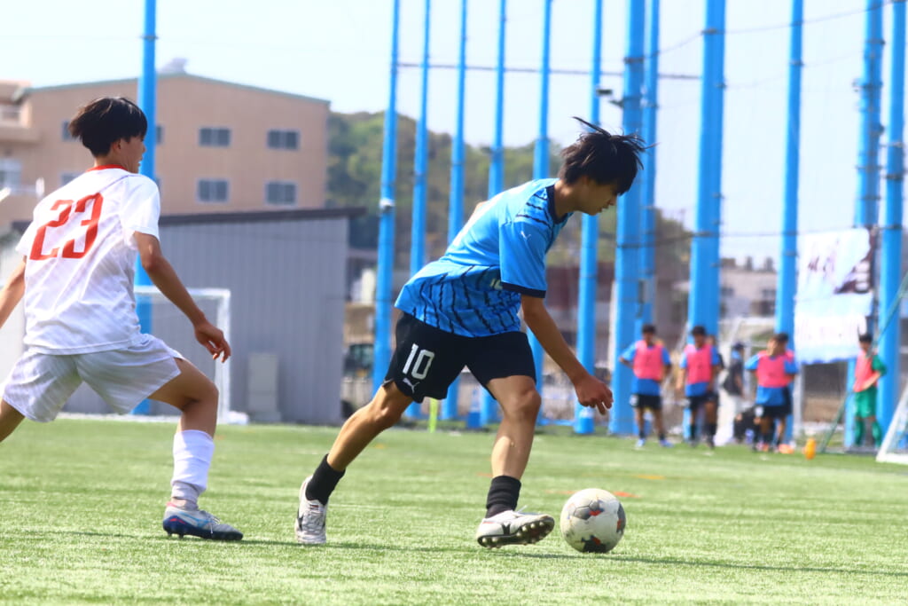 三菱養和巣鴨がボールを持つところでは、都島がプレス。自分たちのボールにしていくフロンターレ生田。