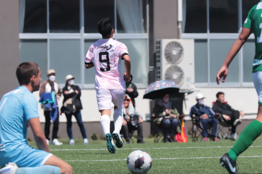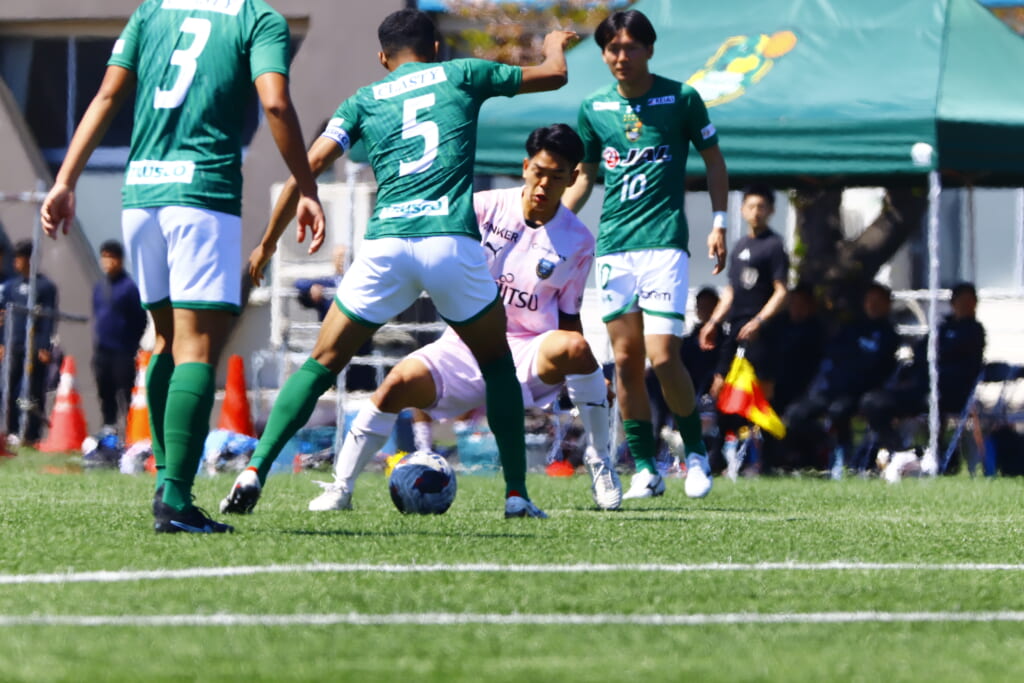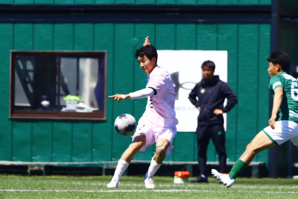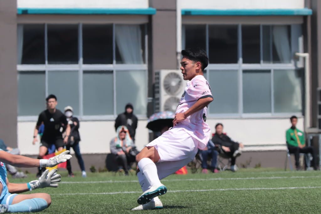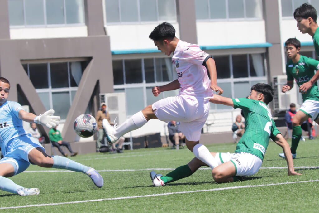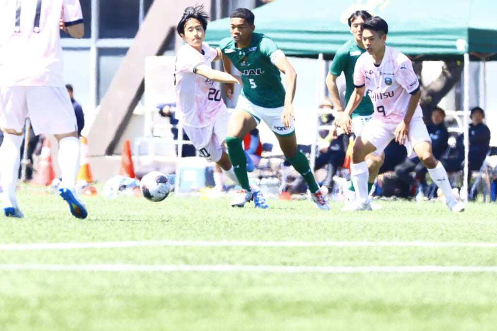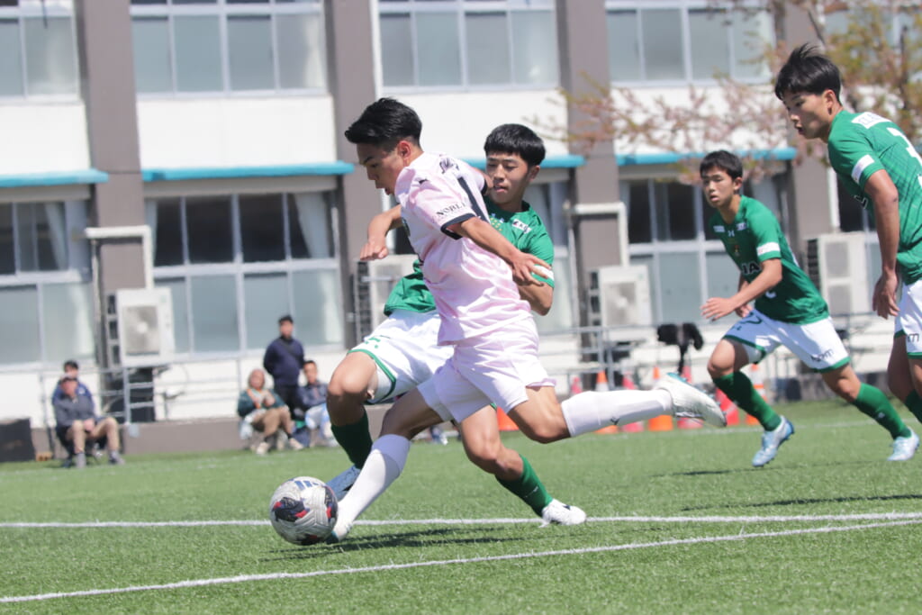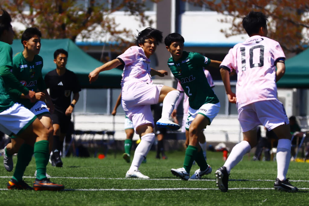 いったんは青森山田がカットするも奪い返した小川尋斗がエリア外正面へ。ミドルシュートは枠をとらえることはできませんでしたが、意欲的に前に持ち込み、チャンスをつくっていきます。