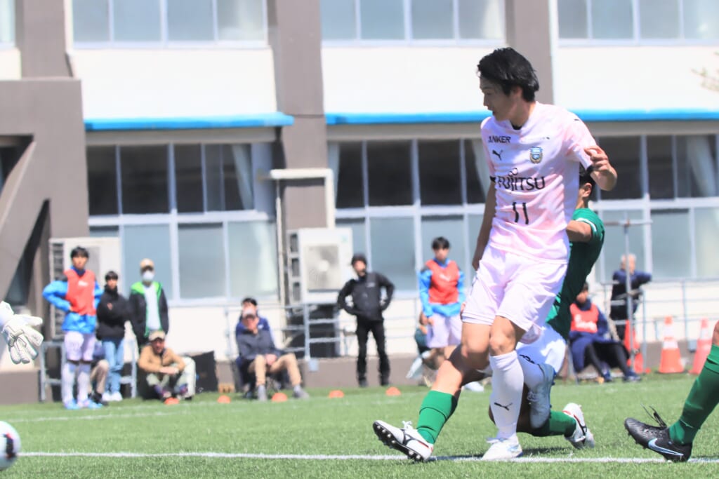 さらに今廣の縦パスを、下がり目で廣瀬が受け、廣瀬から受けた小川尋斗が高い位置へ。ドリブルで持ち込むなど、前に出ていくフロンターレ。
