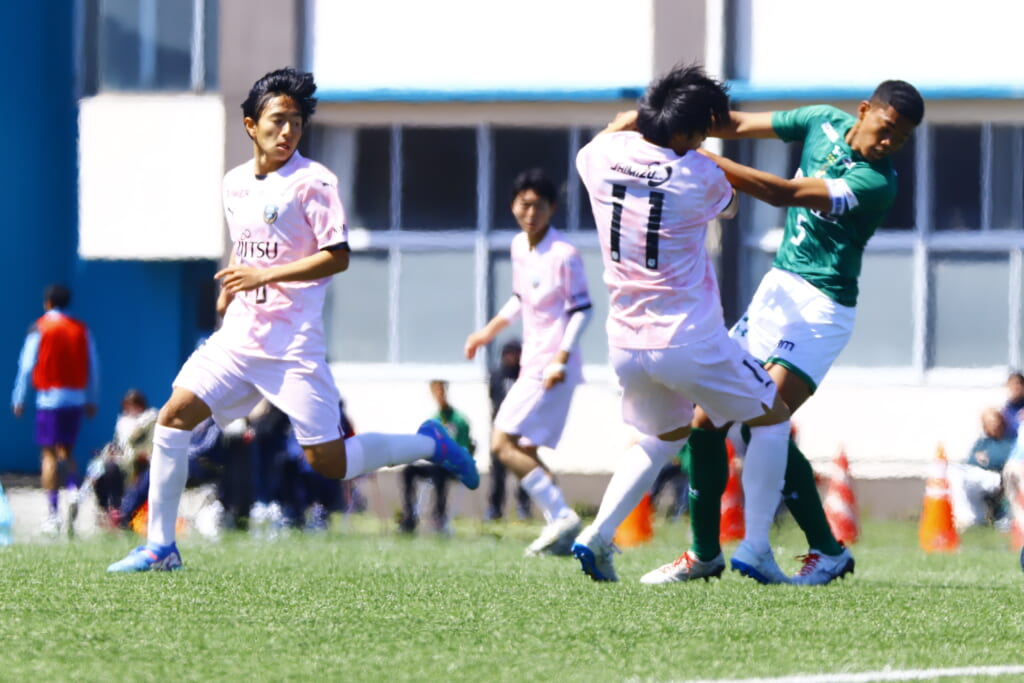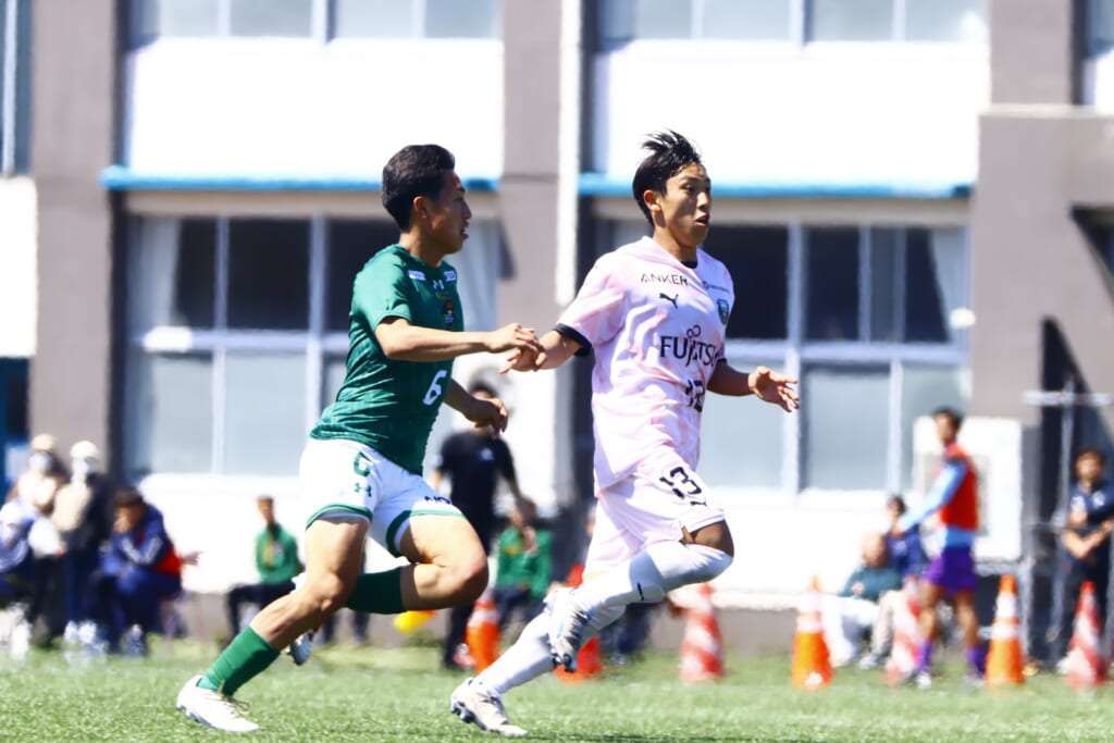 フロンターレが粘り強く阻んだところ、セカンドボールを拾った青森山田は左サイドから中央へ持ち込み、右サイドへ展開。
