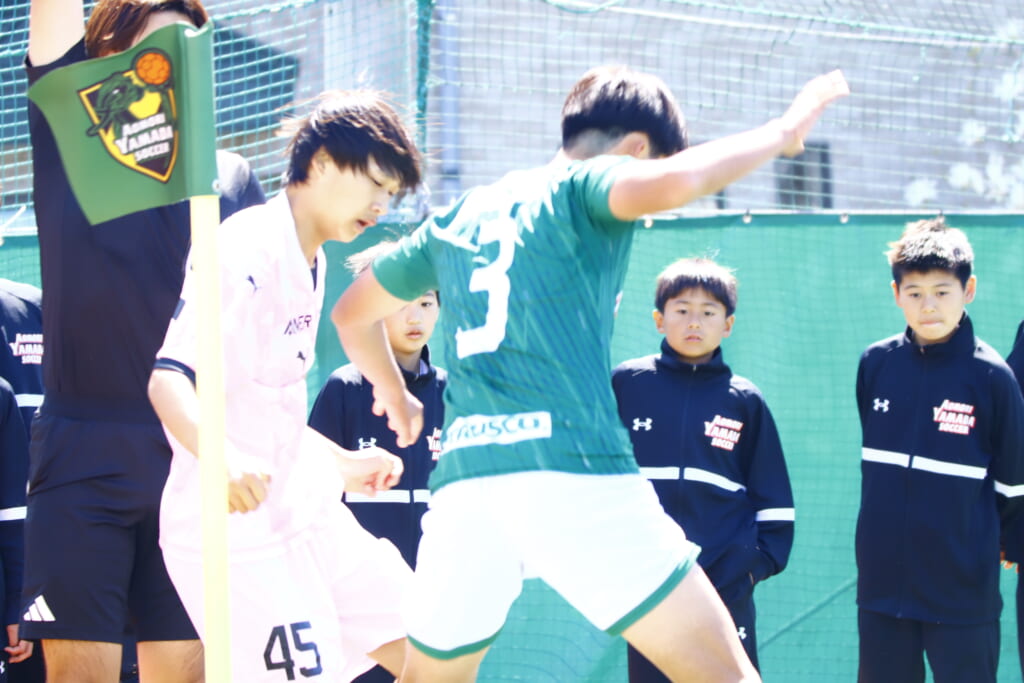 キッカーは三上。直接エリア内へ入れるのではなく、エリア外正面へ送ることを選択。小川尋斗の落としから山川がミドルシュート。