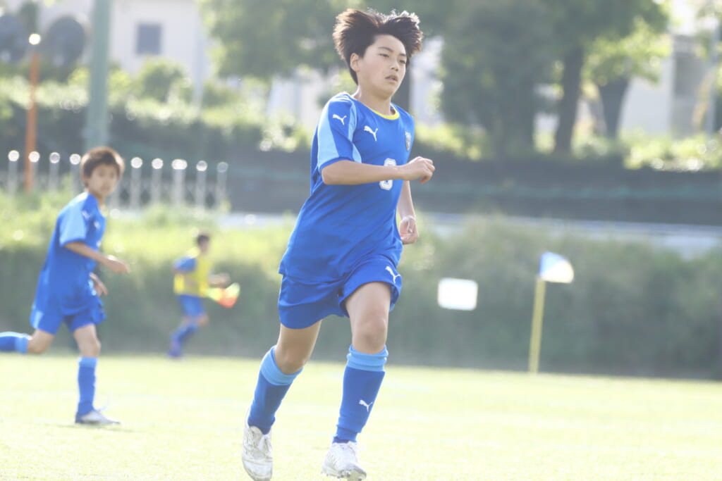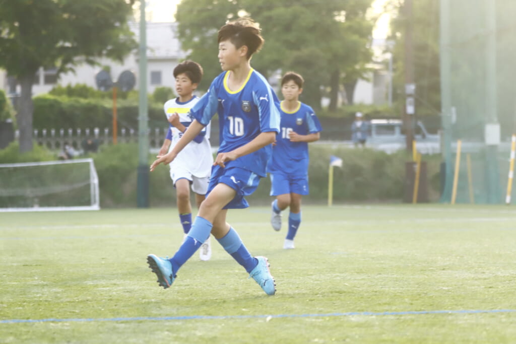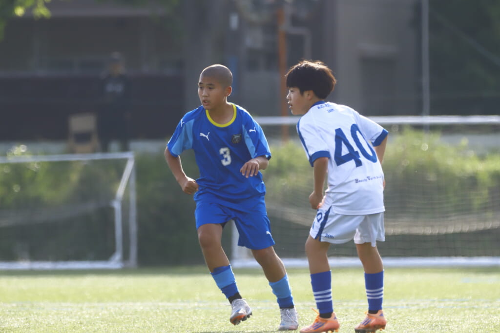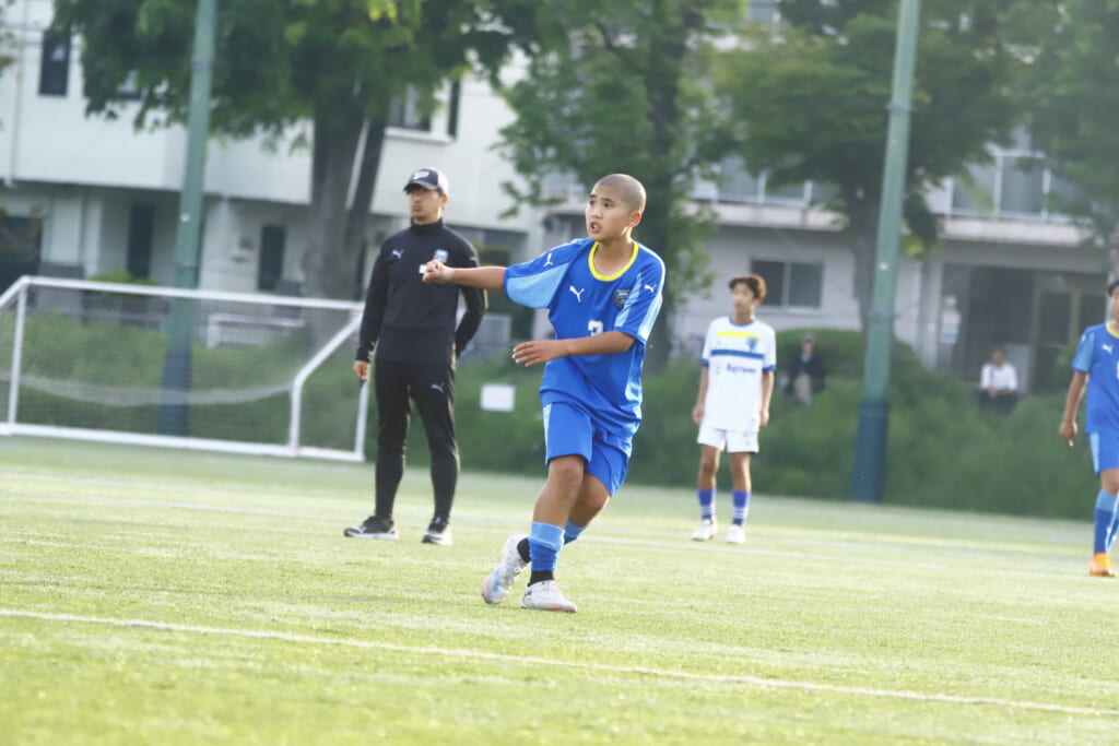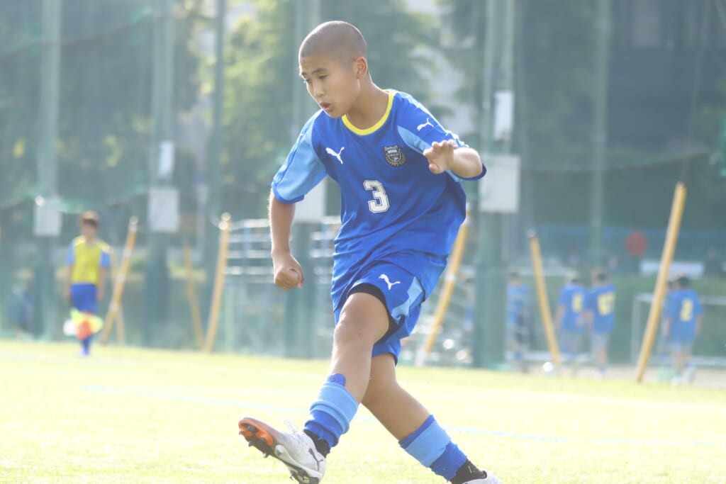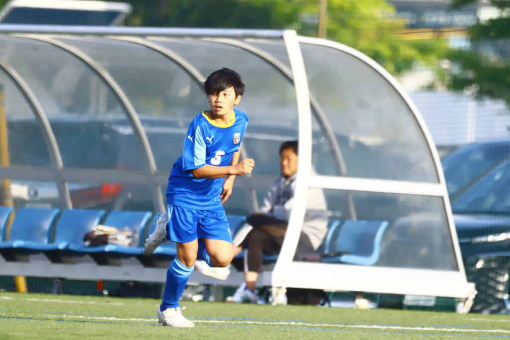3分には、フロンターレ等々力、アスミジュニアユースが左サイドへ展開したところ、佐野がカバーし、中央に下りた角市へ、