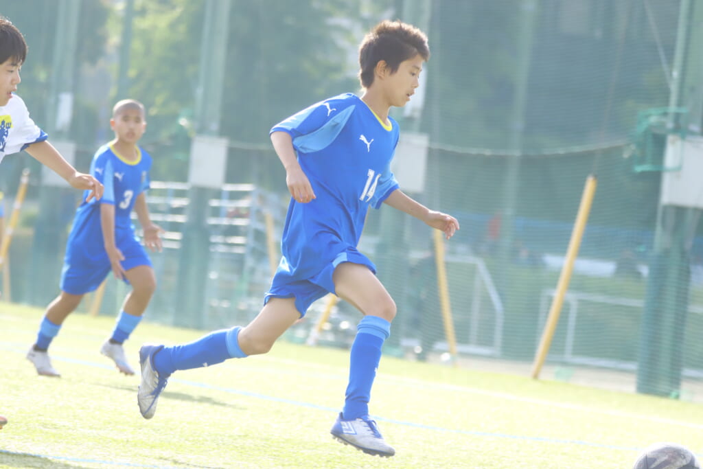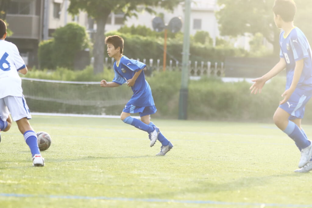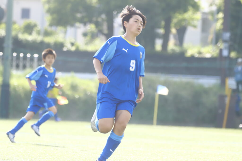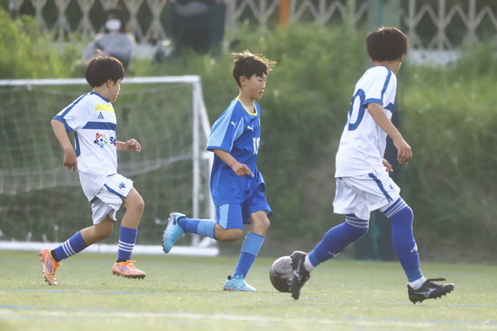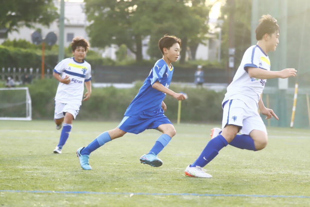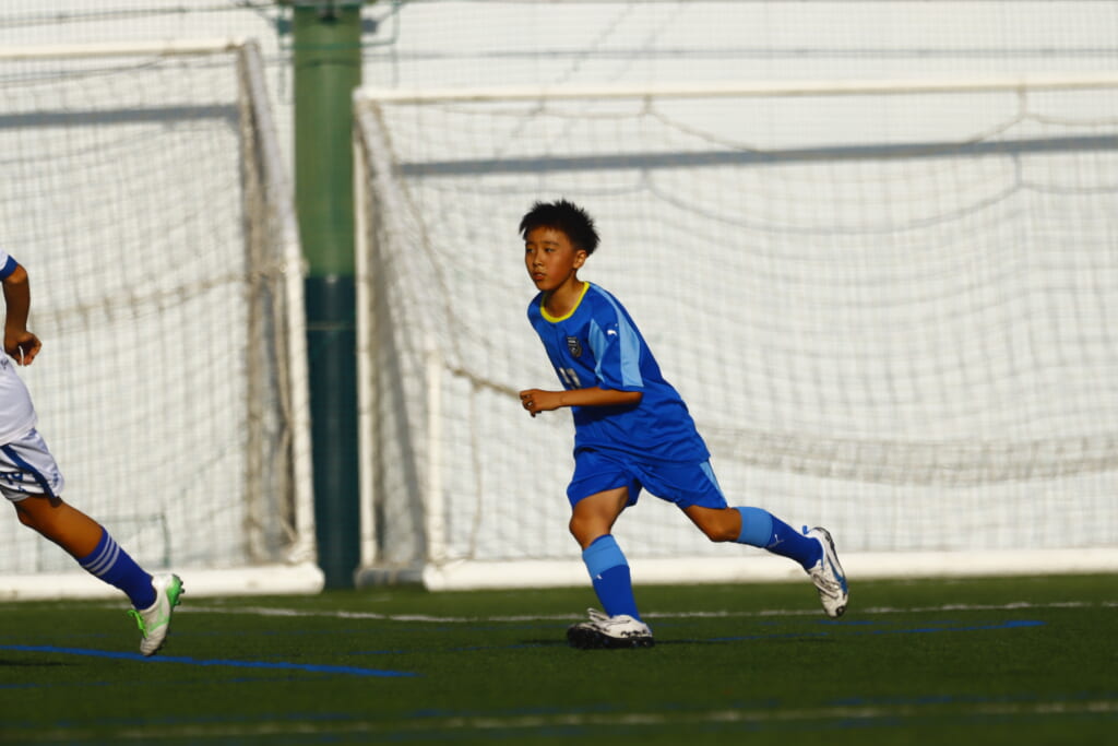 3分には、フロンターレ等々力、アスミジュニアユースが左サイドへ展開したところ、佐野がカバーし、中央に下りた角市へ、
