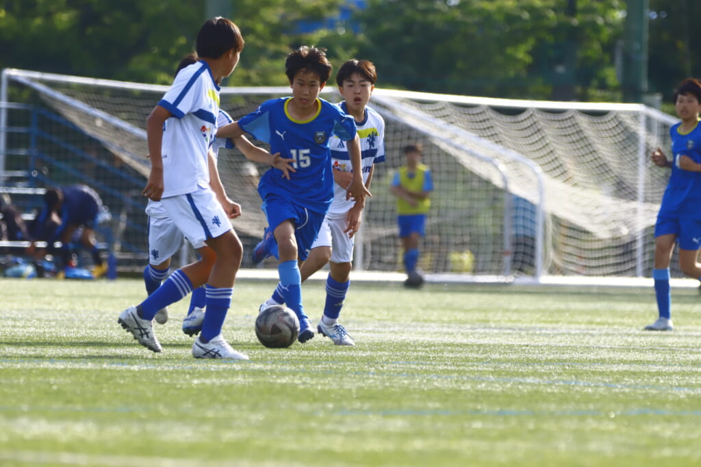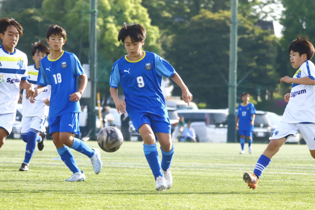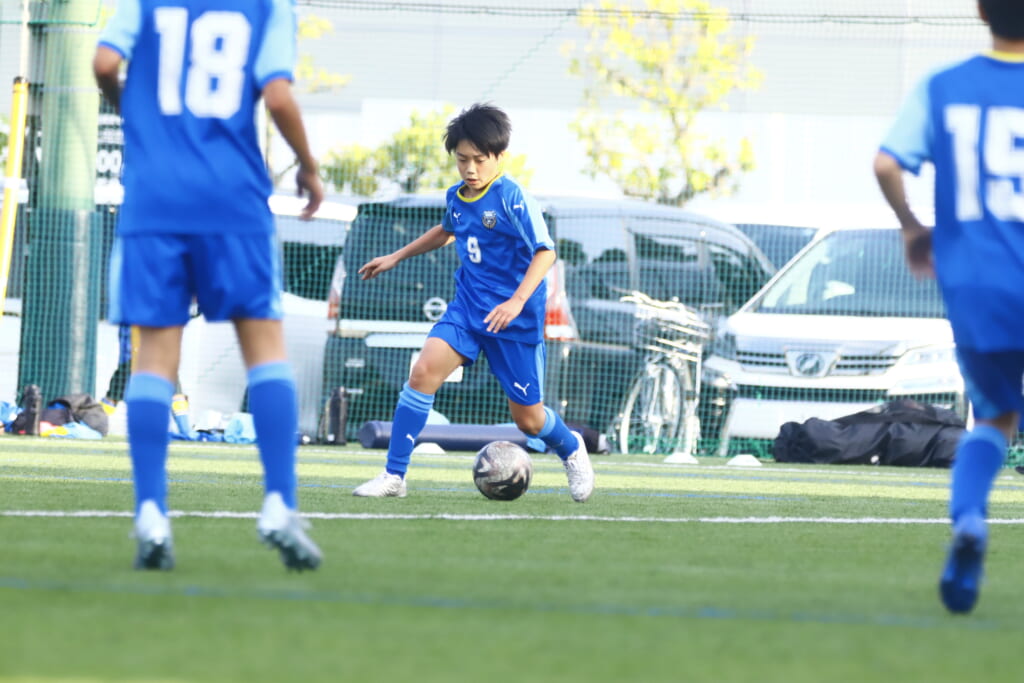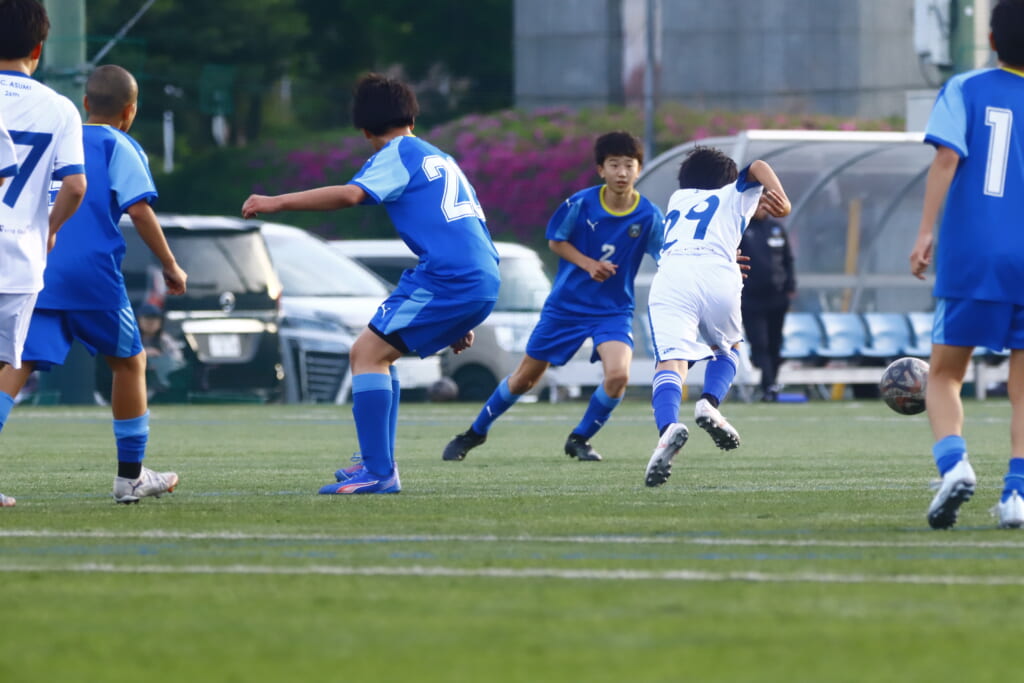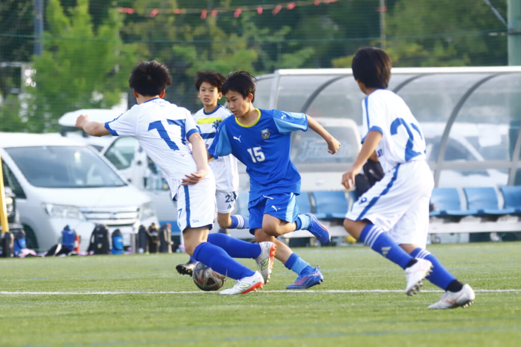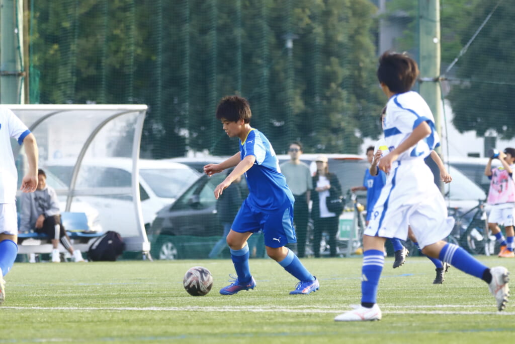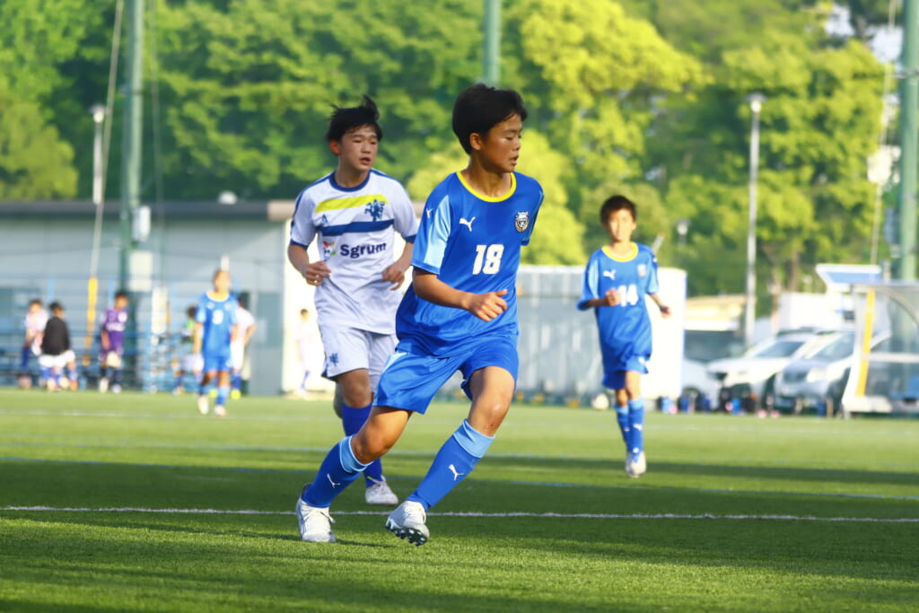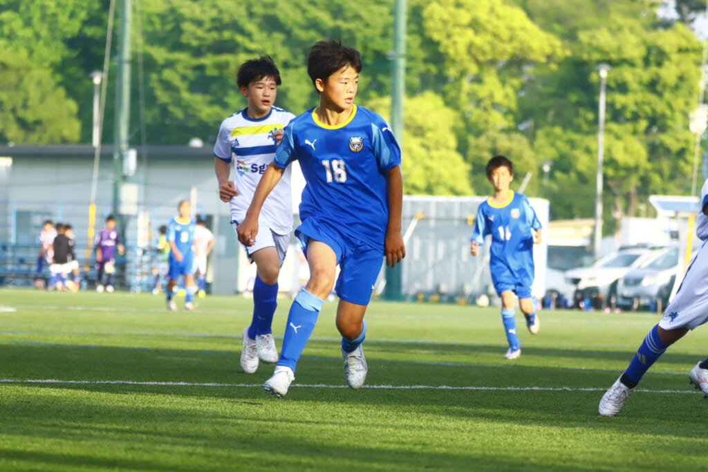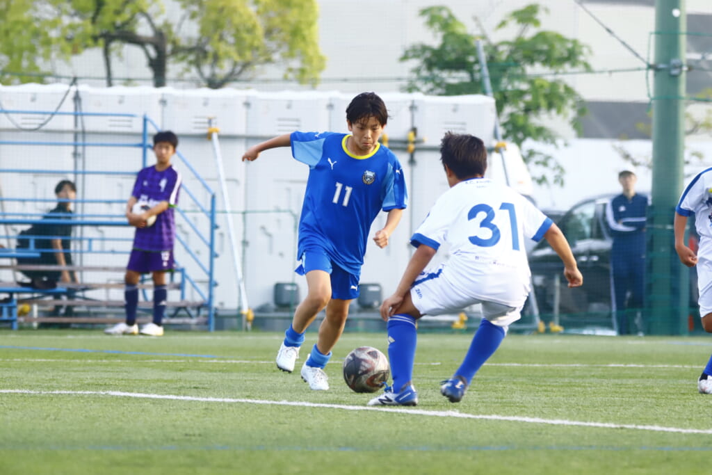 5分には、左サイドでのスローインの流れから鈴木が正面への仕掛け。アスミジュニアユースが対応したところ、さらにボールをつないでいくフロンターレ等々力、