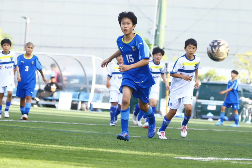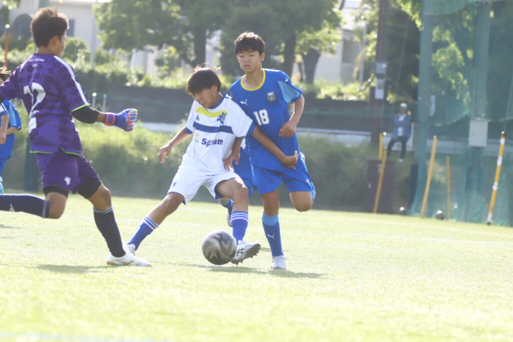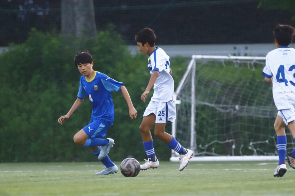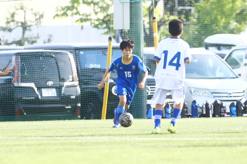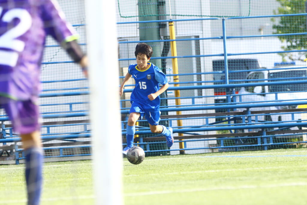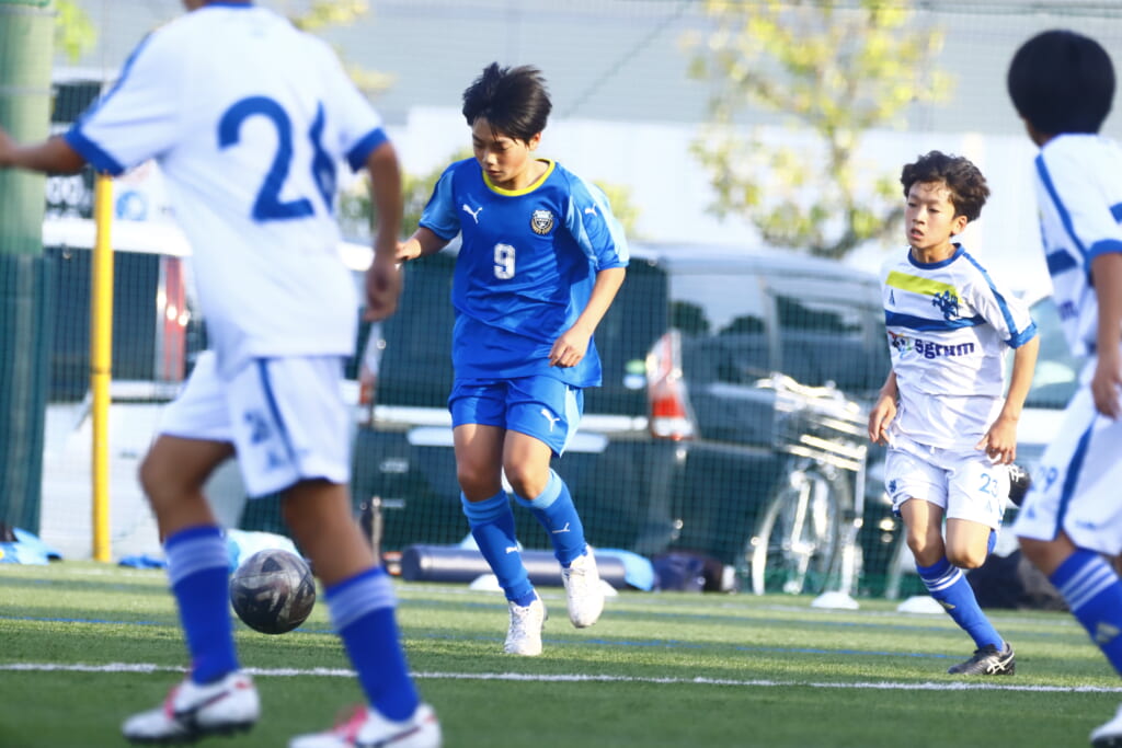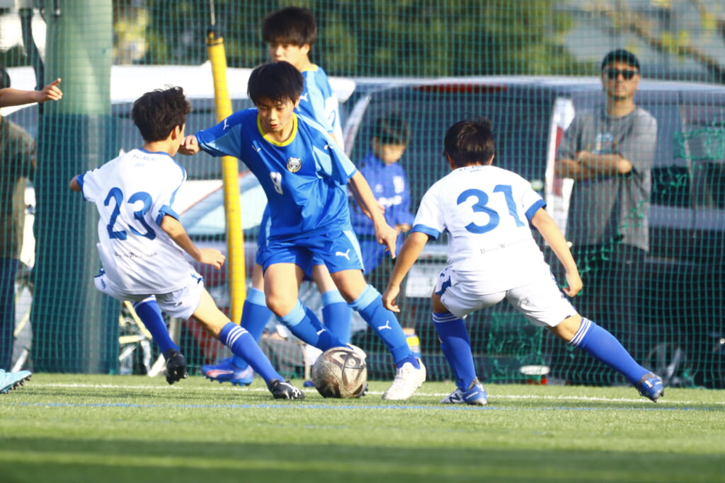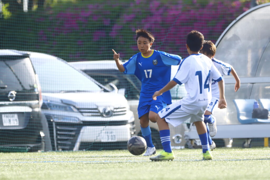5分には、左サイドでのスローインの流れから鈴木が正面への仕掛け。アスミジュニアユースが対応したところ、さらにボールをつないでいくフロンターレ等々力、