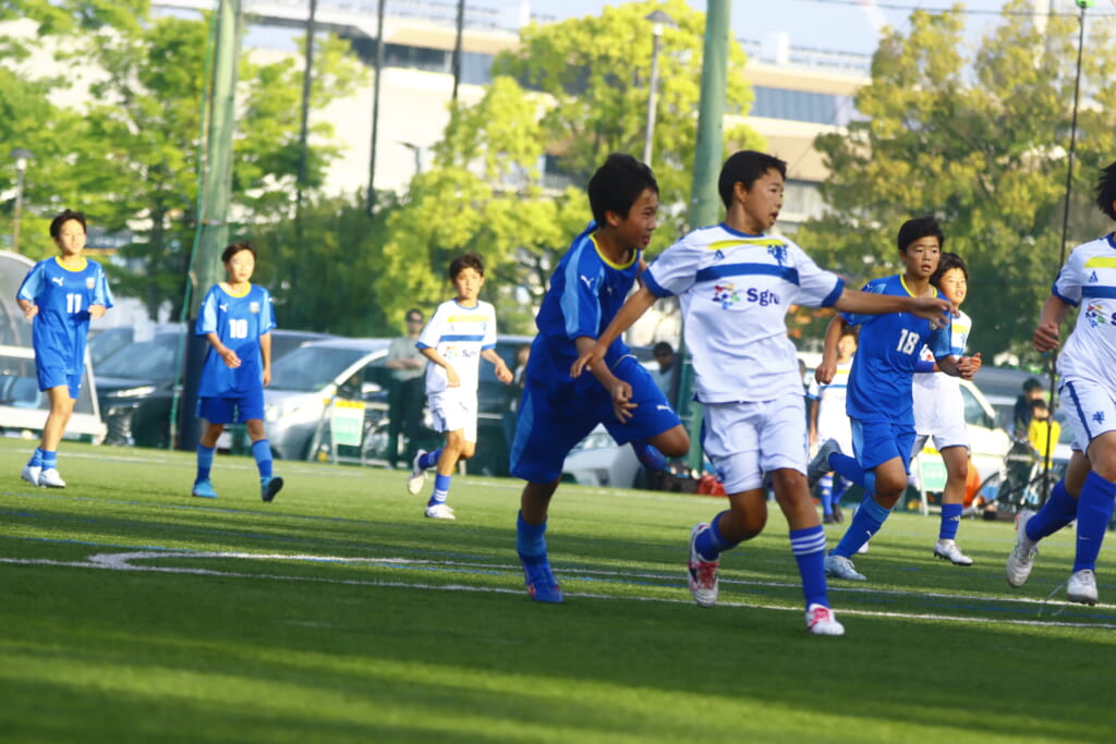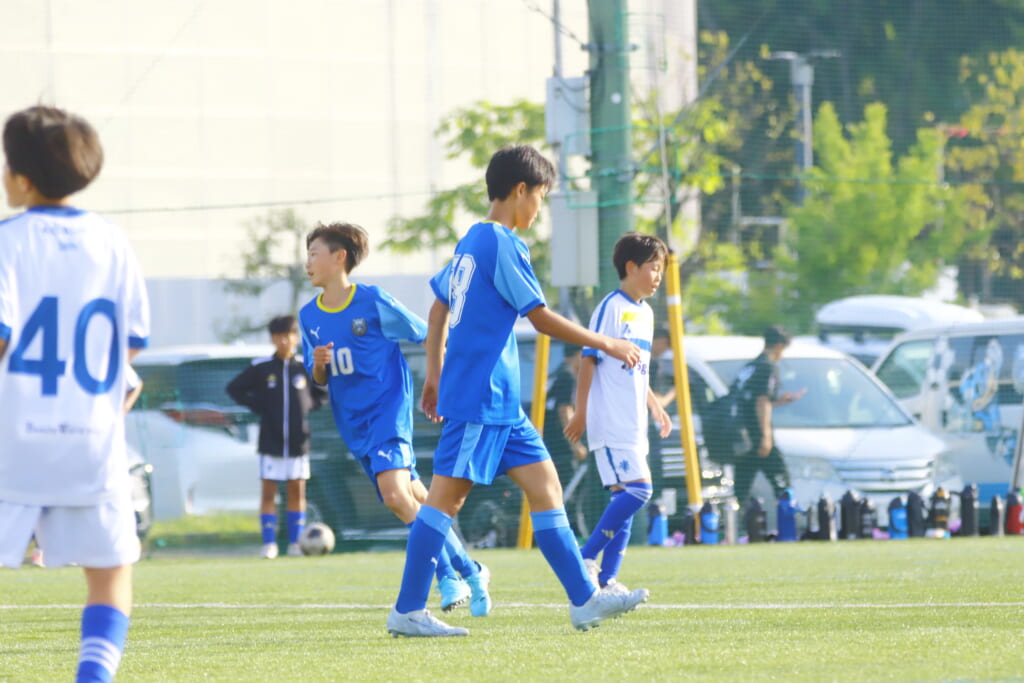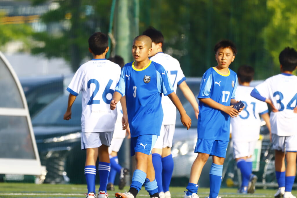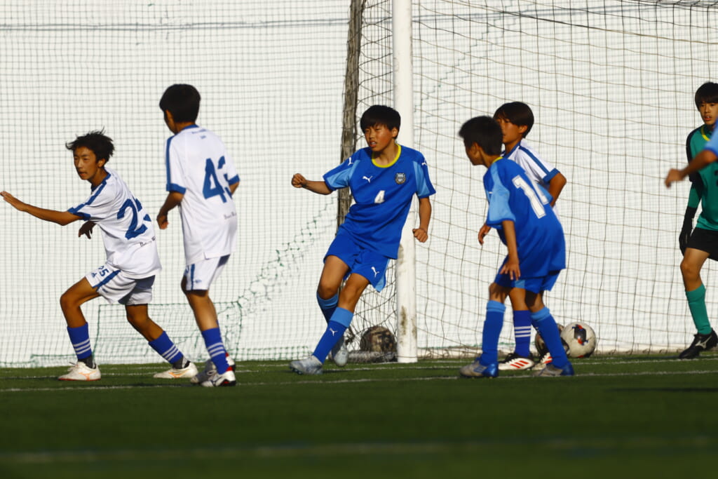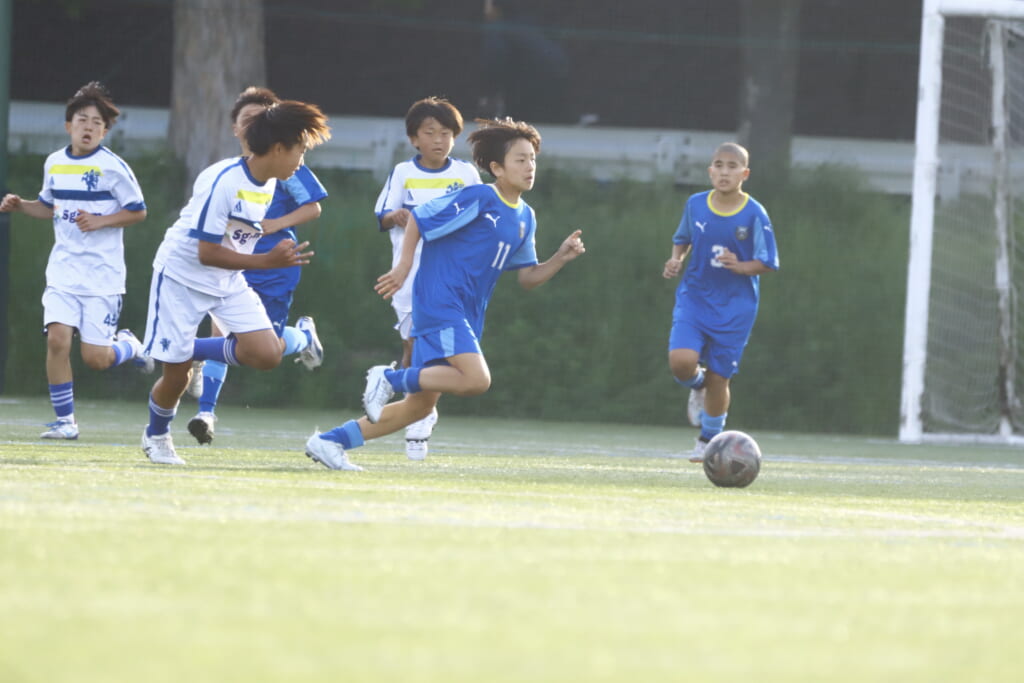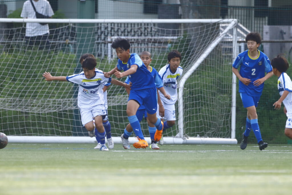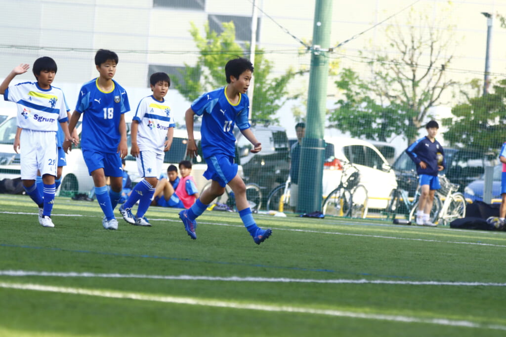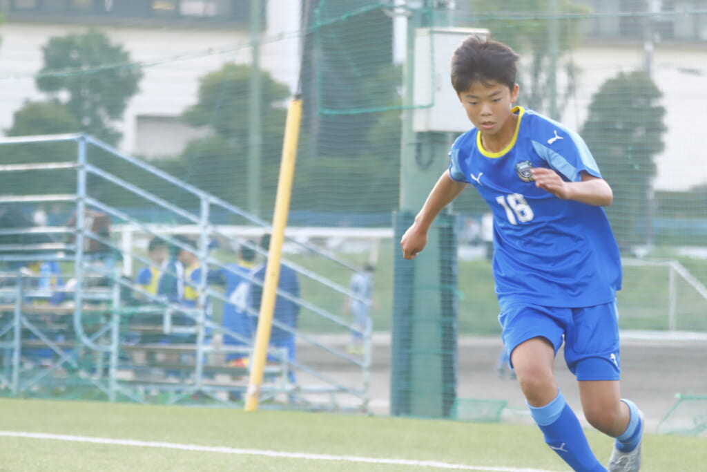 6分にはアスミジュニアユースがカット。左サイド、18が持ち上がったところ、奪い返したフロンターレ等々力。