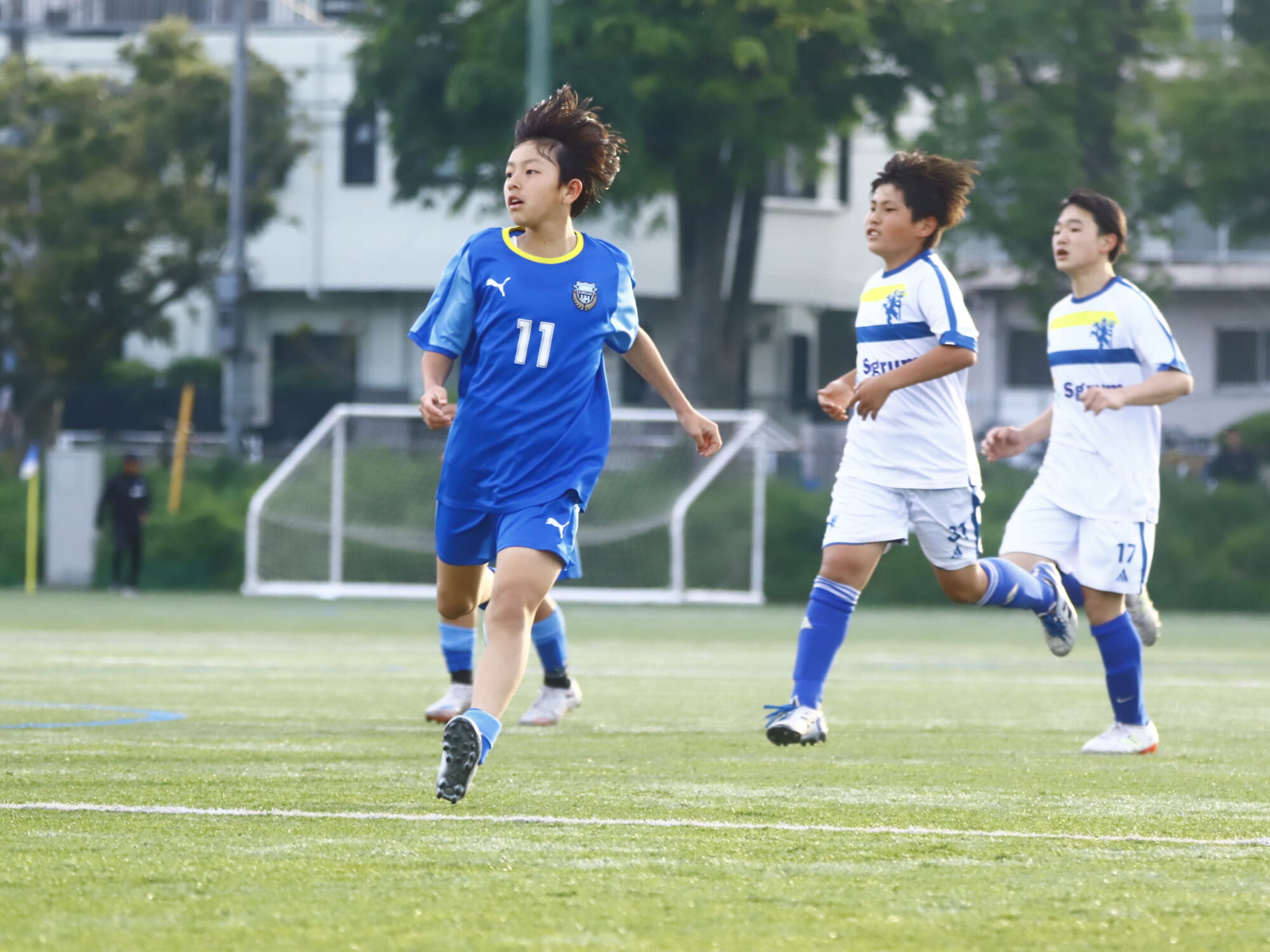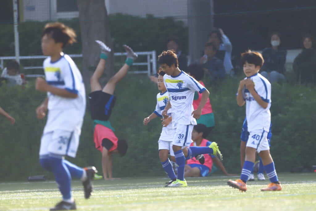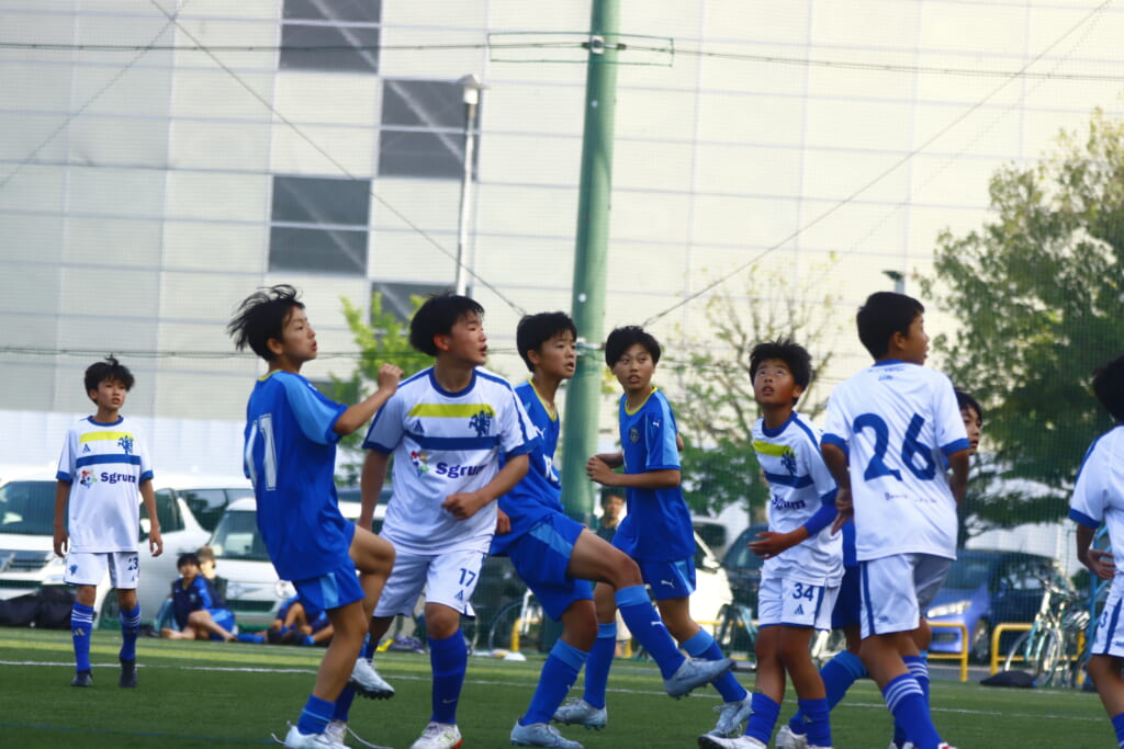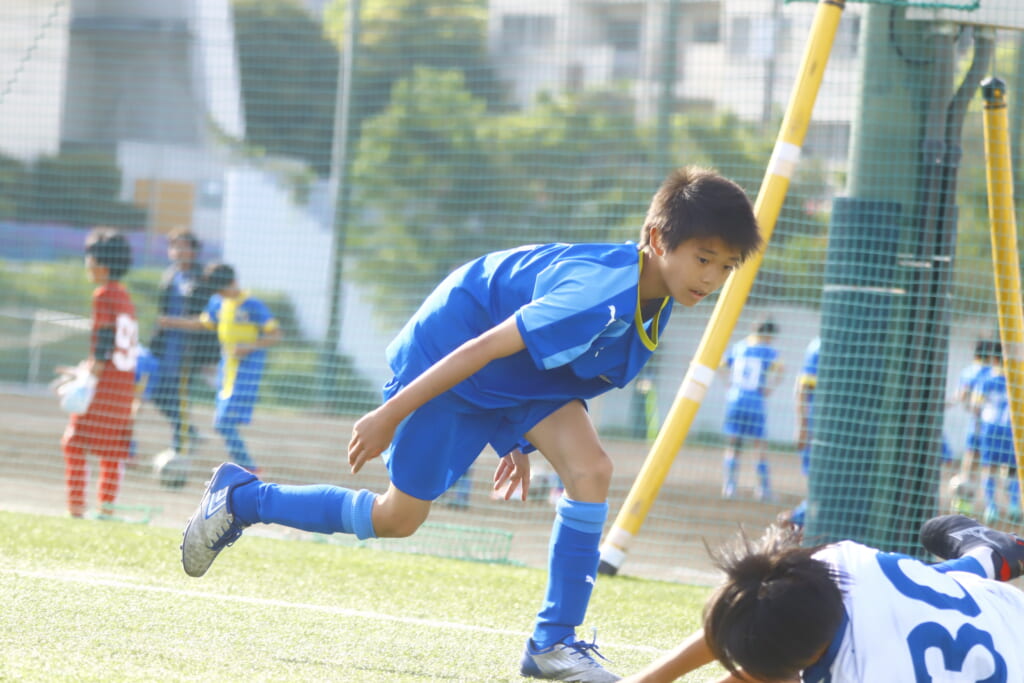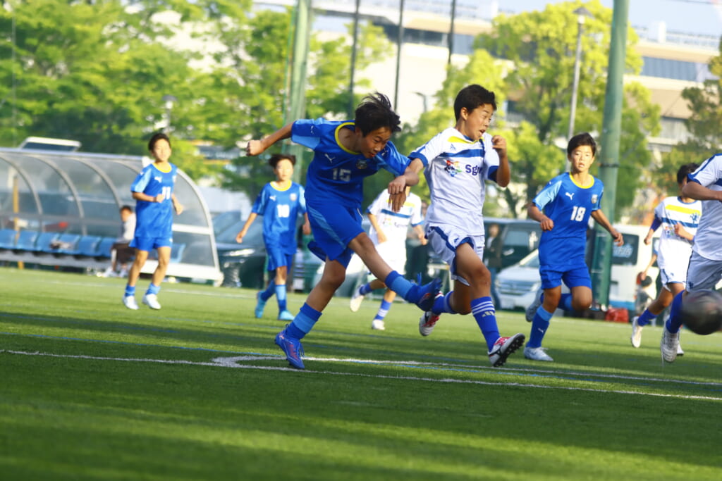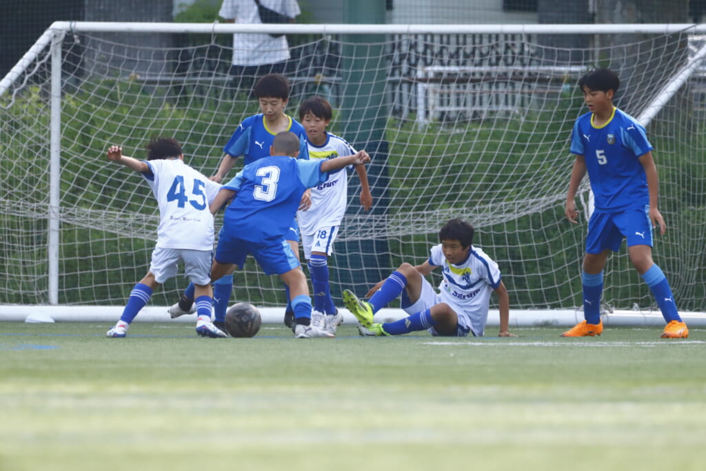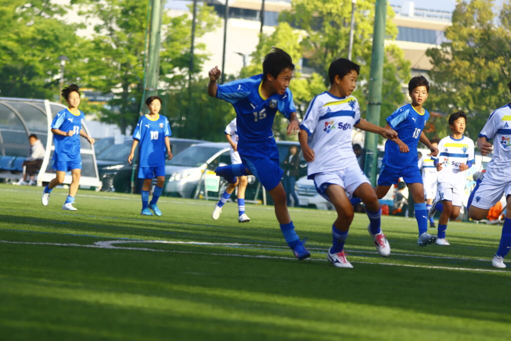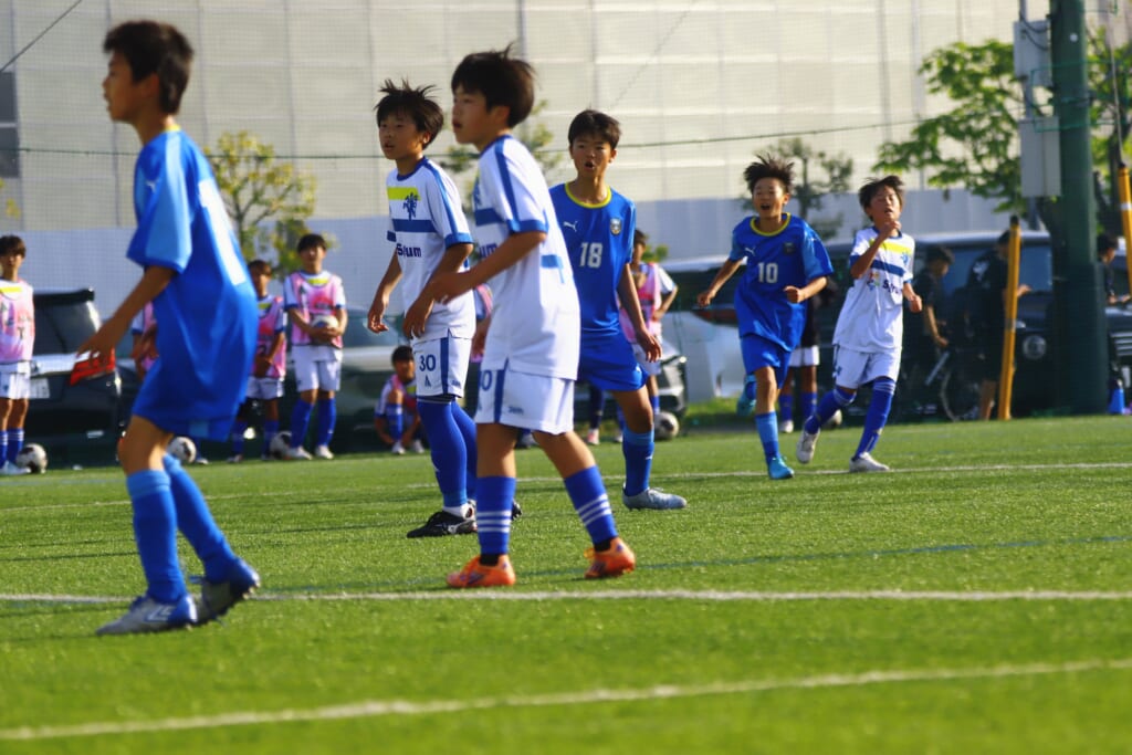 6分にはアスミジュニアユースがカット。左サイド、18が持ち上がったところ、奪い返したフロンターレ等々力。