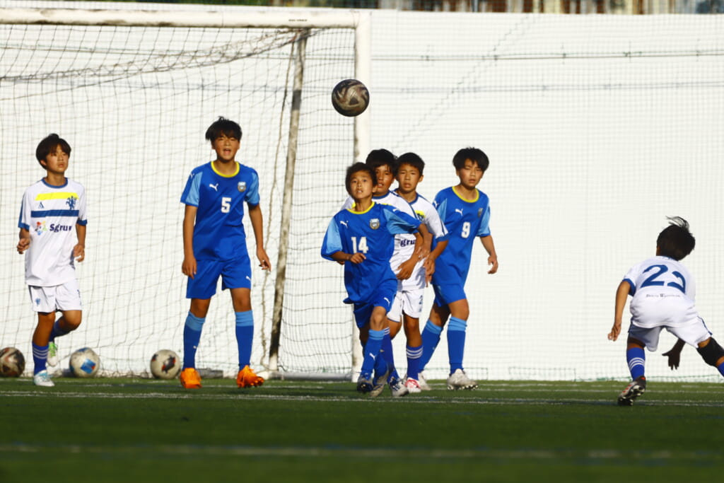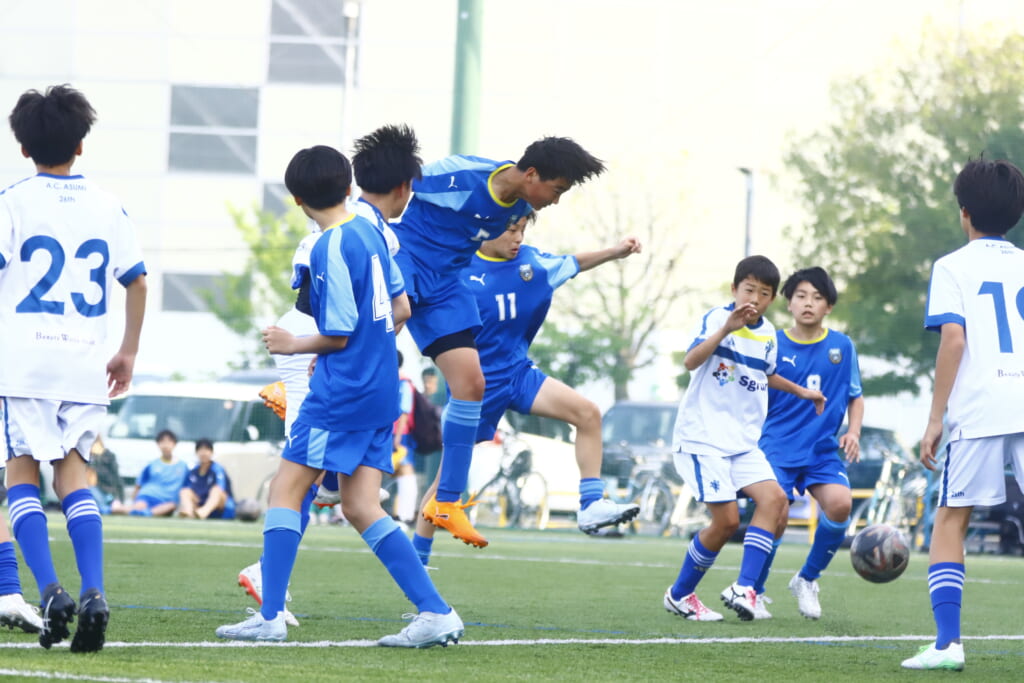 左コーナーキックを得たフロンターレ等々力、横矢が左足で入れると、鈴木がヘディングシュート。しかし、アスミジュニアユースはここでもブロック。