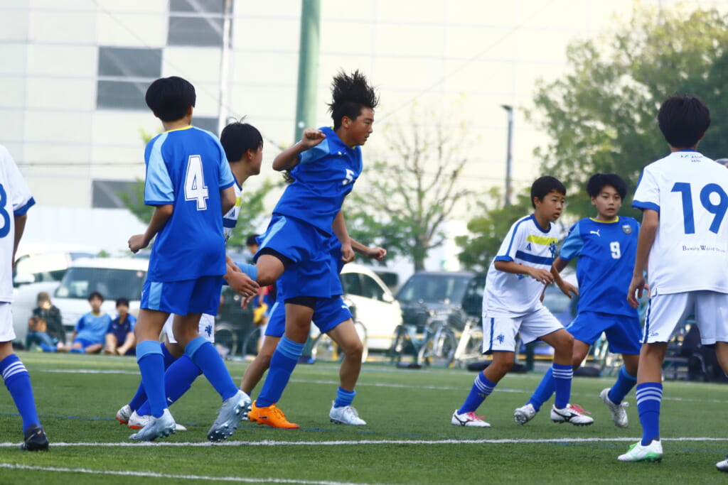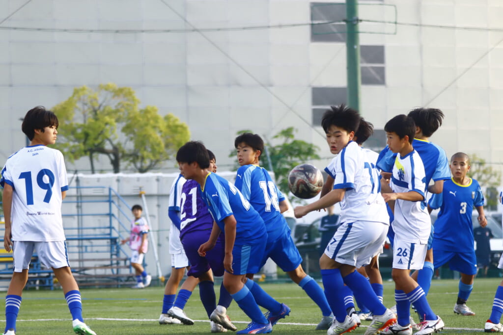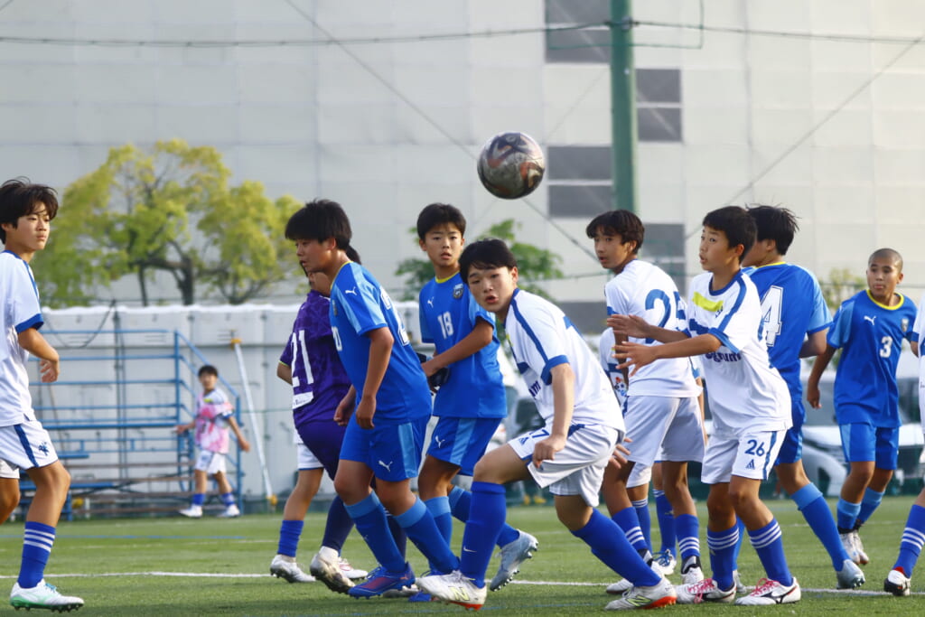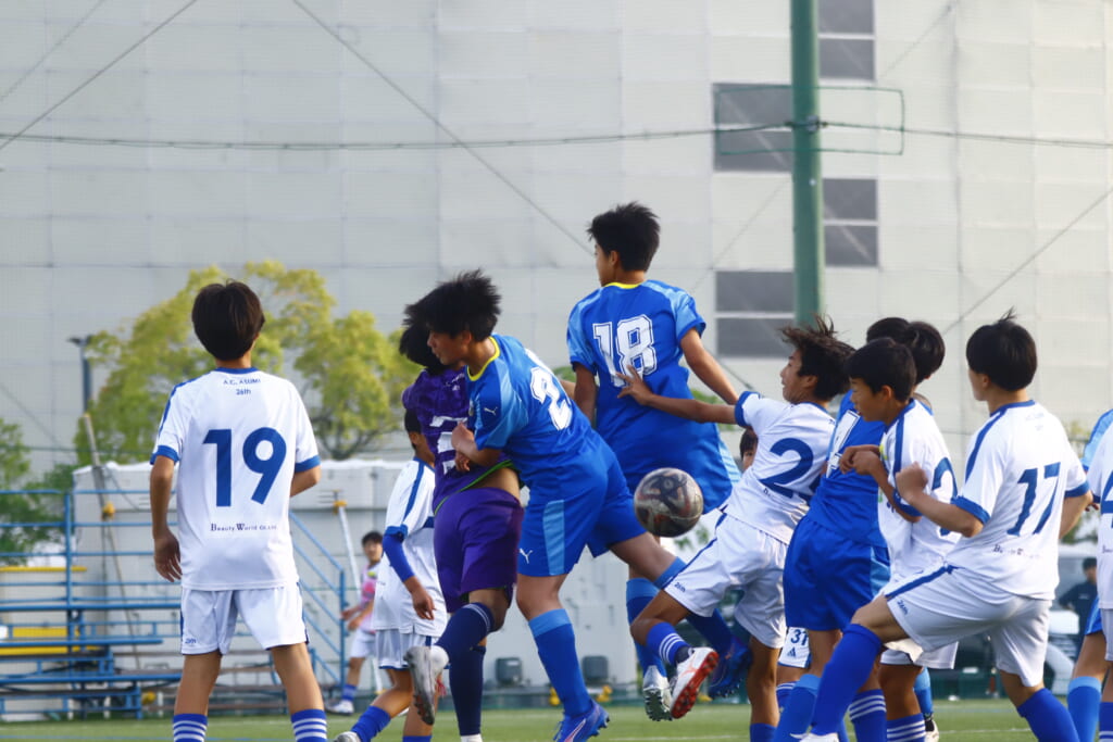 右コーナーキック、岡西が入れるとフロンターレ等々力は佐野が合わせるもアスミジュニアユースはブロック。