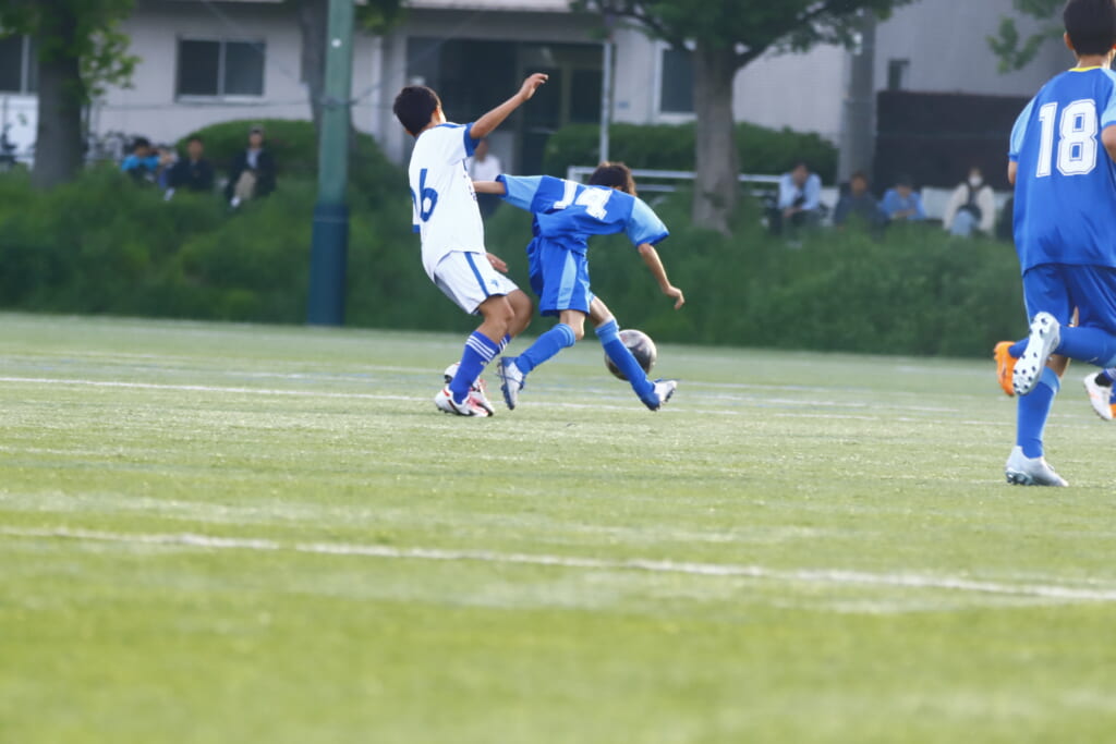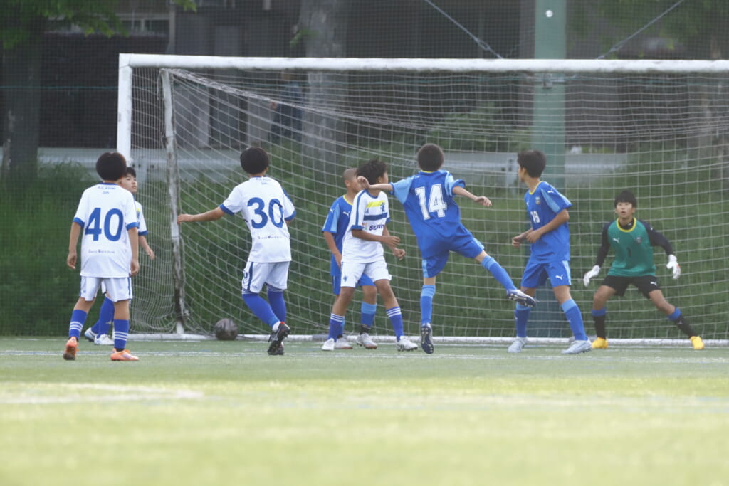 田上から久保田とつながり、エリア前に持ち込んでいくフロンターレ等々力。アスミジュニアユースの対応に遭うも、フロンターレ等々力は高い位置からプレス。再びマイボールにしていきます。